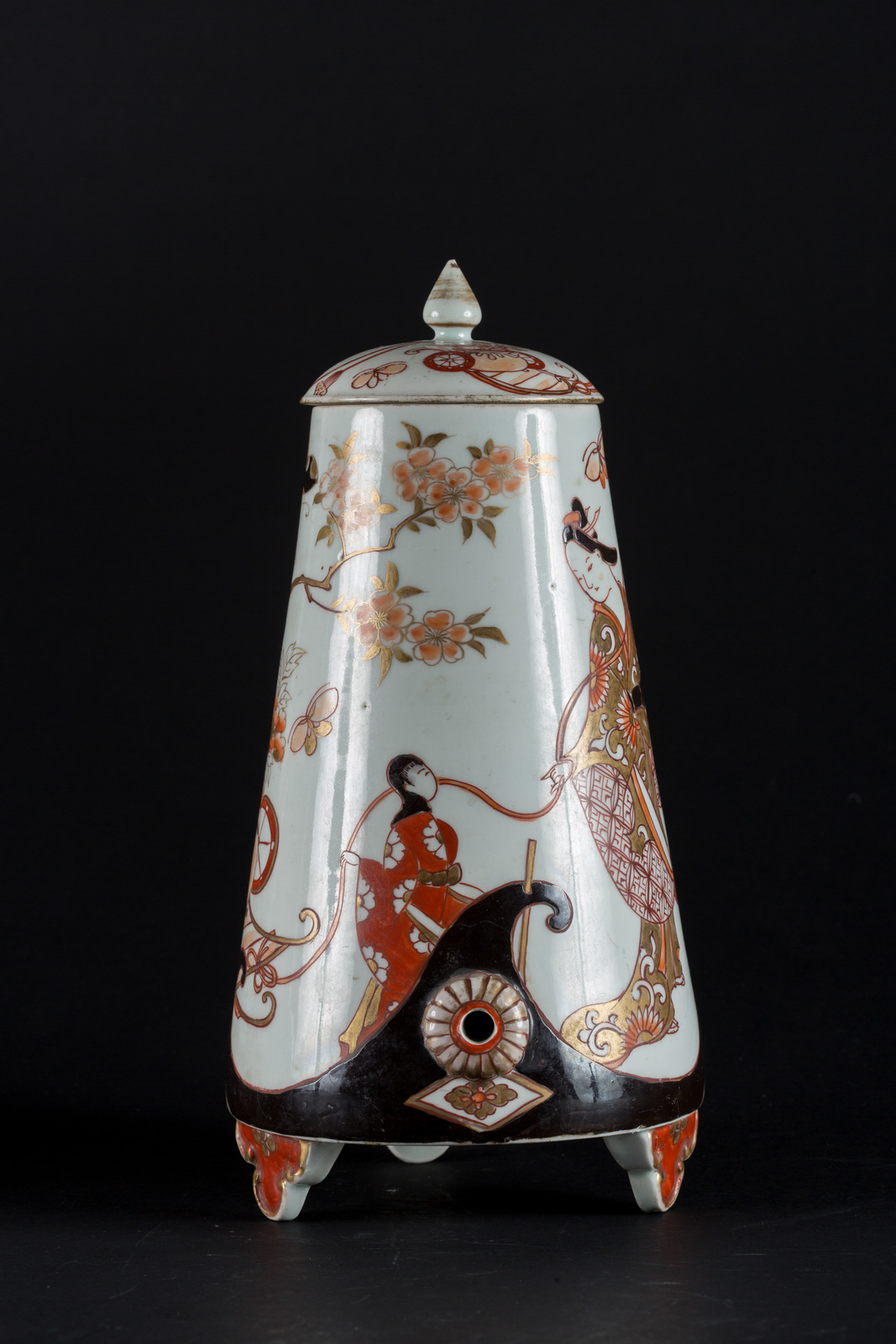 Giappone, XVII - XVIII secolo . -. Cm 31,00. Poggiante su tre piedi sagomati e dipinta con raffigurazione di Geishe tra farfalle.