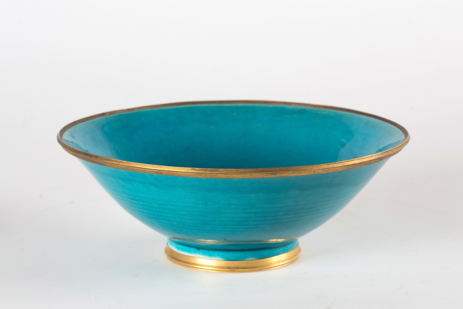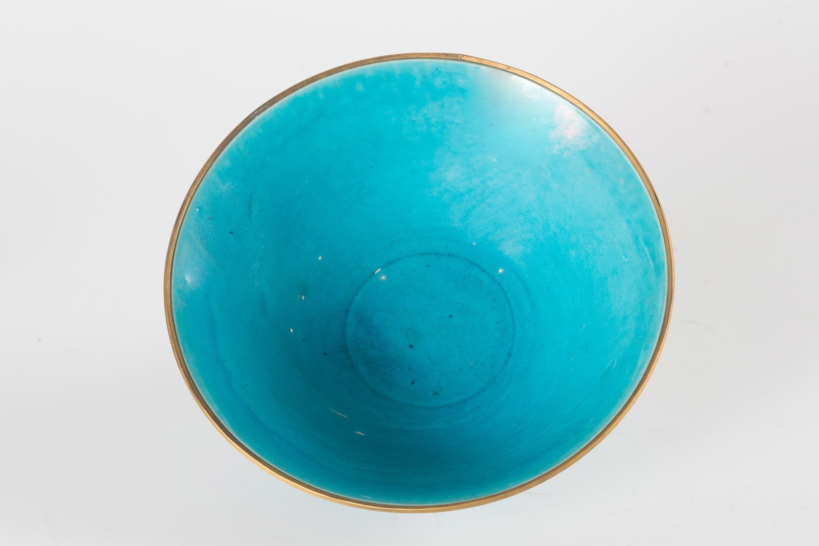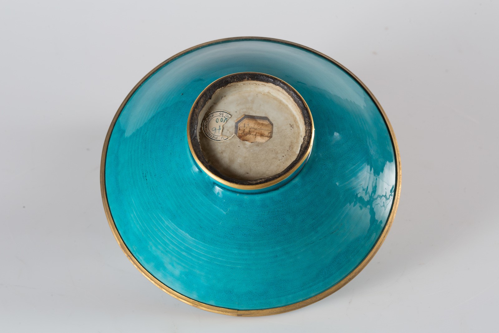Cina, dinastia Qing, periodo Kangxi (1662-1722). -. Cm 22,00 x 8,00. Di forma tronco conica poggiante su disco ed invetriata di turchese. I due bordi mostrano fascia in ottone. Sulla base, incolore, sono presenti due vecchie etichette di una collezione.