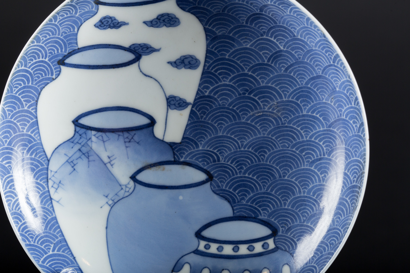 Giappone, XVIII - XIX secolo . -. Cm 15,50 x 3,80. Dipinti in blu sottocoperta con raffigurazione di cinque vasetti su fondo di onde stilizzate.