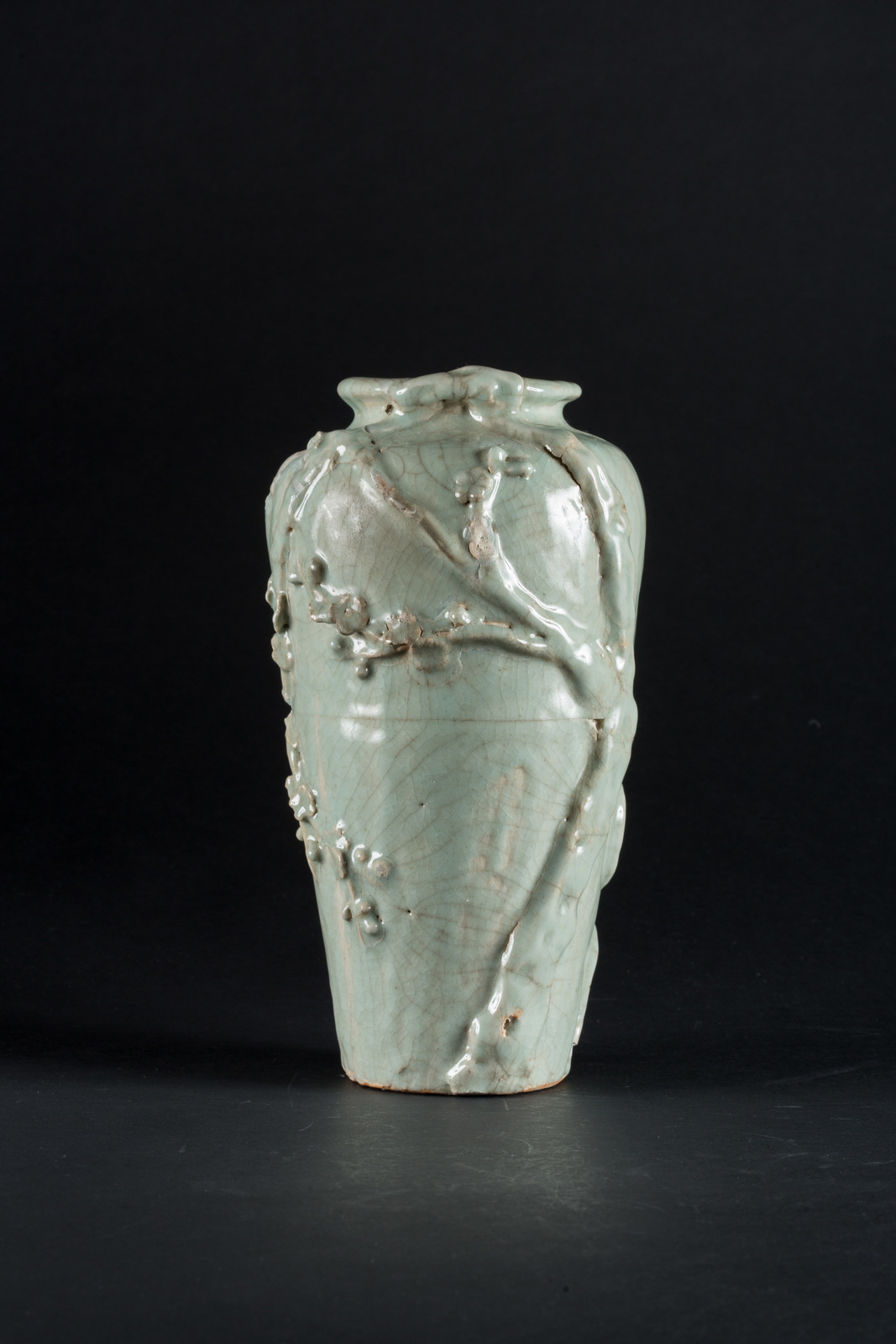 Arte Cinese A celadon earthenware vase moulded with blossoming trees and covered with turquoise glaze China, Yuan or Ming dynasty. . Cm 28,00.
