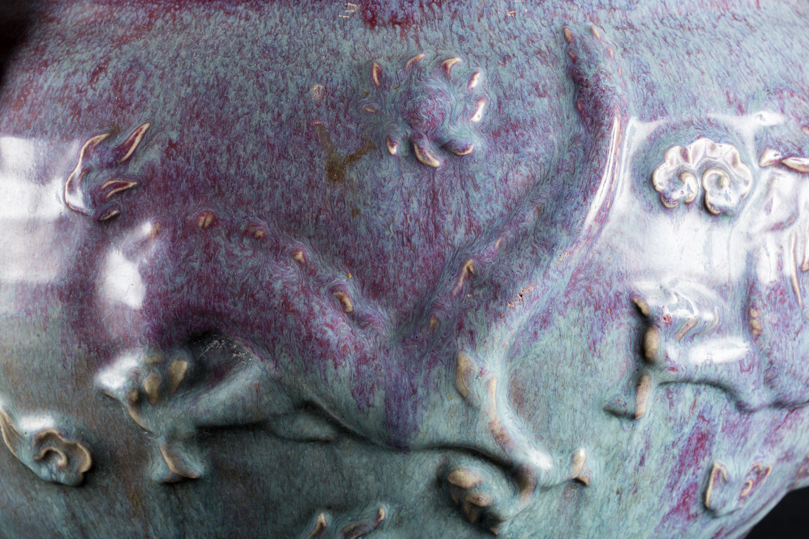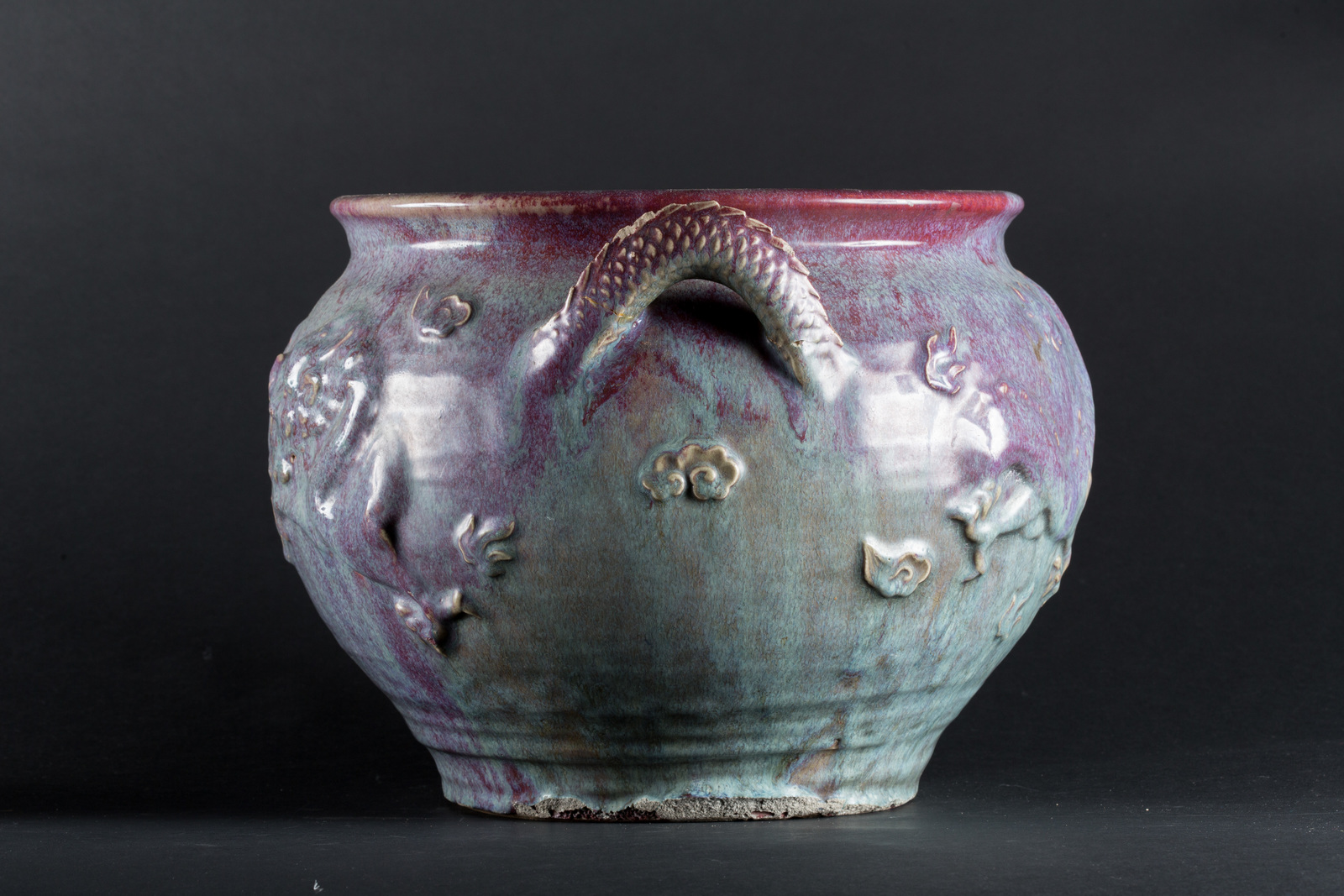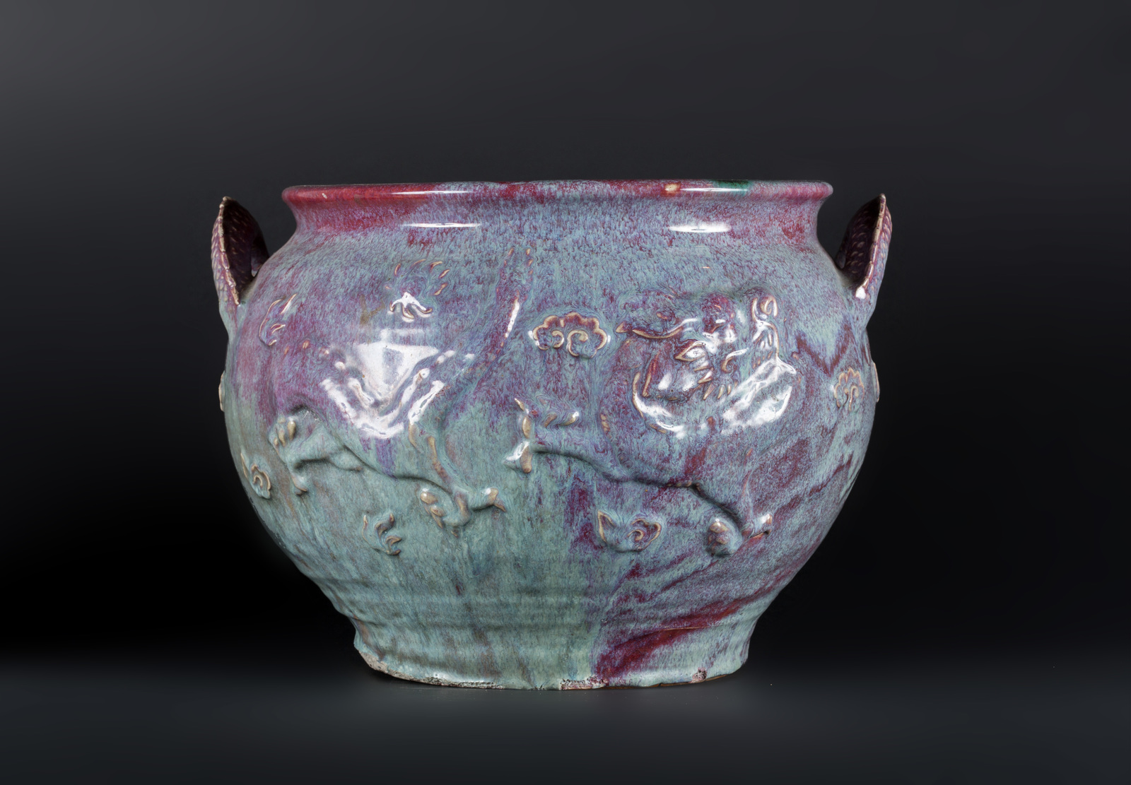 Cina, dinastia Qing, XIX secolo . -. Cm 41,00 x 30,50. Grande vaso con caratteristica invetriatura color lavanda che in certi punti su fonde con un rosso amarena.