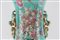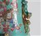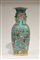 . -. Cm 21,50 x 61,00. Grande vaso a balaustro inciso e smaltato con riserve floreali sul fondo giallo nei margini superiori ed inferiori e il corpo decorato con cavalieri in frenetica attività su invetriatura turchese. I manici e l'attaccatura del collo sono sottolineati chilong dorati in rilievo.