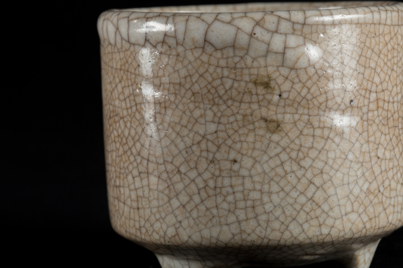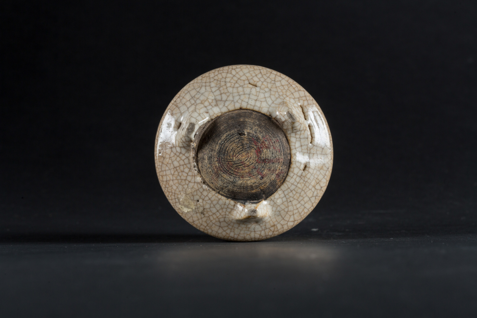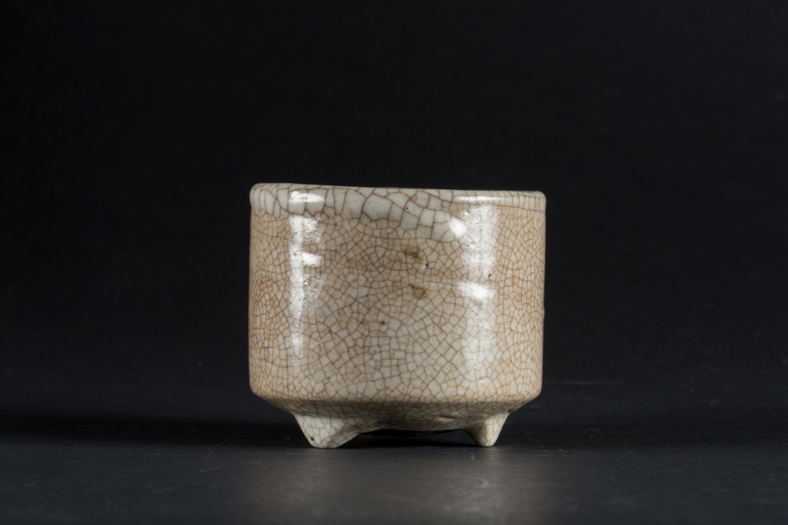 Cina, dinastia Ming. -. Cm 9,50 x 8,30. A sezione circolare, il corpo ricoperto di invetriatura beige caratterizzata da una rete di craquelé.