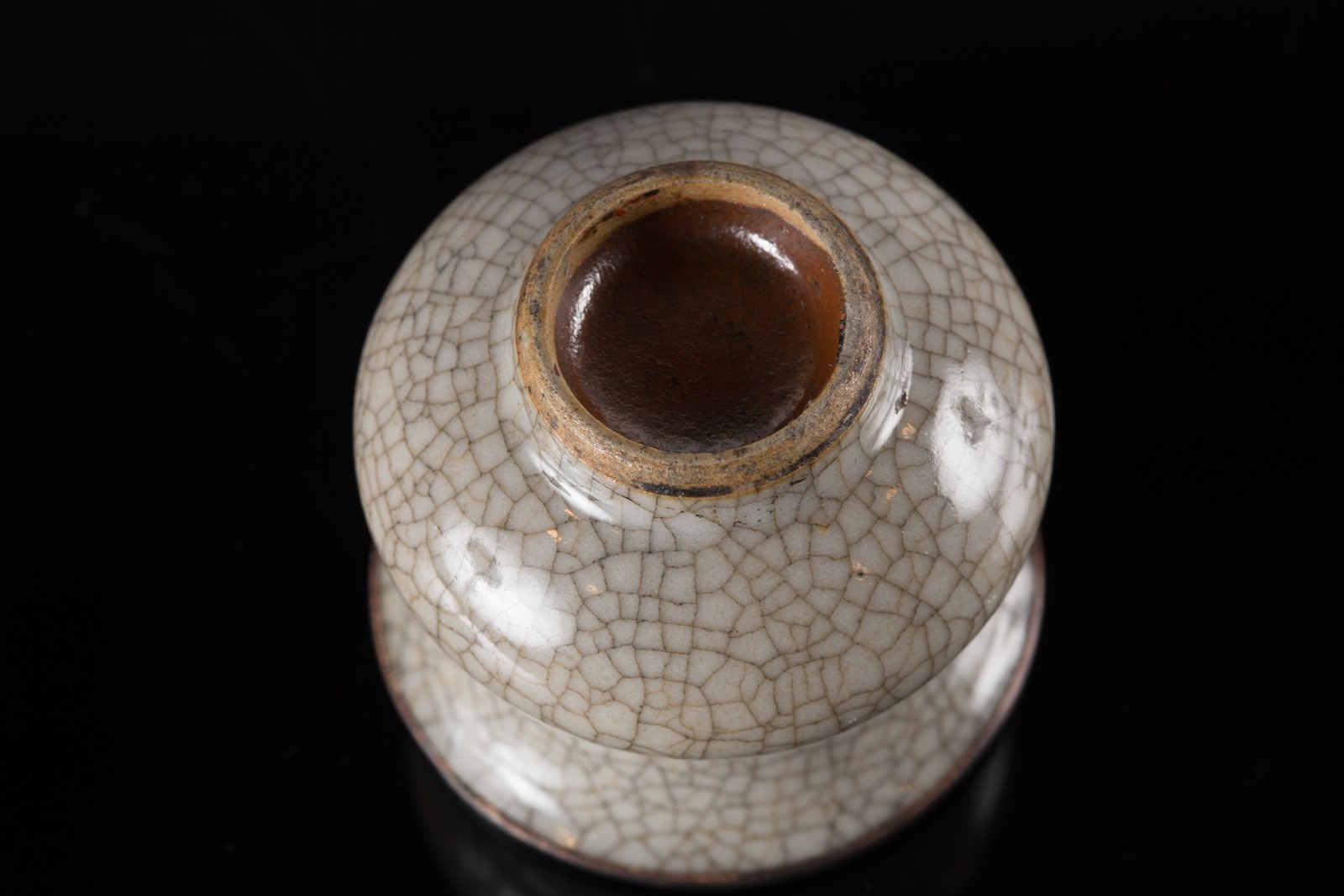 Cina, dinastia Ming . -. Cm 6,00 x 6,00. Poggiante su disco, con pancia schiacciata e bordo estroflesso rifinito con anello in metallo.