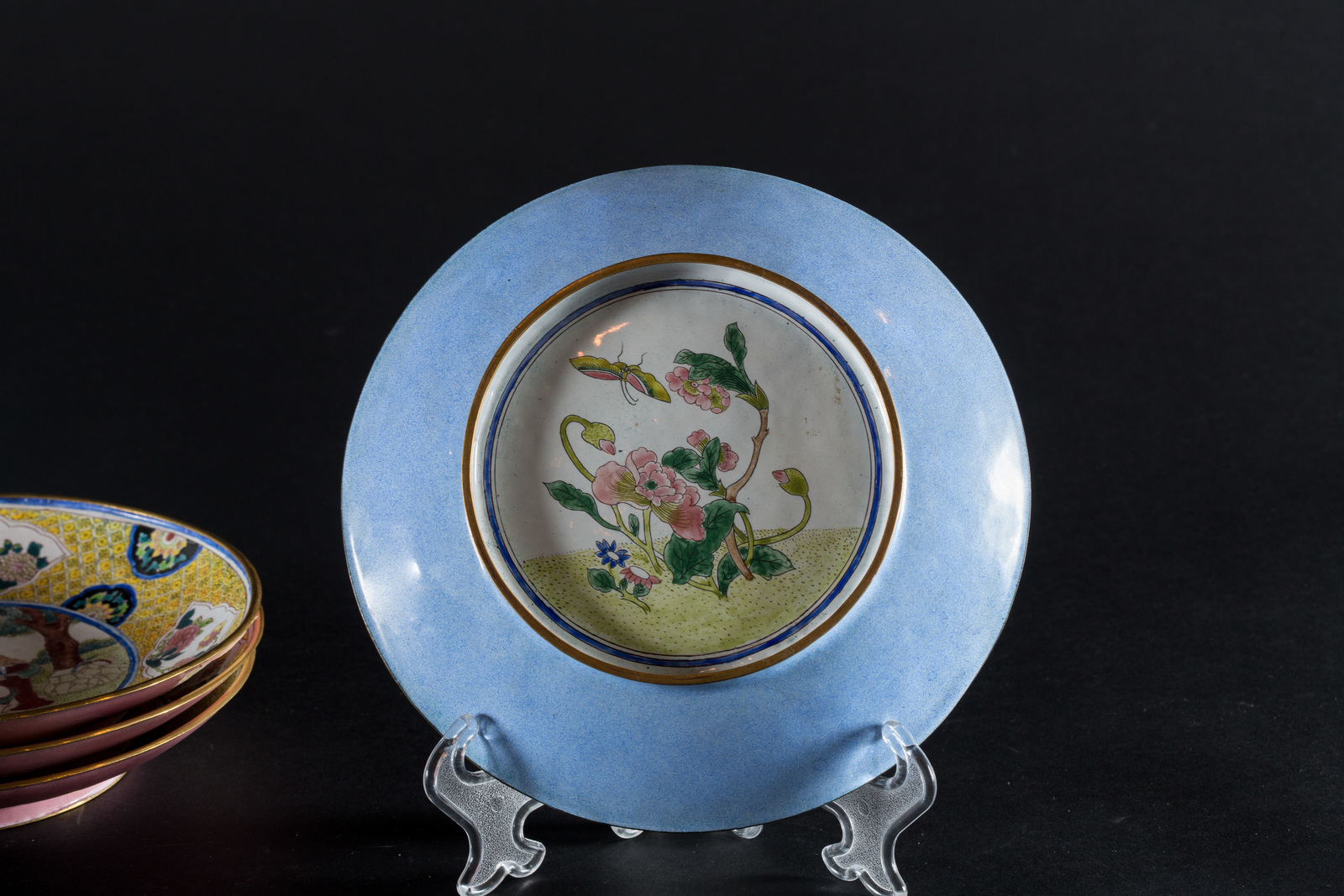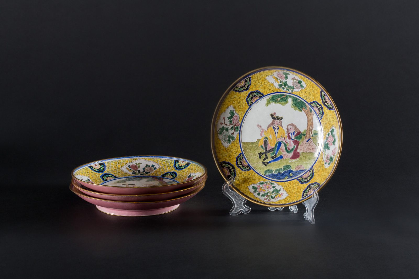 Arte Cinese Set of four copper enamel dishes decorated with Europaen subject