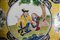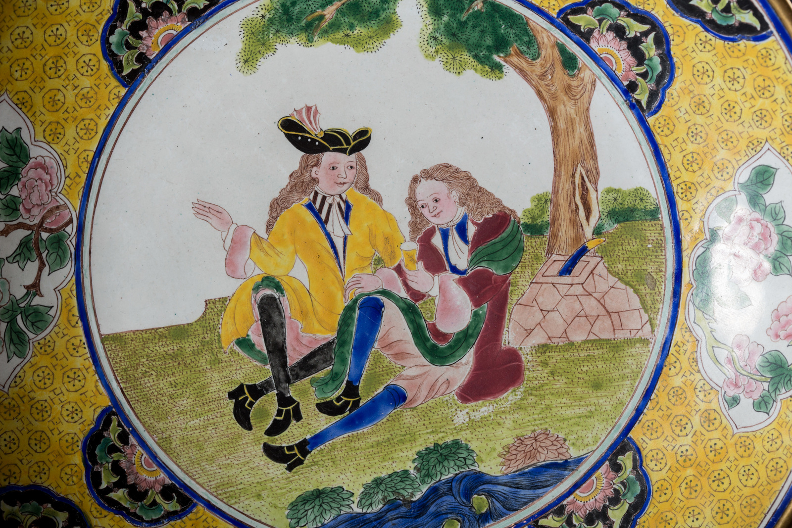 Cina, dinastia Qing, periodo Yongzheng o Qianlong, XVIII secolo . . Cm 21,50 x 3,50. Nel tondo centrale due uomini in abiti europei in un prato; nel cavetto riserve lobate contenenti fiori su fondo giallo; il cavetto esterno smaltato di rosa e la base contenente dei fiori ed una farfalla.