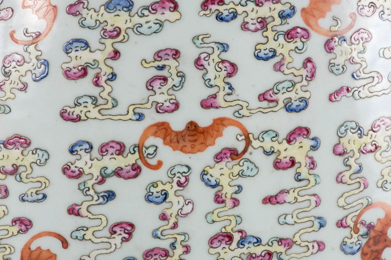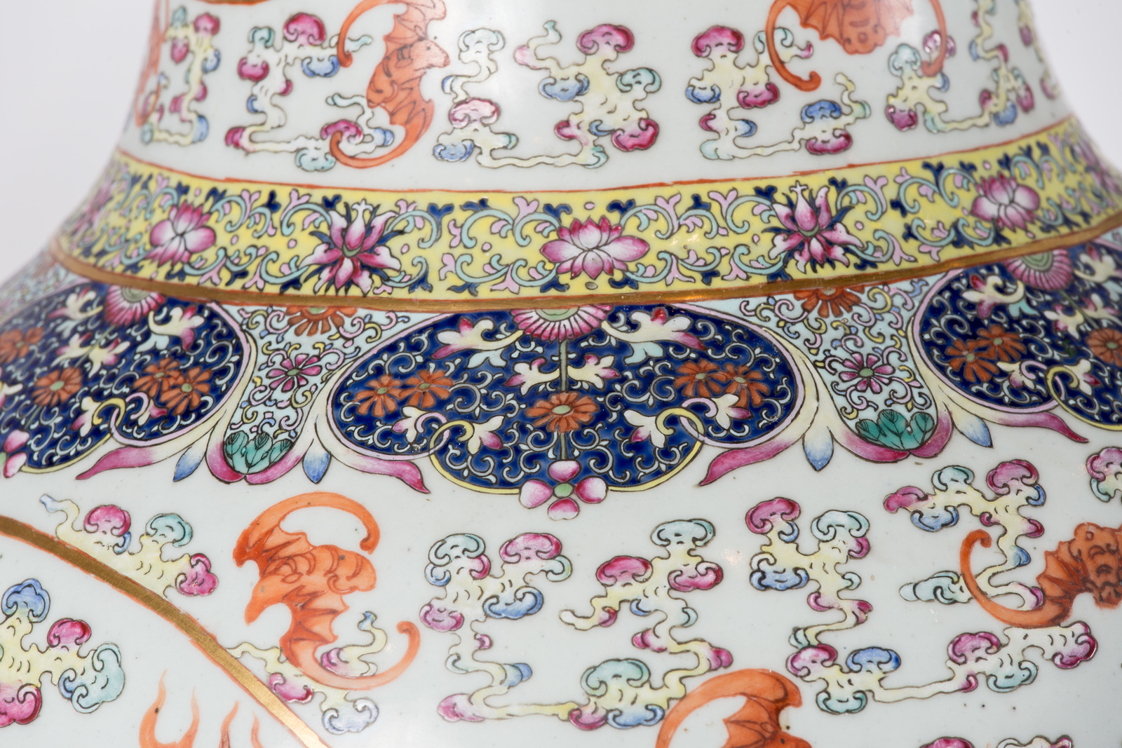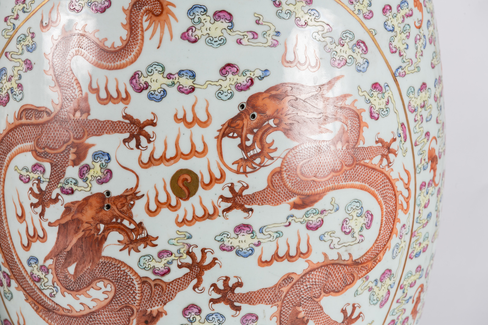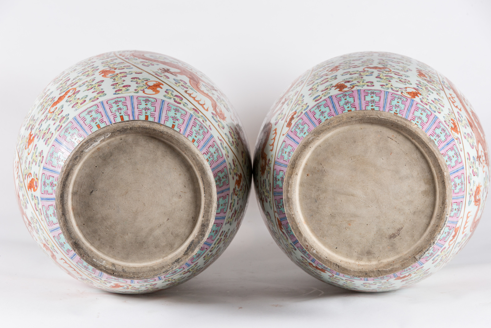 China, Qing dynasty, Guangxu period, late 19th century . . Cm 36,00 x 82,00. Pair of big baluster shaped vases in bright colors, with mythic animals painted in round reserves, with multicolored clouds, symbols of good fortune, like bats, on the colorless background.