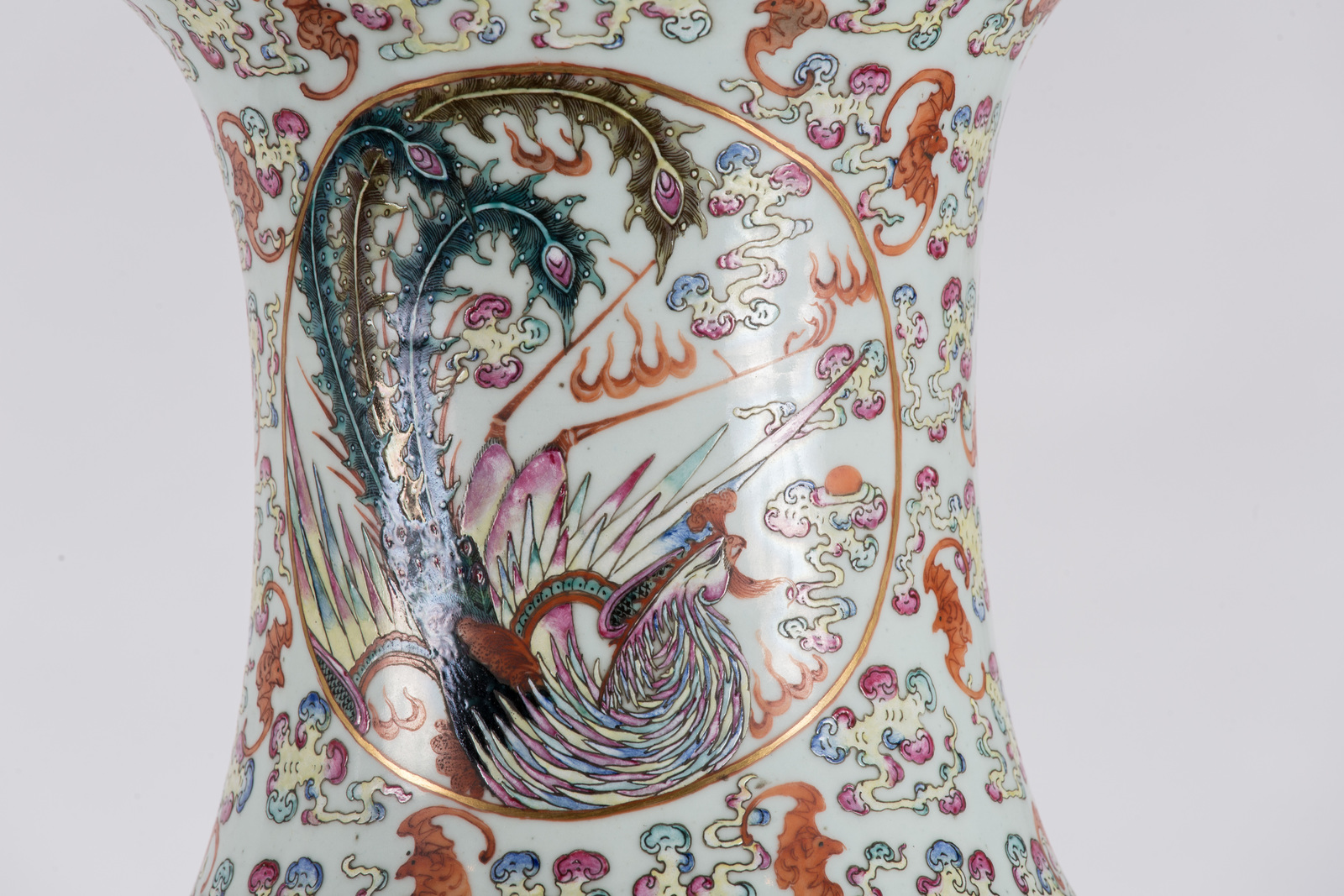 Cina, dinastia Qing, periodo Guangxu, fine XIX secolo . -. Cm 36,00 x 82,00. Coppia di imponenti vasi a balaustro smaltati con colori vivaci raffiguranti animali mitologici entro riserve circolari e nuvole variopinte e simboli del buon auspicio, quali pipistrelli, sullo sfondo incolore.