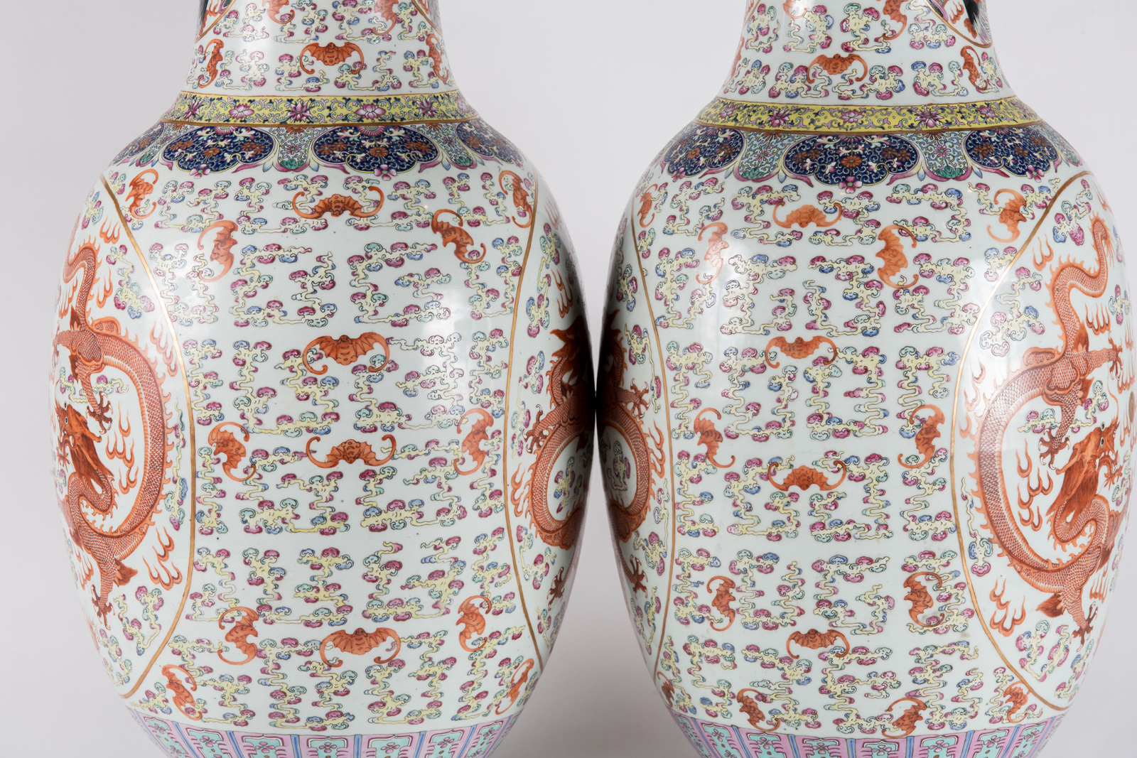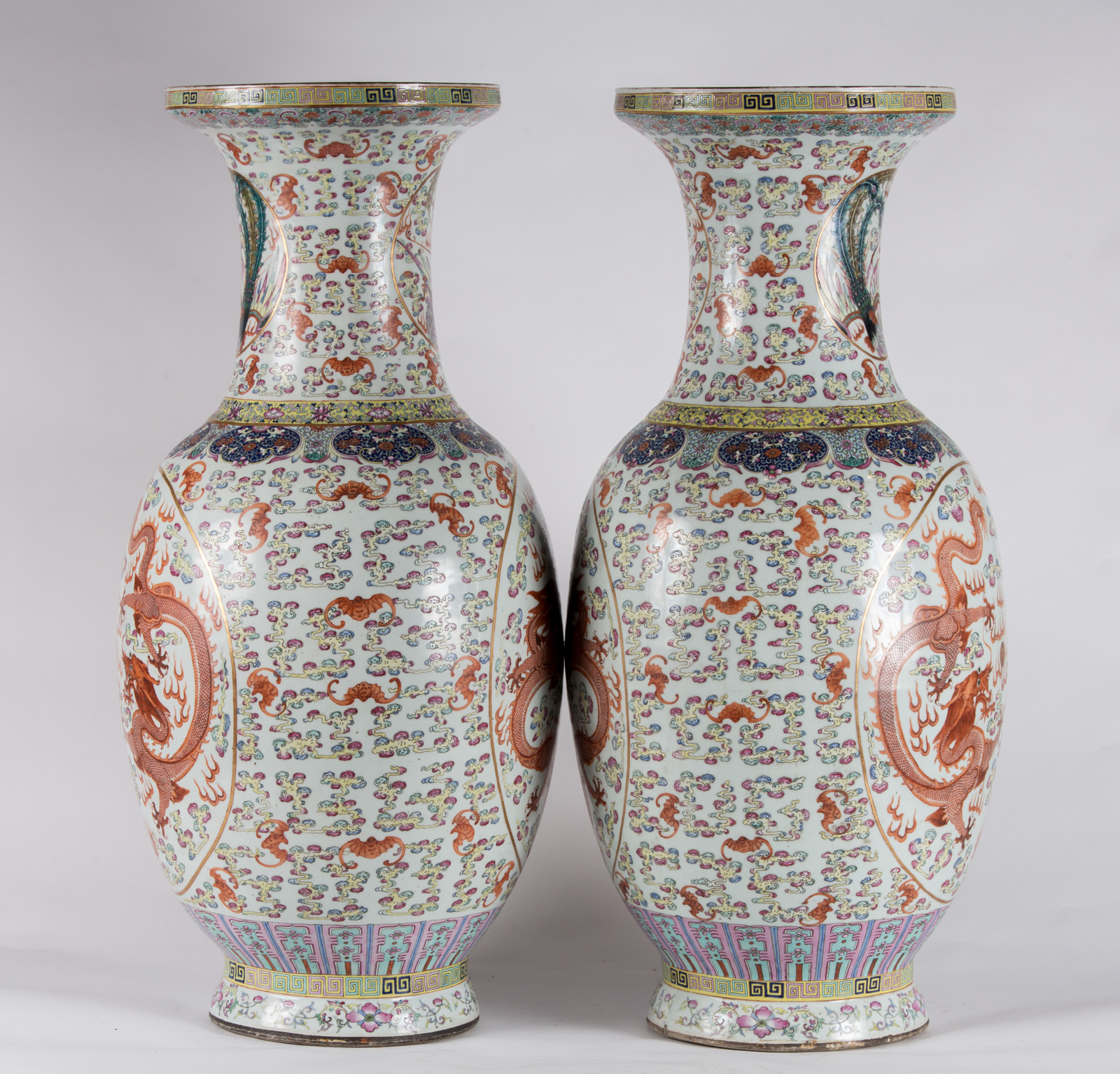 Arte Cinese A pair of massive porcelain vases enamelled with dragons chasing the flaming pearl and phoenixes in clouds