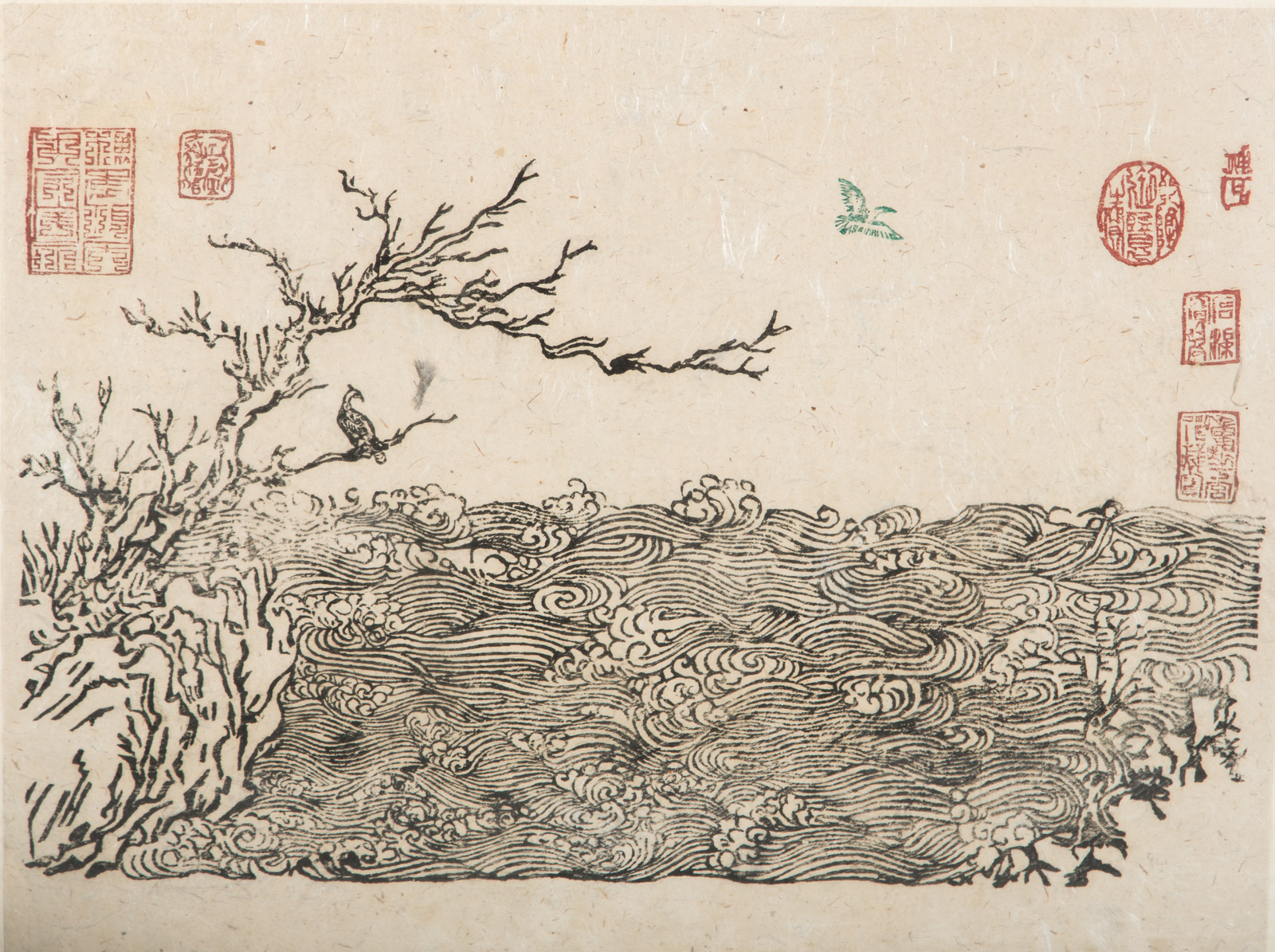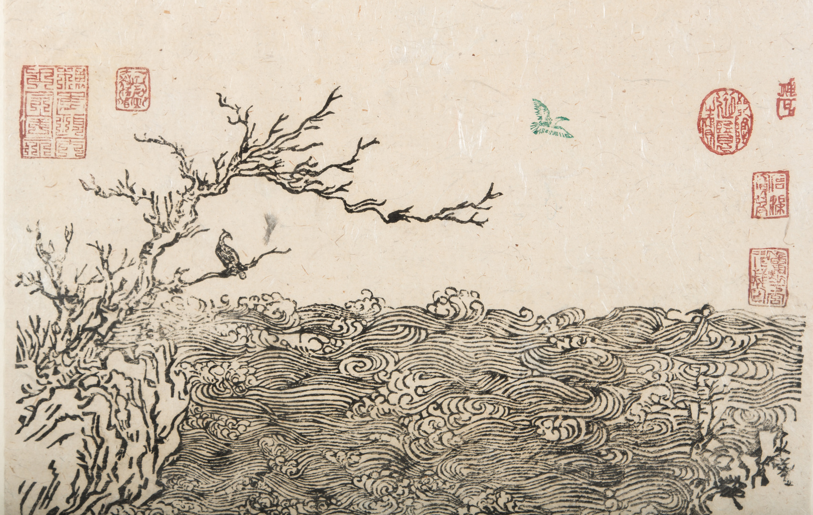 Arte Cinese Stampa su carta raffigurante rocce e uccelli sull'oceano Cina,...