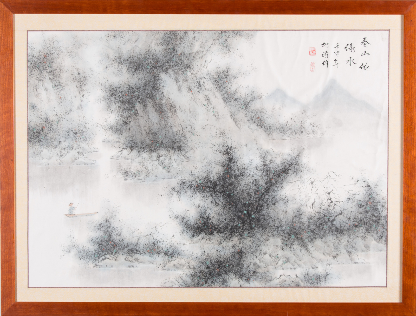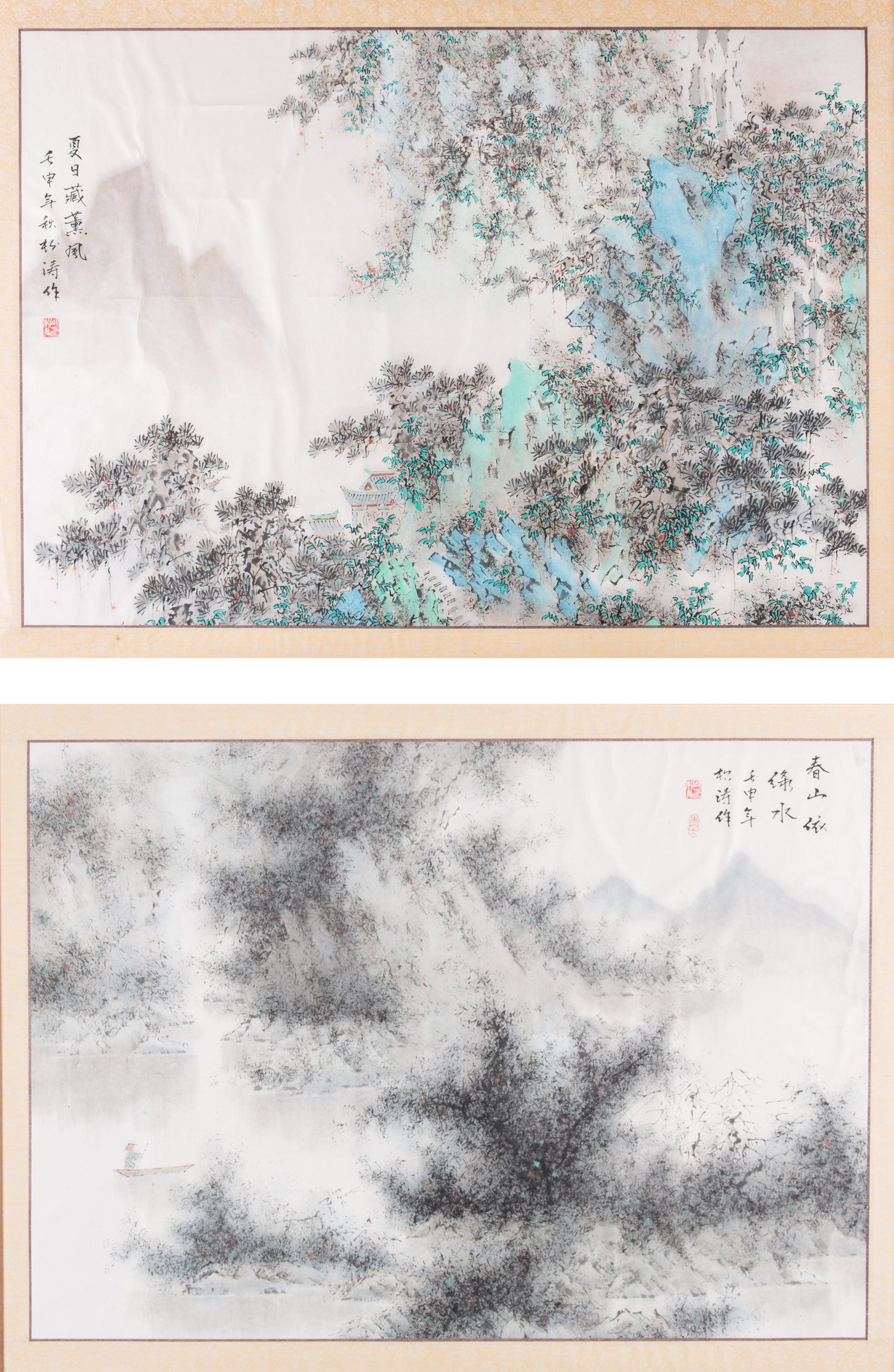 Cina, XX secolo . -. Cm 87,00 x 65,50. Dipinti nello stile shanshui (maontagna e acqua) rappresentano paesaggi fluviali con fitta vegetazione.