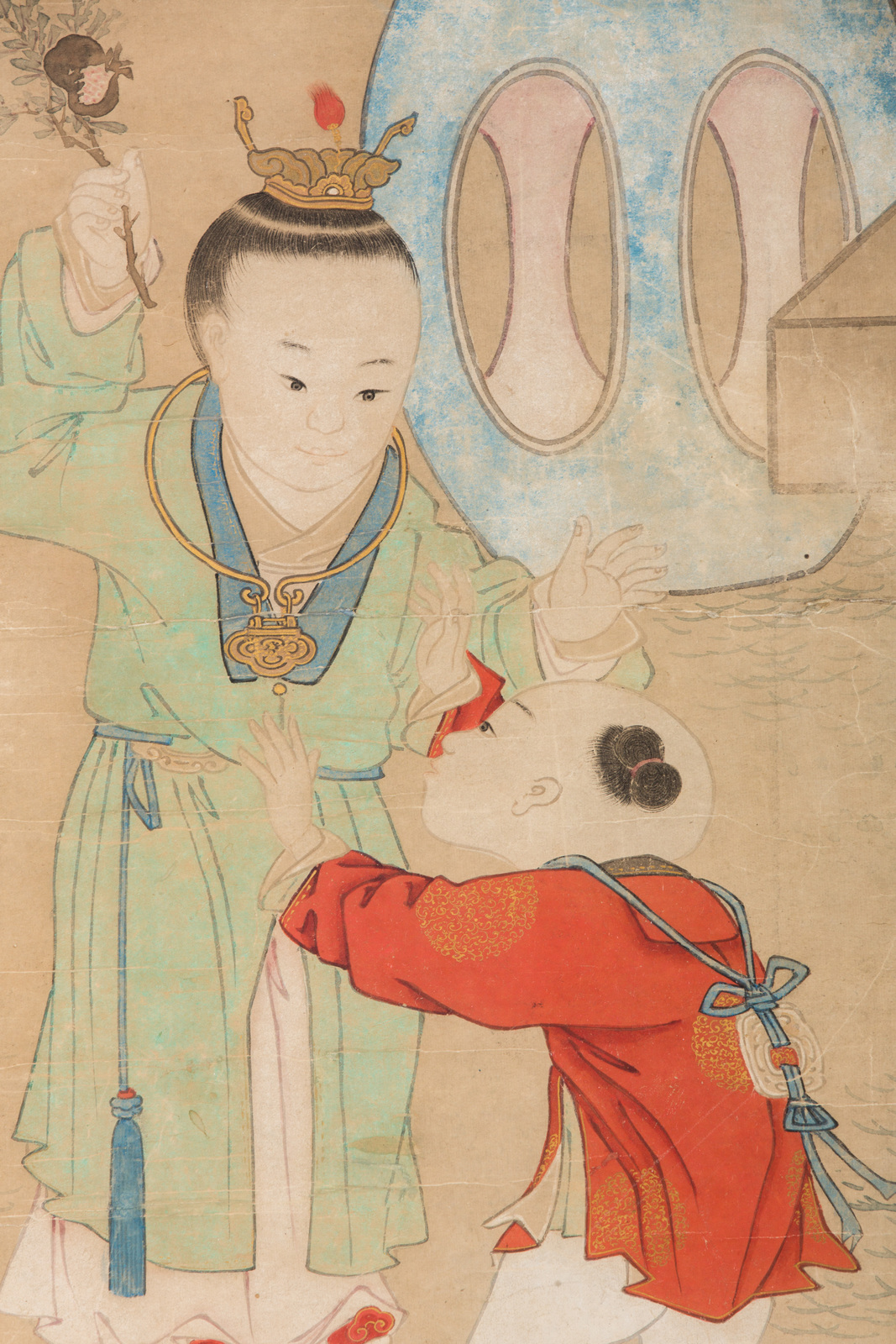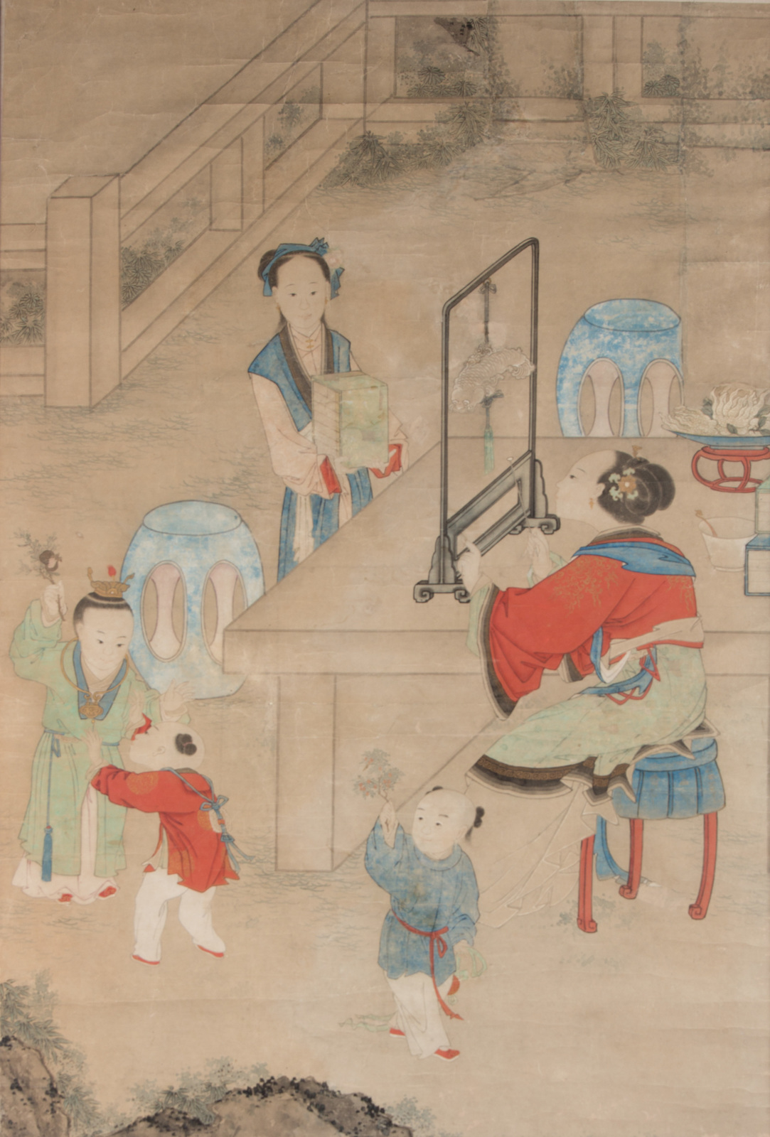 Cina, dinastia Qing, XVIII - XIX secolo . -. Cm 78,50 x 113,00. La scena è ambientata in un esterno in cui, attorno ad un tavolo, ci sono delle donne al lavoro, mentre a lato tre bambini sono intenti a giocare tra di loro. La scena si caratterizza per i colori accesi degli abiti e delle sedute del tavolo.