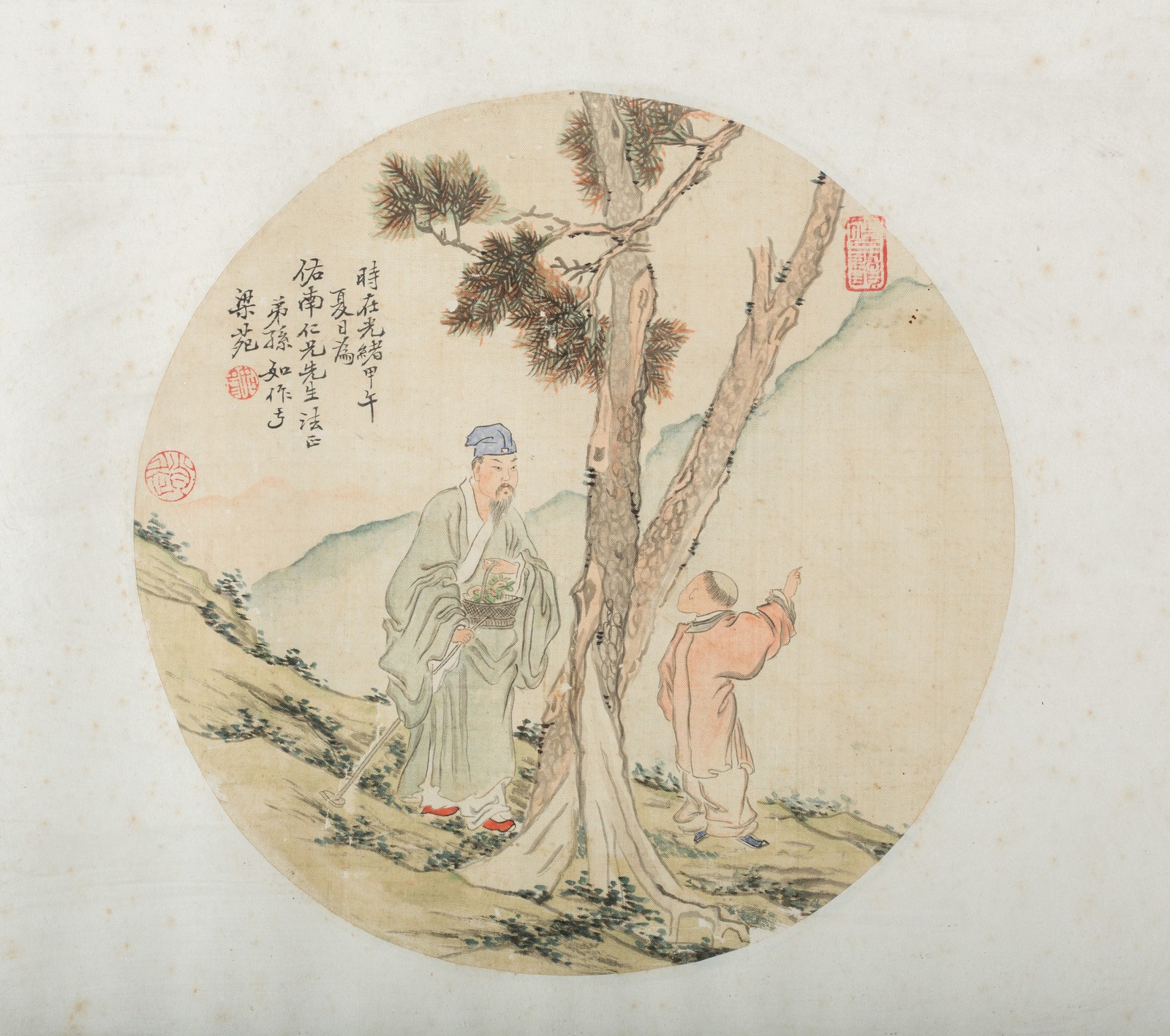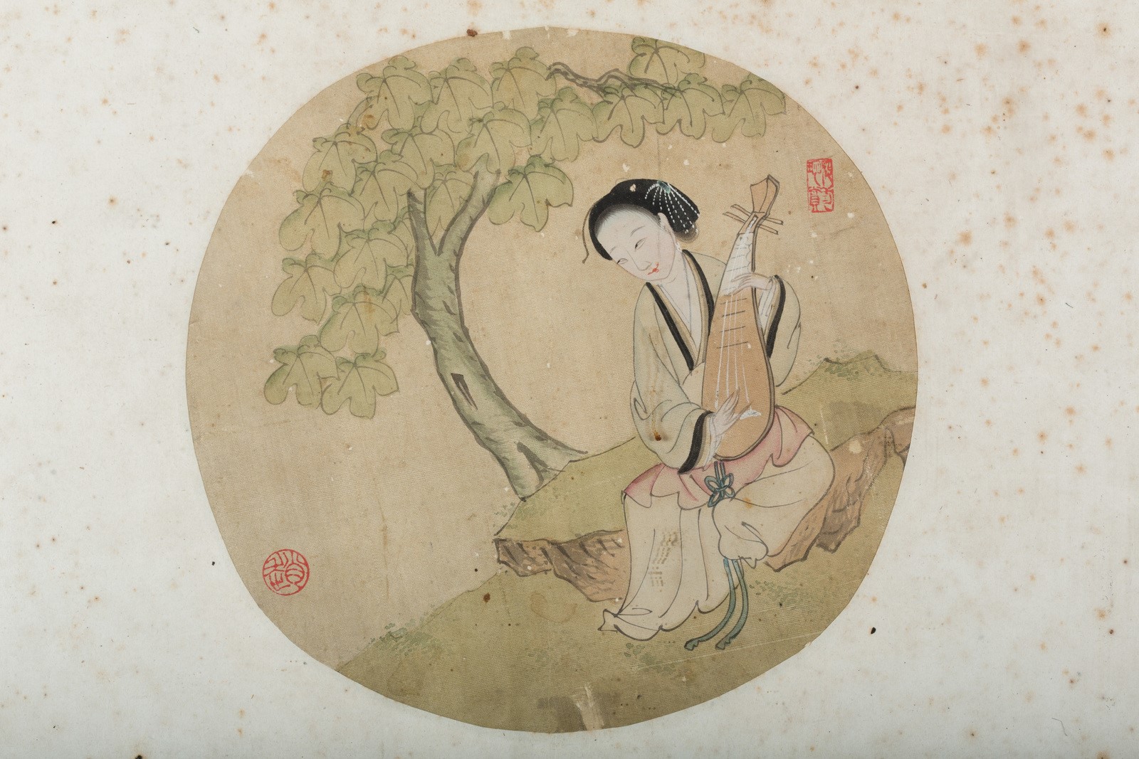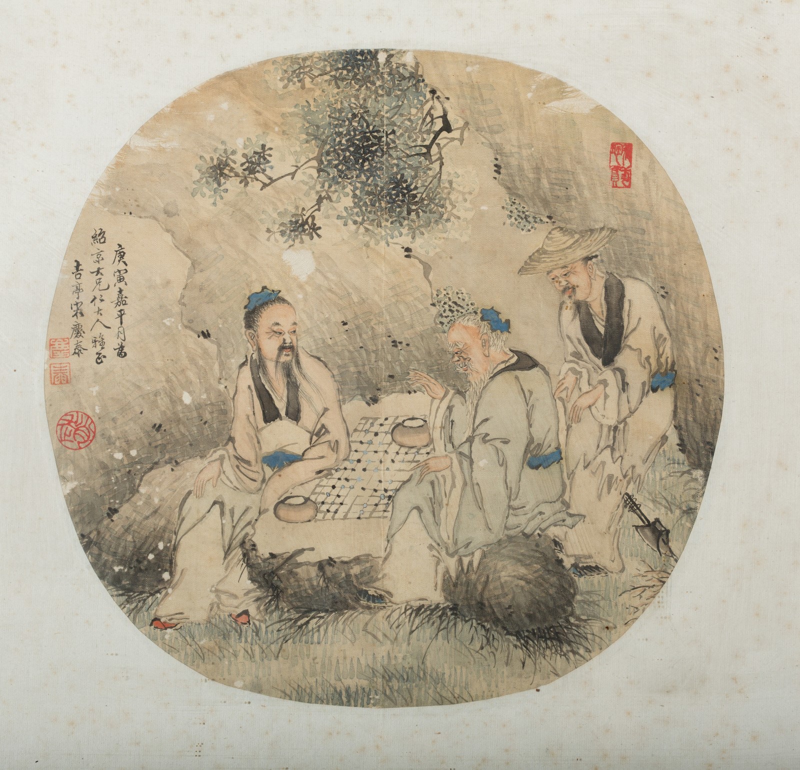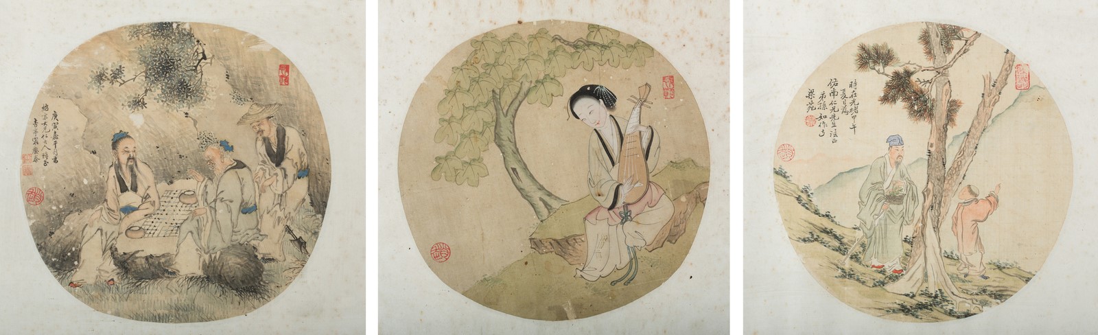 Arte Cinese Three round paintings on silk depicting characters in landscape