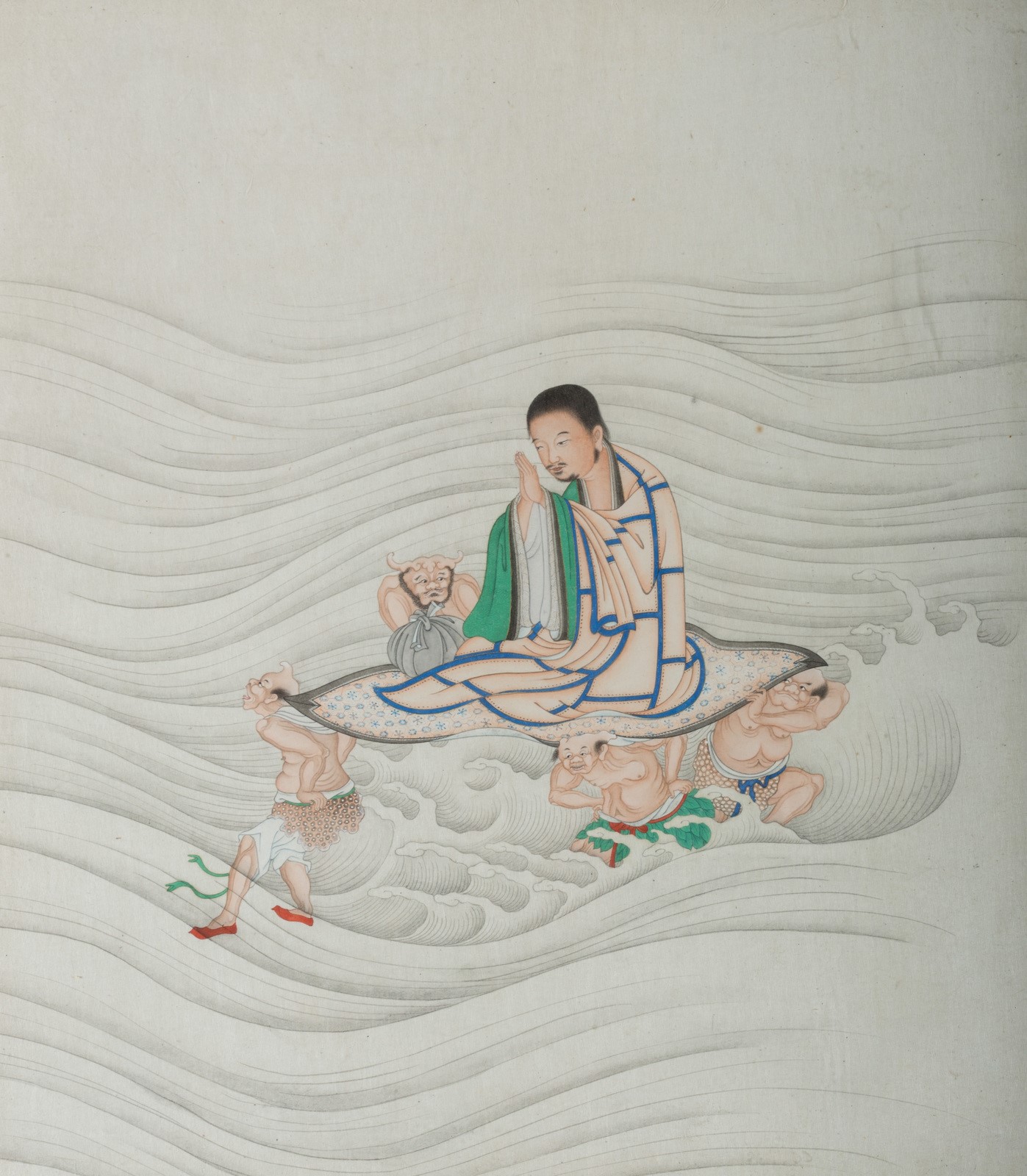 Cina, dinastia Qing, XIX secolo . -. Cm 33,50 x 40,30. I personaggi sono raffiguranti sospesi su nuvole con attendenti mitologici che sostengono o spostano il loro sostegno.