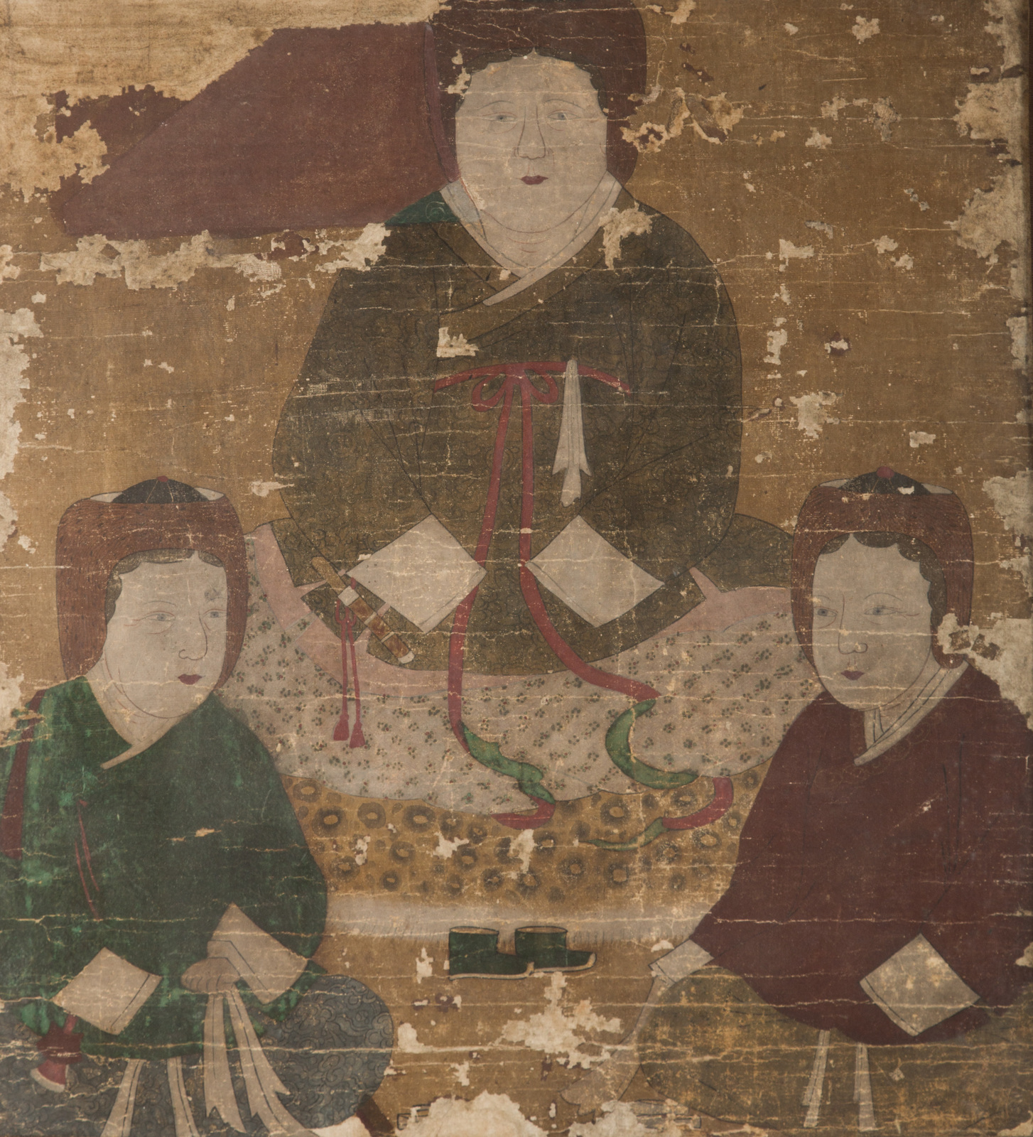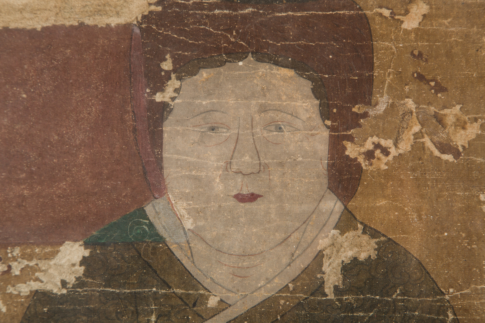 Arte Cinese Dipinto su seta raffigurante una donna con attendenti Cina, forse dinastia Tang. -. Cm 56,00 x 62,00. L'opera rappresenta al centro una donna abbigliata con ricche vesti e, sotto di lei, due attendenti vestiti con toni contrastanti. Consunzioni entro cornice: 76 X 69 cm