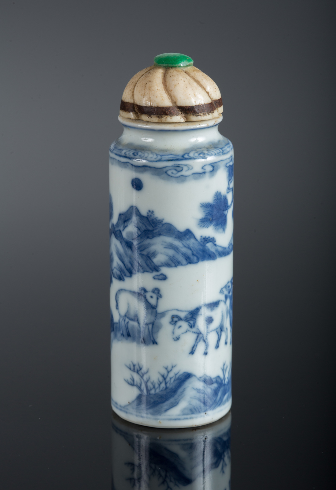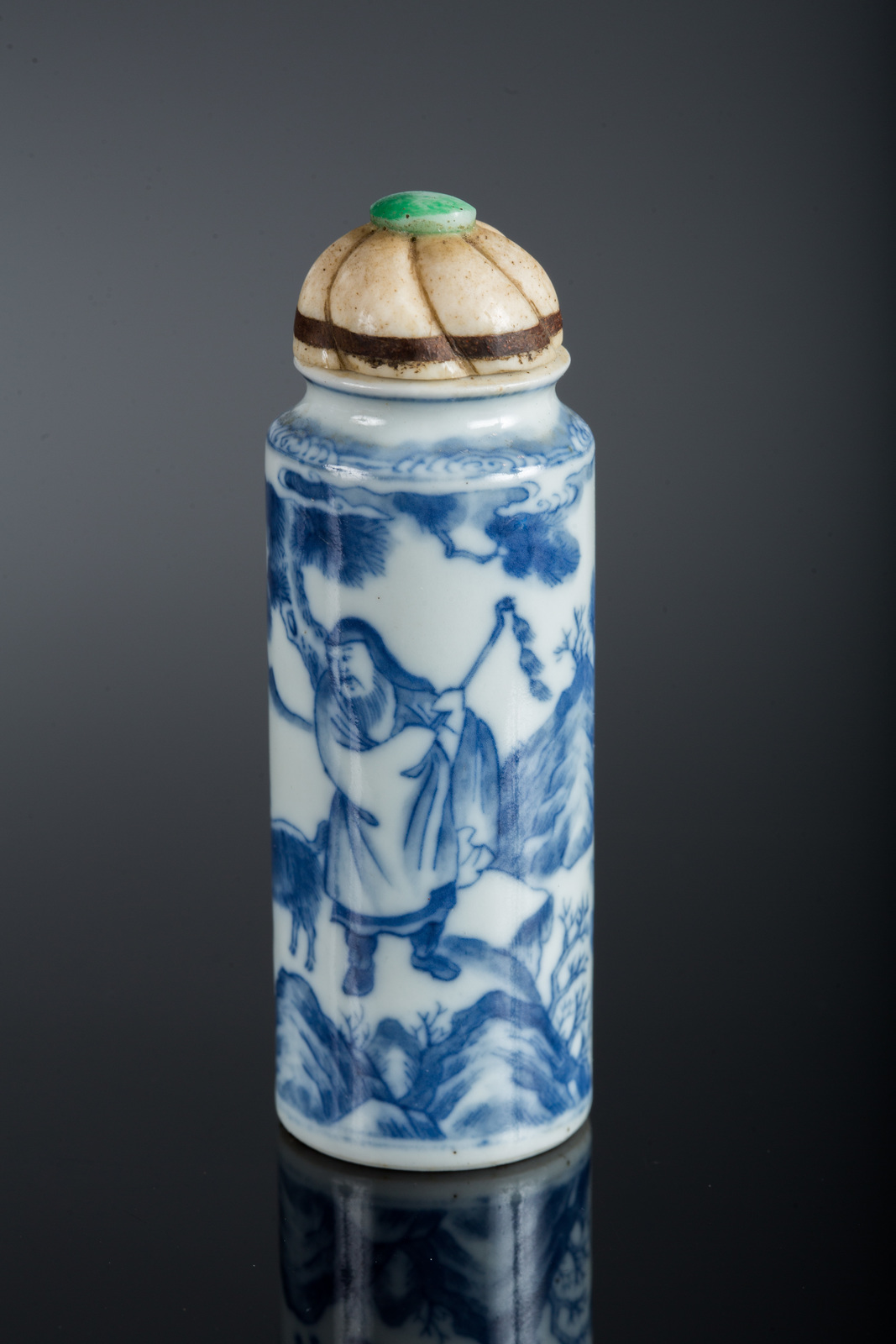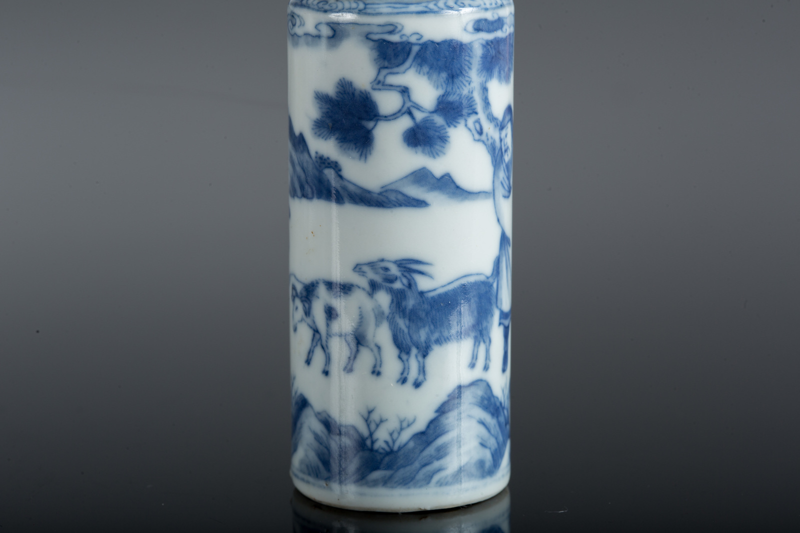 Arte Cinese Tabacchiera cilindrica in porcellana bianco/ blu dipinta con paesaggi ed un pastore con capre