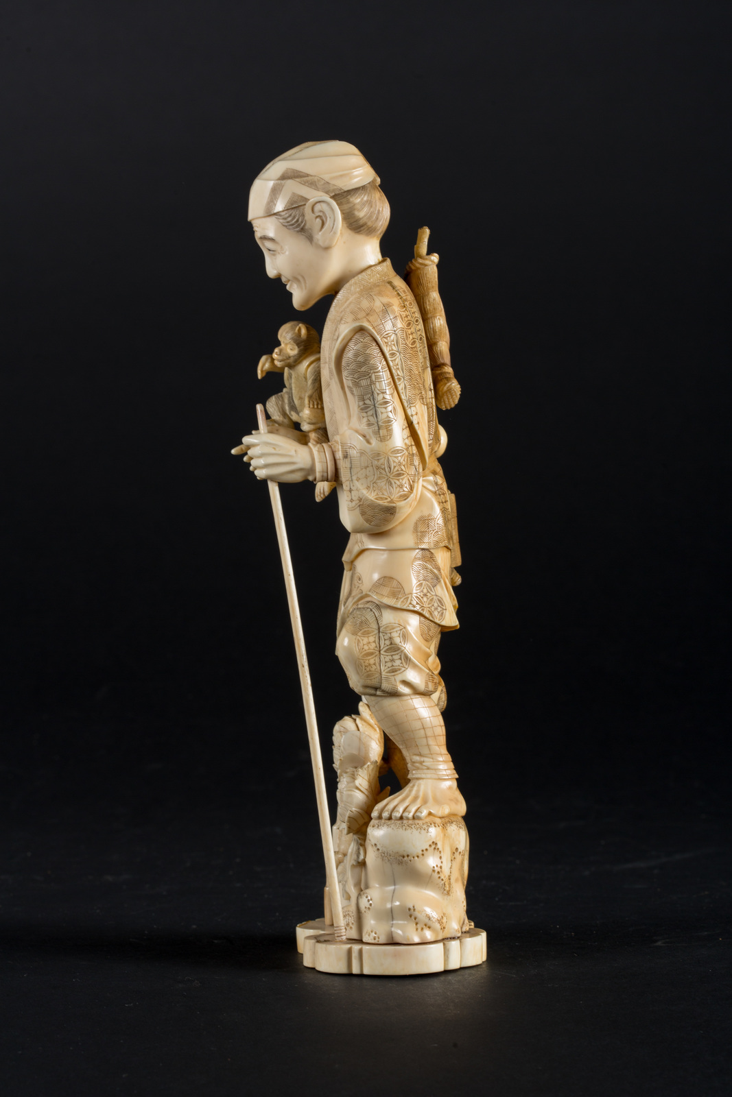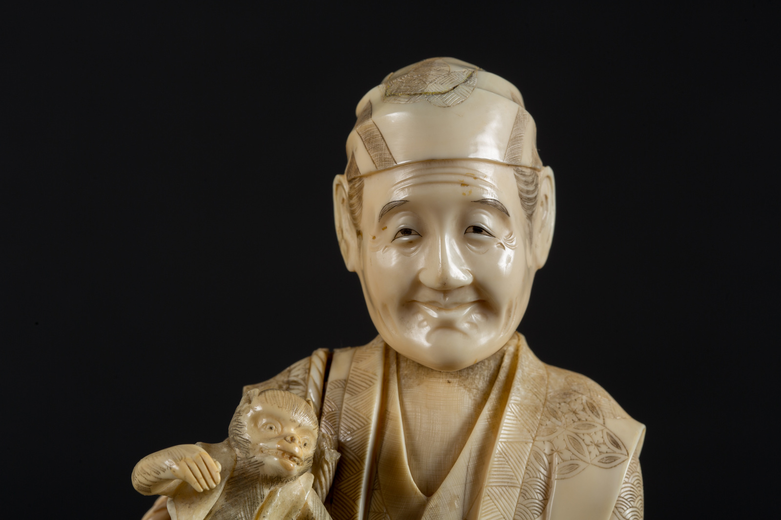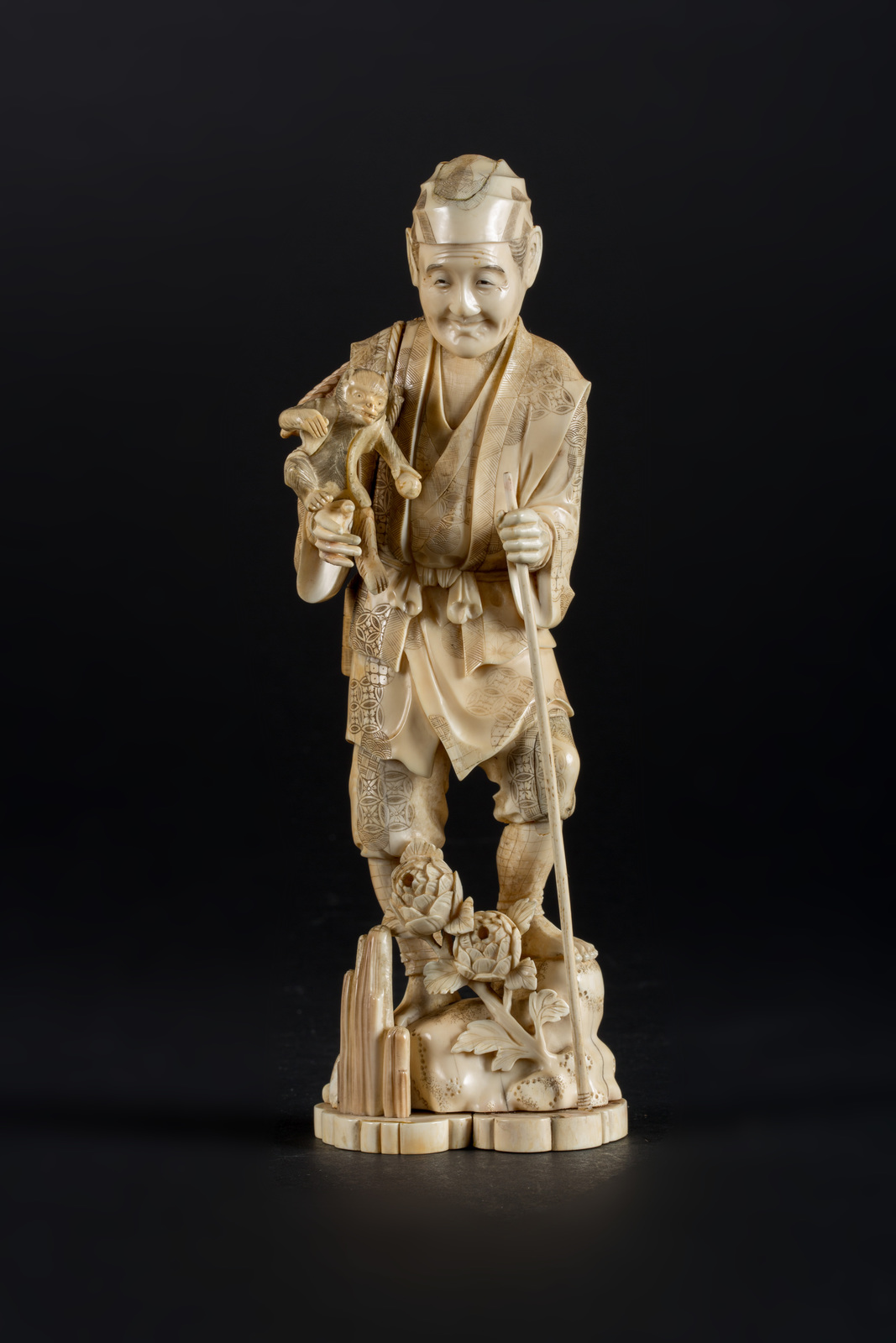 Arte Cinese Okimono in avorio raffigurante un uomo con una scimmia Giappone,...
