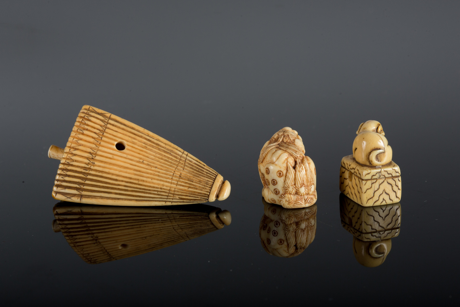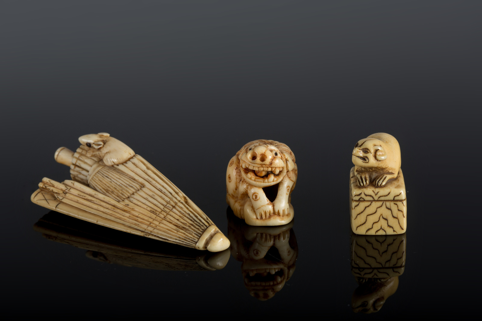 Japan, 19th century . . Cm 7,50. One depicting Shishi with mouvable tongue (h. 2,5 cm); one with a dog on a rock (h. 3 cm) and the last one depicting a mouse on an umbrella (h. 7,5 cm)