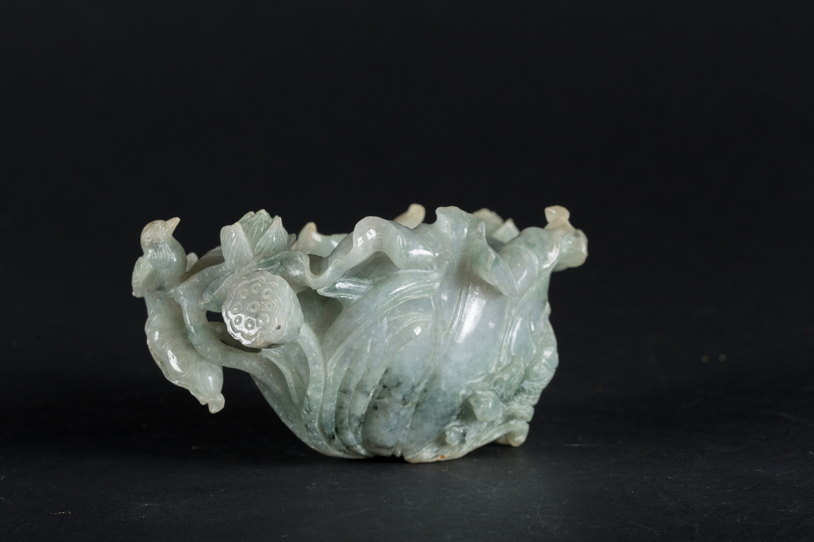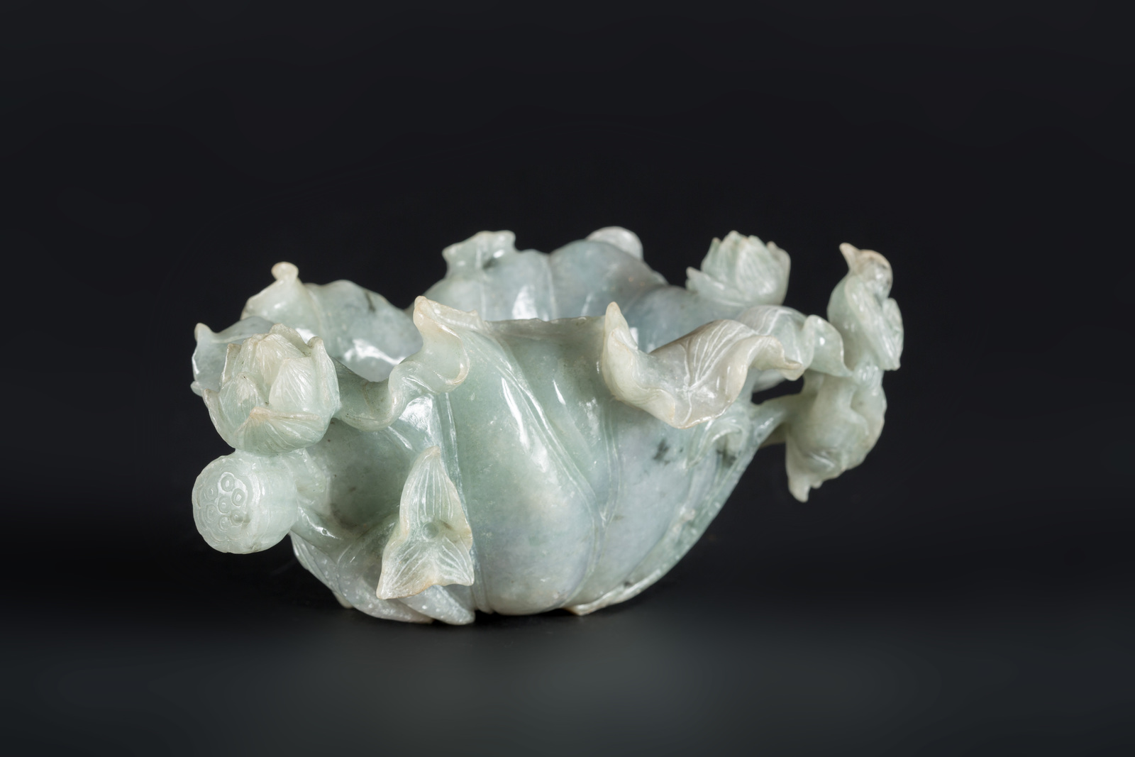 Arte Cinese A jadeite cup carved with fishes, flowers and fruit