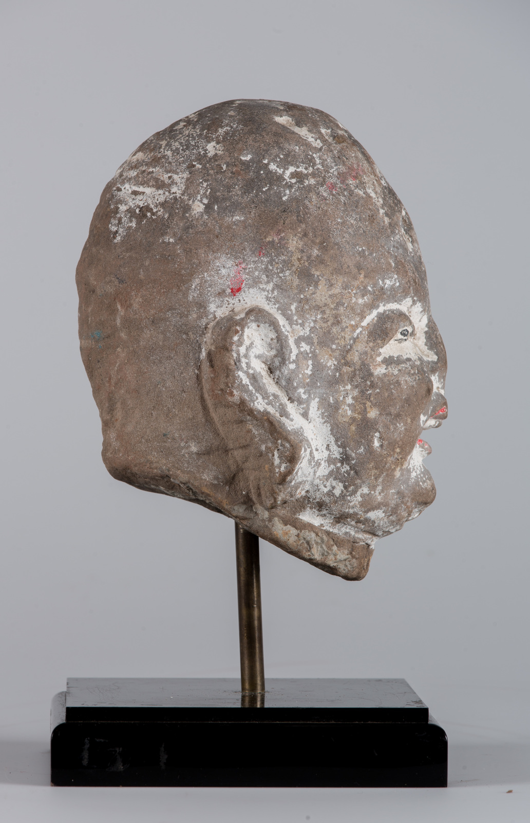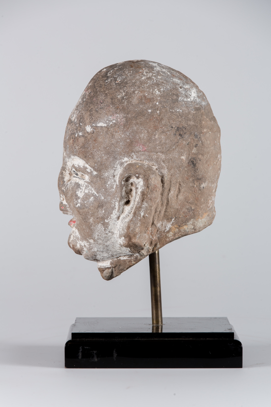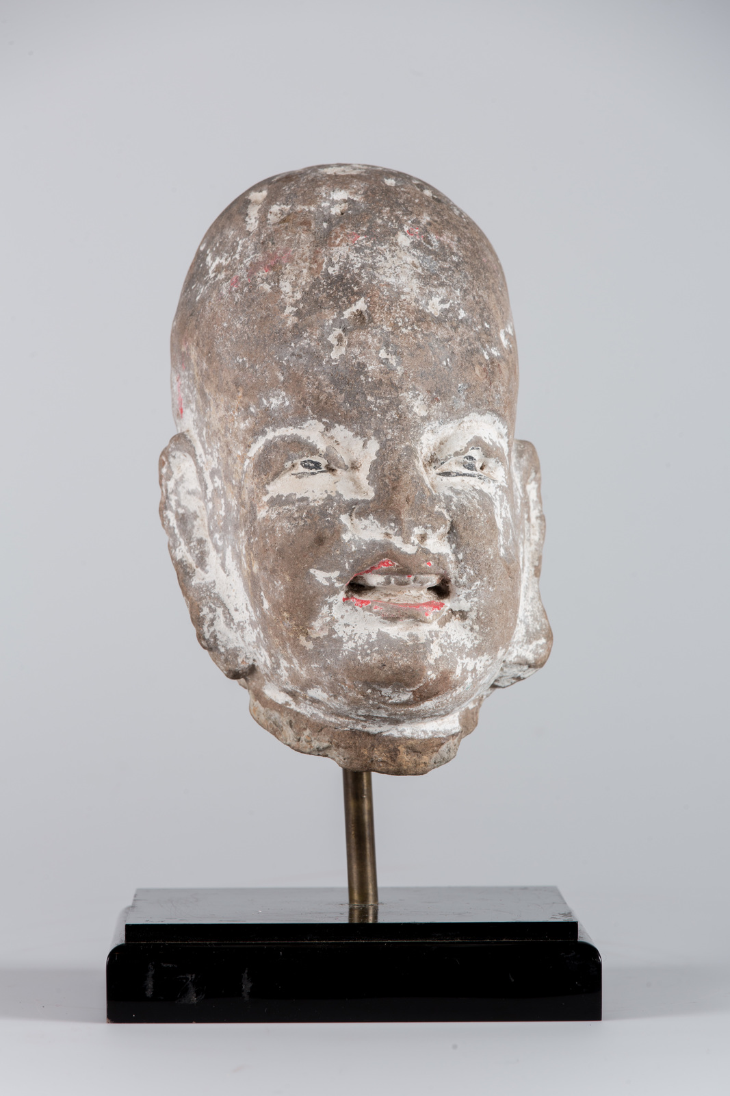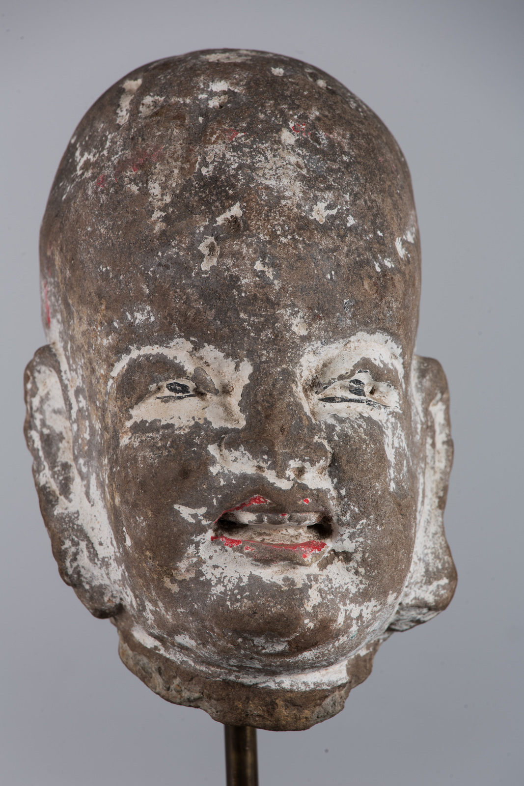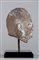 Cina, dinastia Song, 960 - 1279 . -. Cm 12,00 x 20,00. Testa di Lohan realizzata in granito grigio sulla cui superficie sono presenti cospicue tracce policrome, in particolare sulle labbra e sugli occhi.