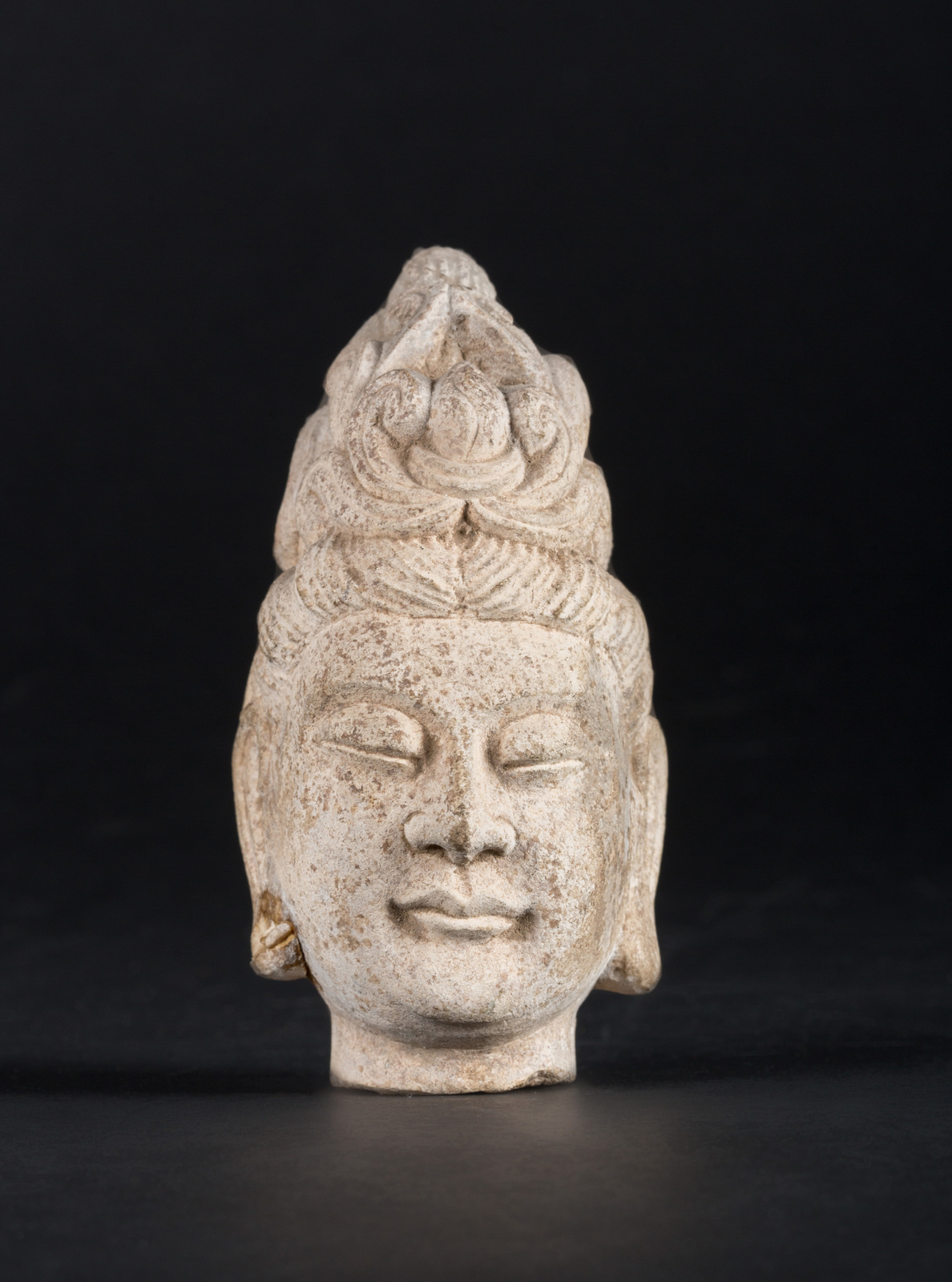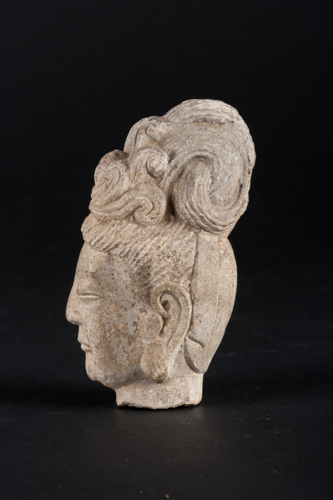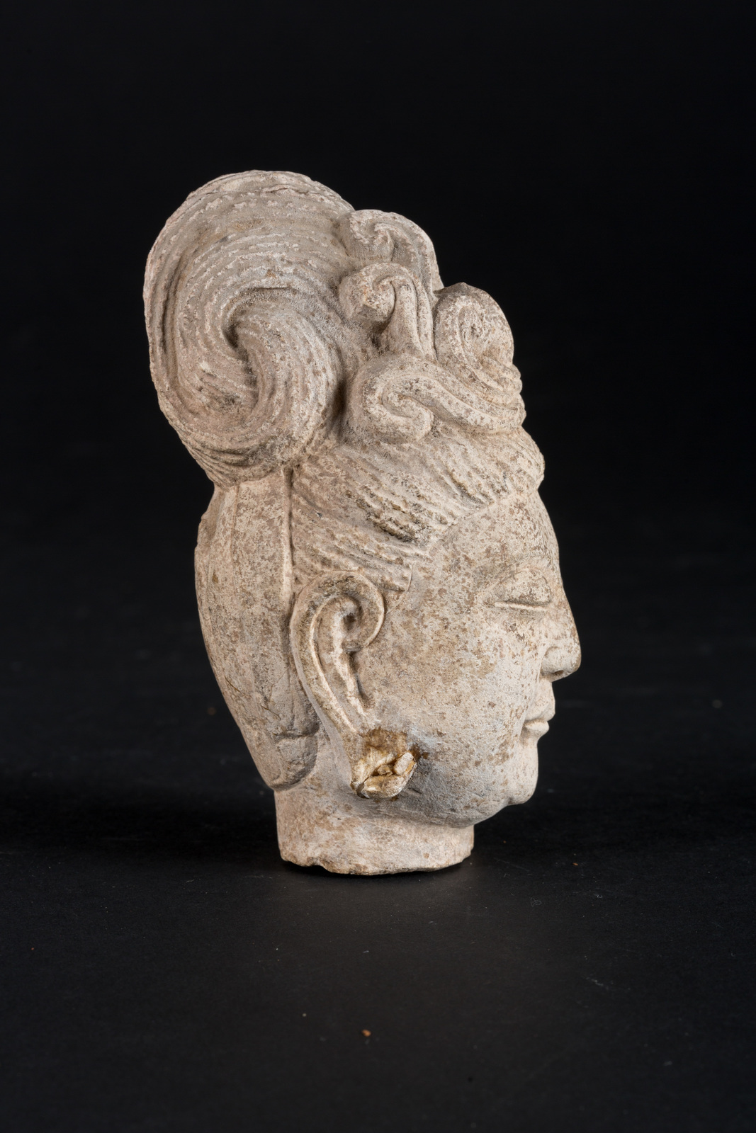China, Tang dynasty. . Cm 7,00 x 14,00. Characterized by a serene expressione and elaborated headdress. Old red label with inscription on the base.