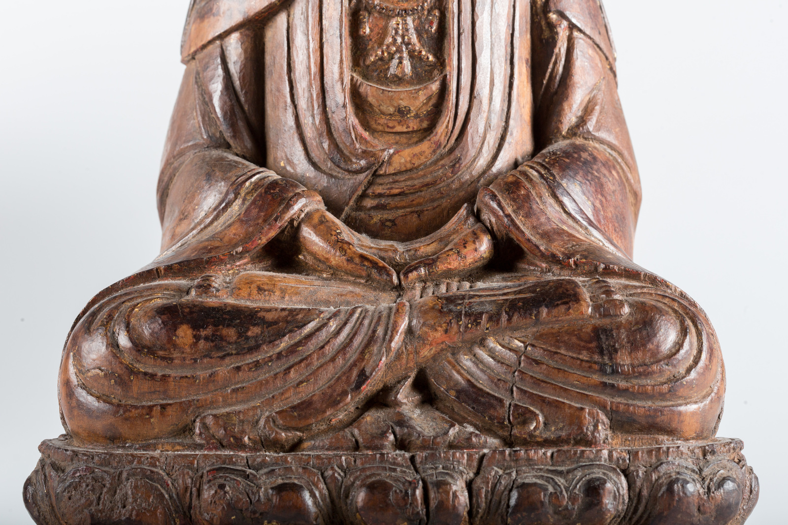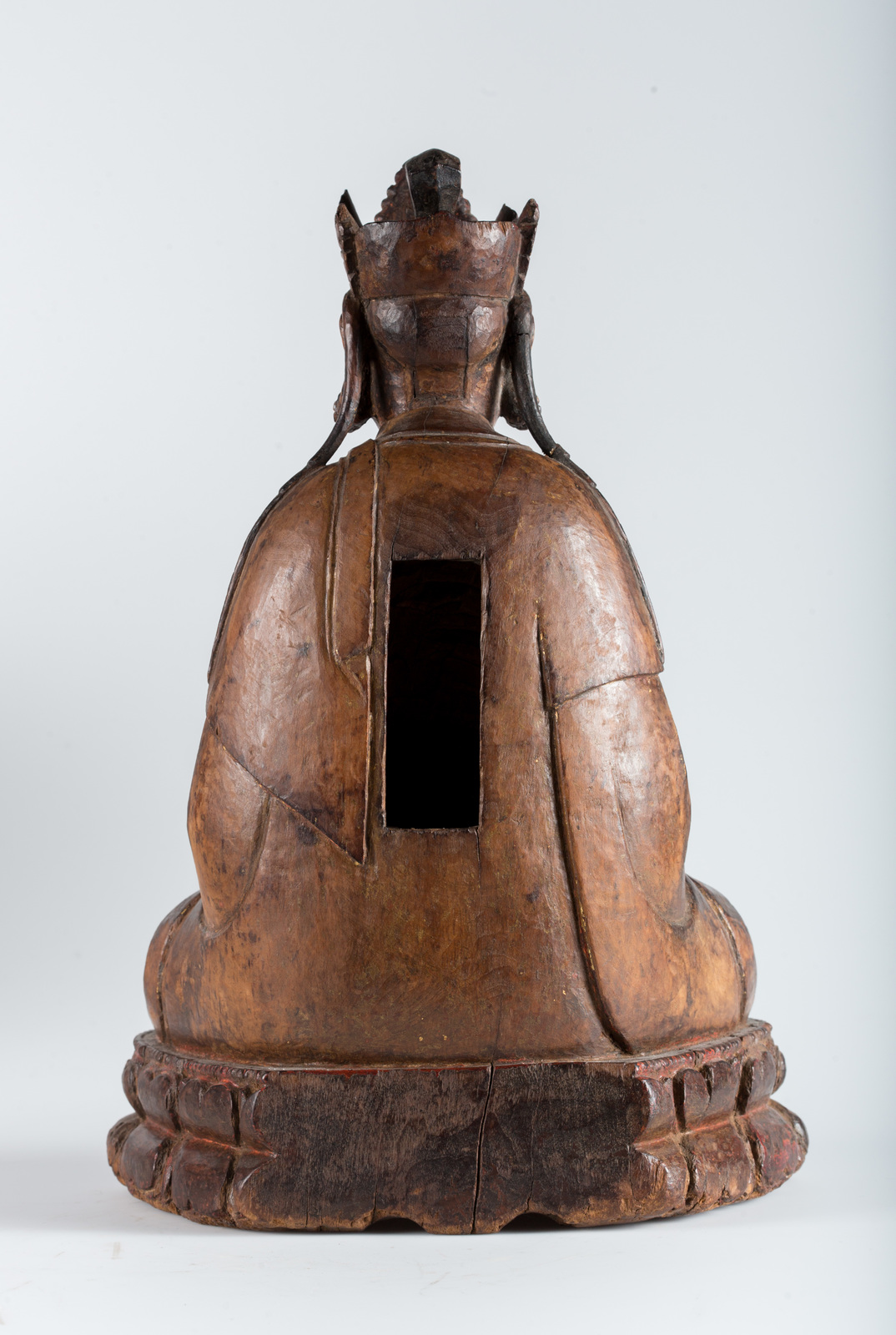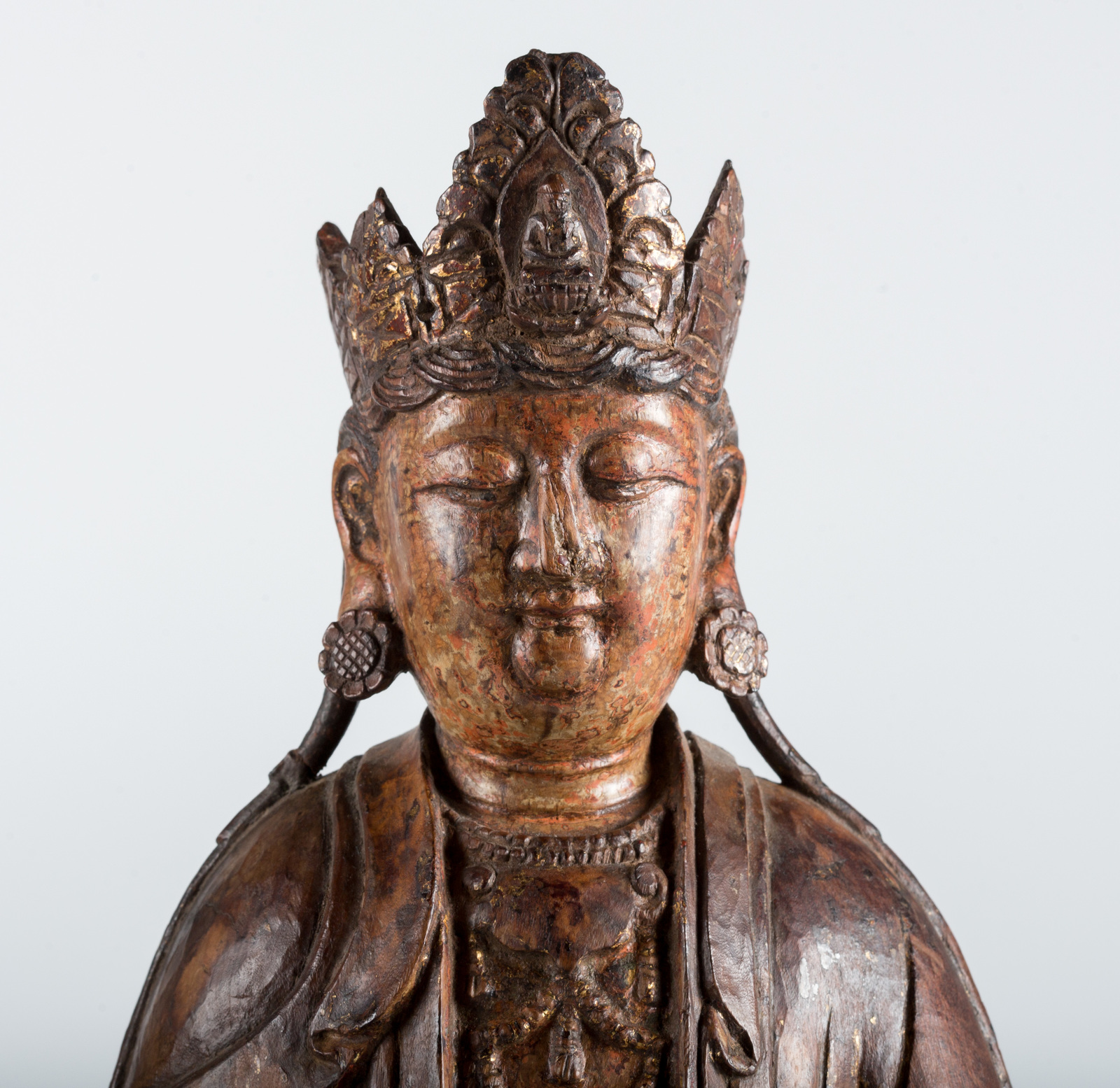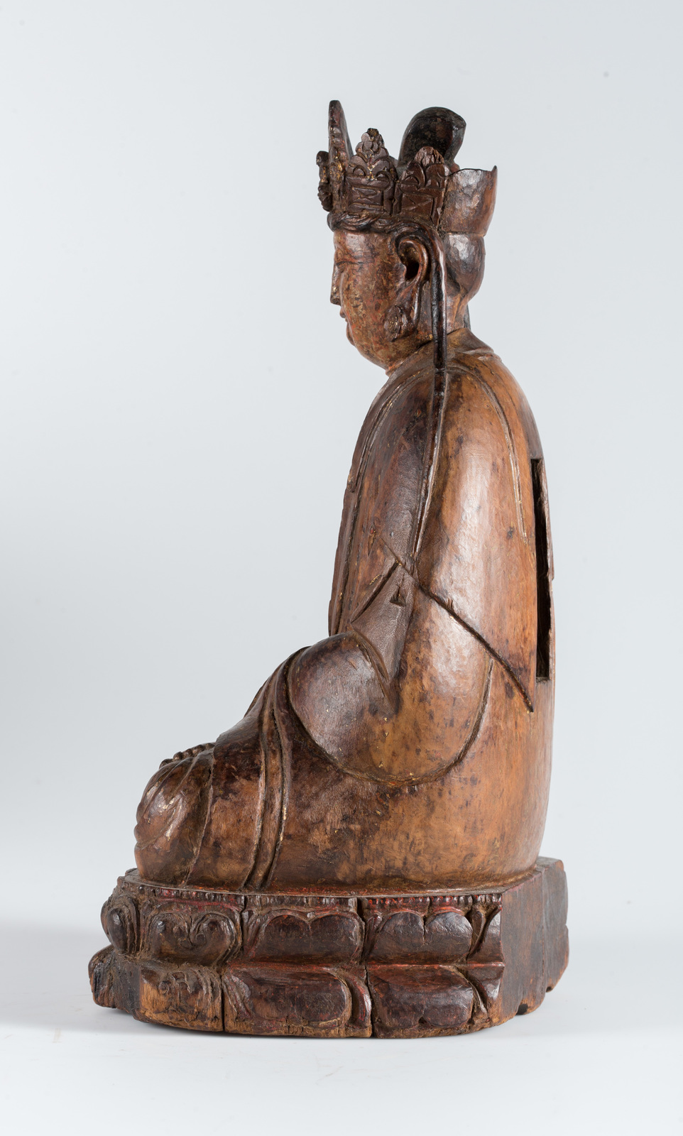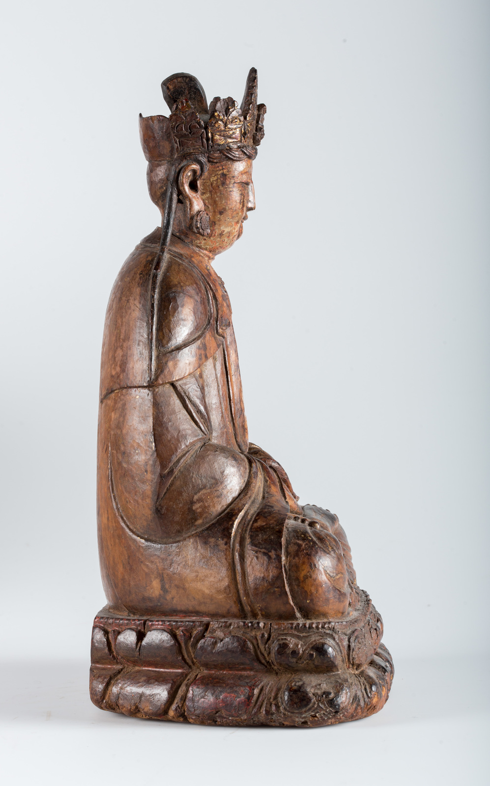 Cina, dinastia Yuan, 1279 - 1368. -. Cm 35,50. Il bodhisattva della compassione, dalla ieratica espressione, è qui ritratto seduto in posizione padmasana su una base a doppio fiore di loto, è adornato da ricchi gioielli e da una veste dal raffinato panneggio. Le mani adagiate in grembo sono nel gesto di meditazione dhyanamudra. Sulla testa è presente una corona a cinque punte sulla cui foglia centrale è rappresentato il buddha trascendente Amitabha di cui la figura ritratta è emanazione.