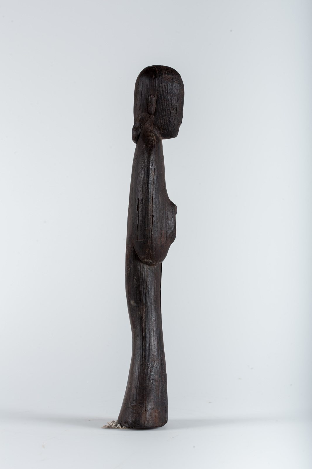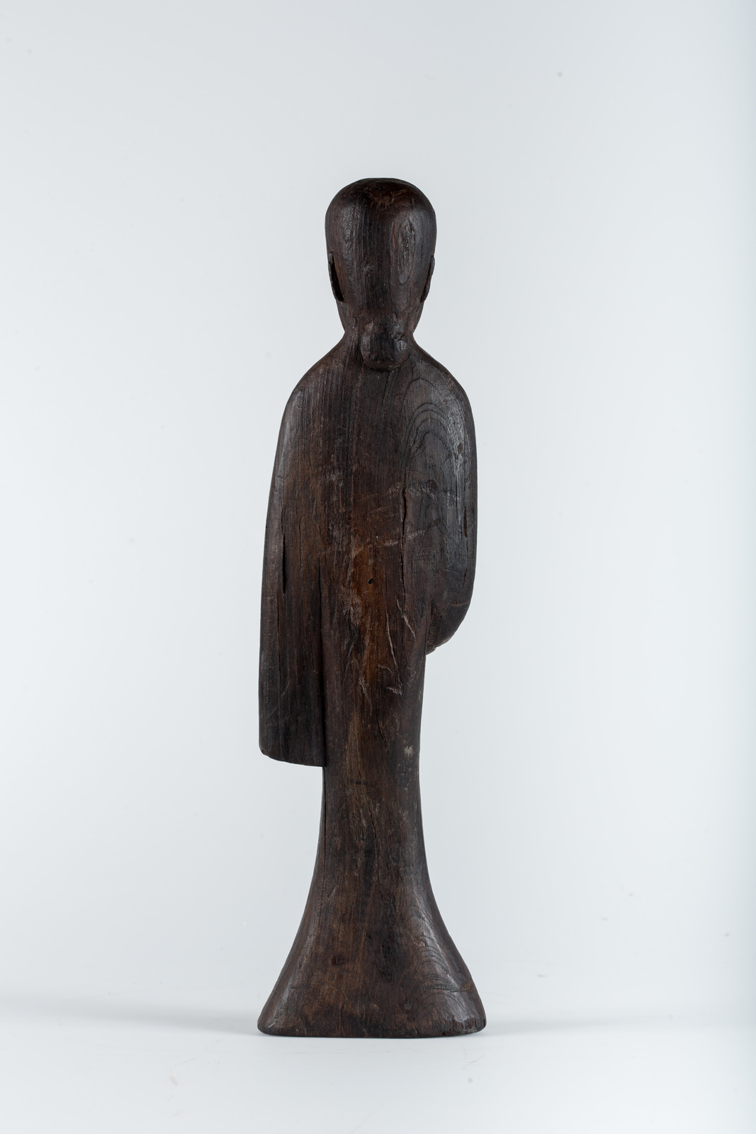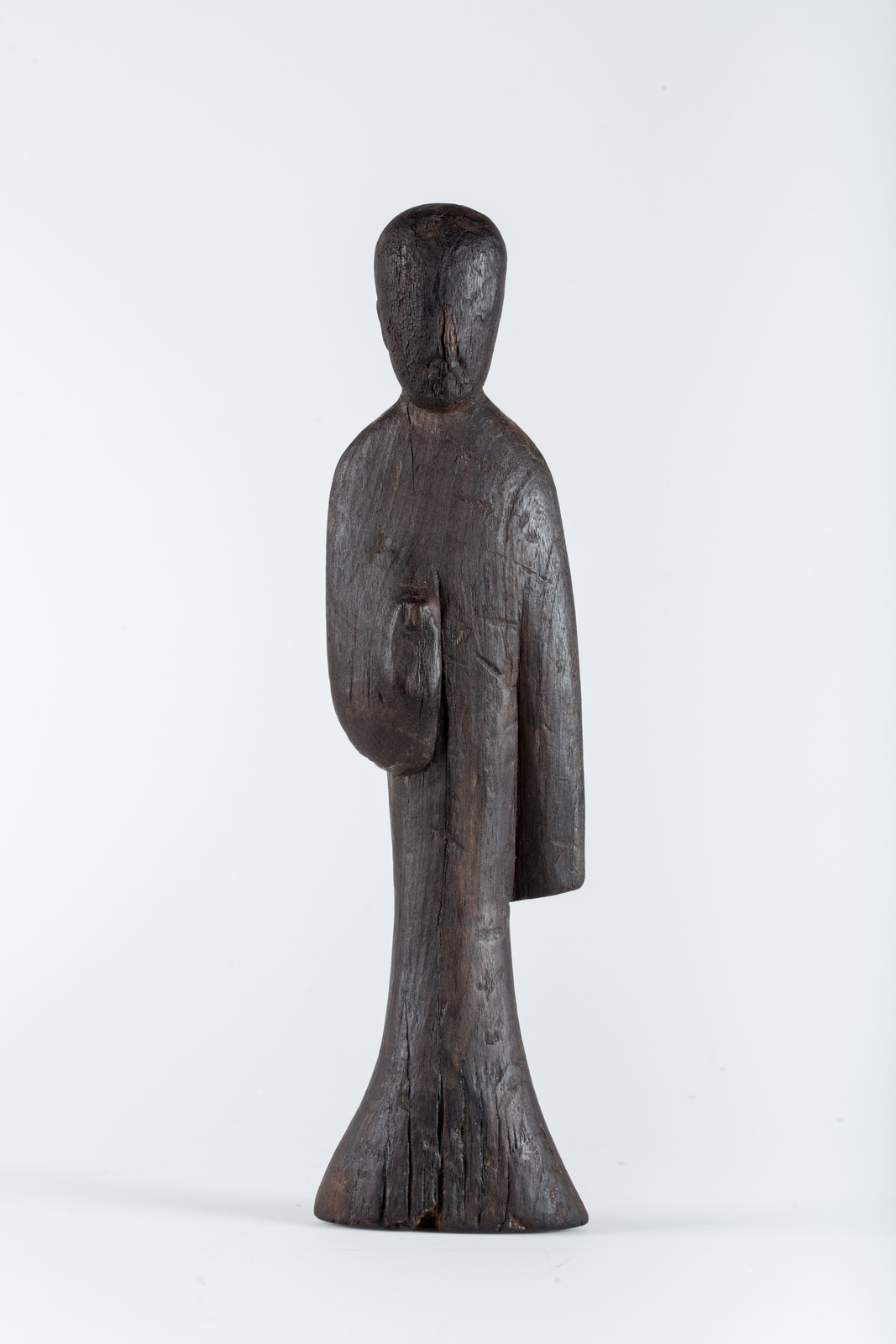 Cina, periodo Stati Combattenti, 475 - 221 AC. -. Cm 12,00 x 38,00. Importante figura in legno, con tracce di laccatura nera, raffigurante un'antenata femminile riconoscibile dall'acconciatura dei capelli raccolti in una crocchia. Il personaggio è ritratto con una lunga veste con maniche e fondo ampi.