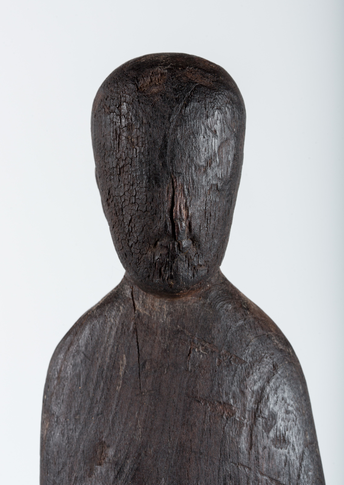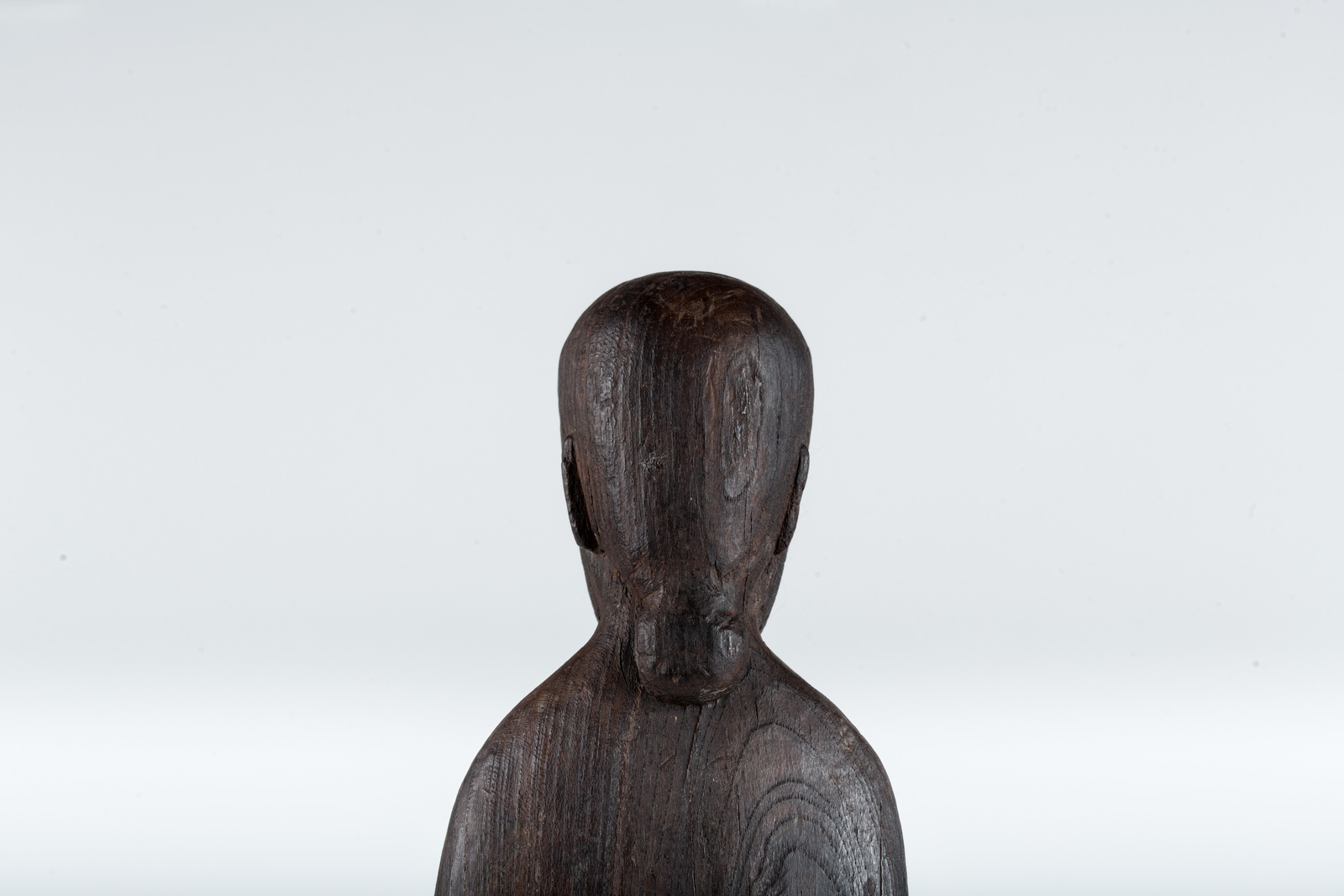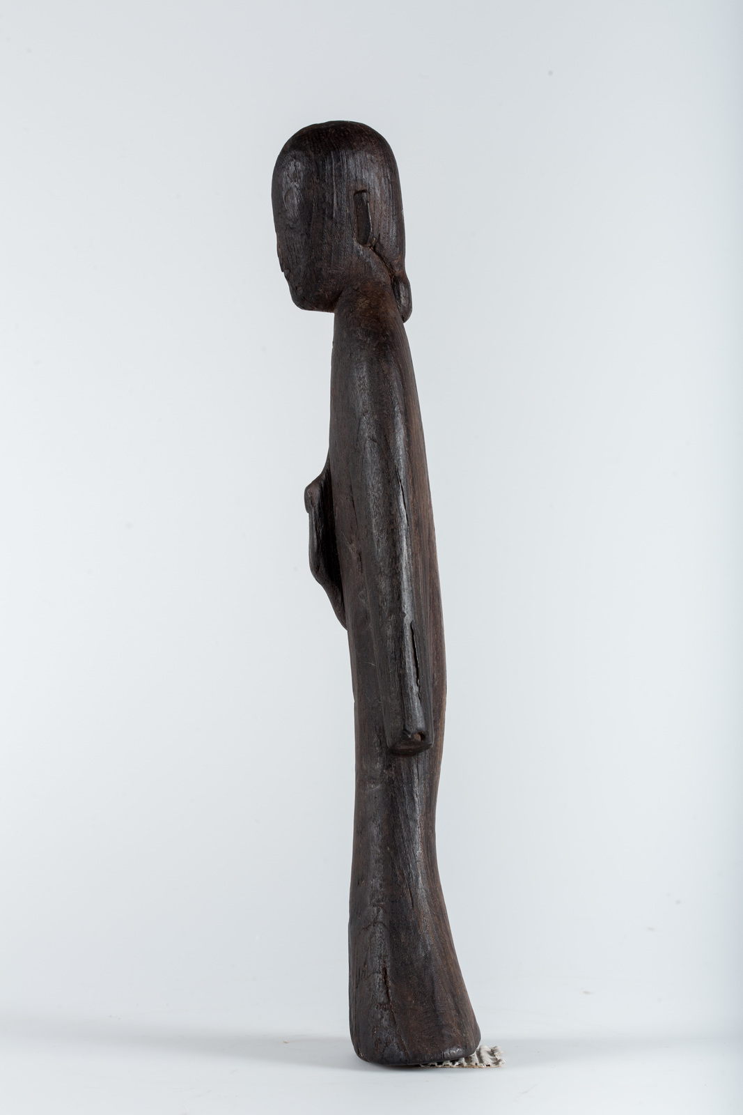 Cina, periodo Stati Combattenti, 475 - 221 AC. -. Cm 12,00 x 38,00. Importante figura in legno, con tracce di laccatura nera, raffigurante un'antenata femminile riconoscibile dall'acconciatura dei capelli raccolti in una crocchia. Il personaggio è ritratto con una lunga veste con maniche e fondo ampi.