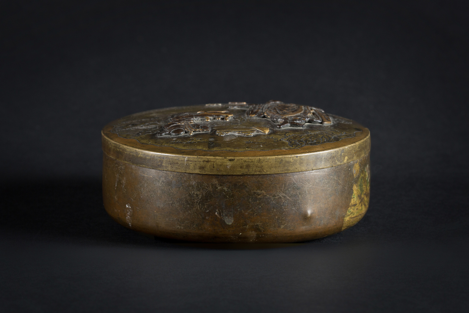 Arte Giapponese Scatola circolare in ottone decorata in rilievo con due...