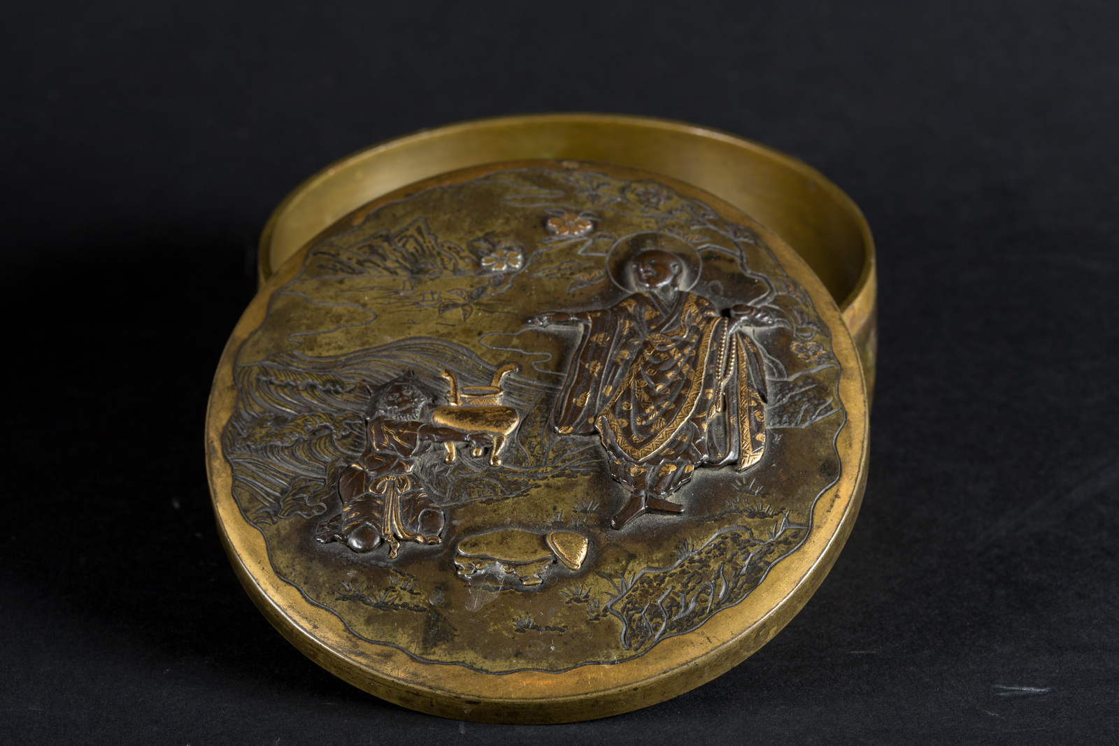Arte Giapponese A circular brass box and cover decorated with two figures engaged in a ritual