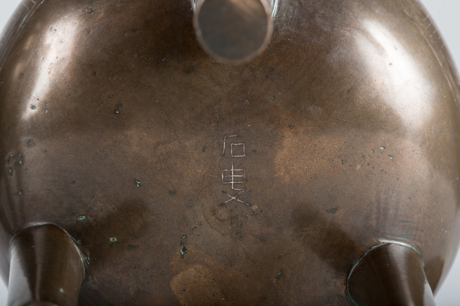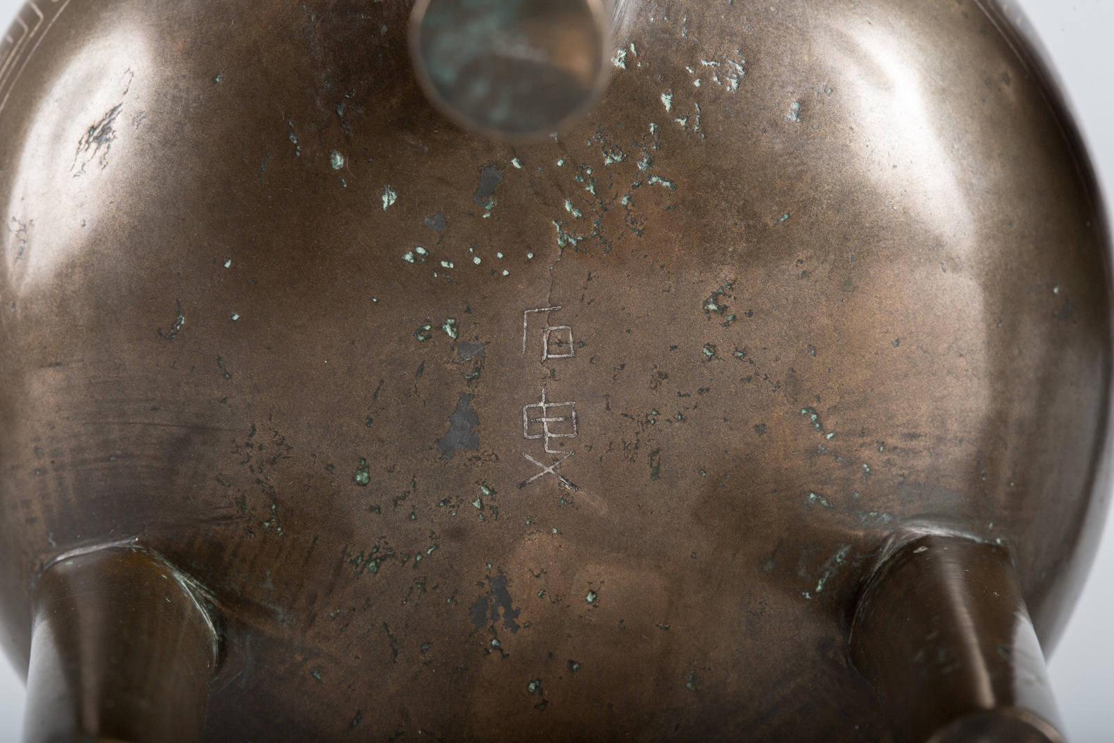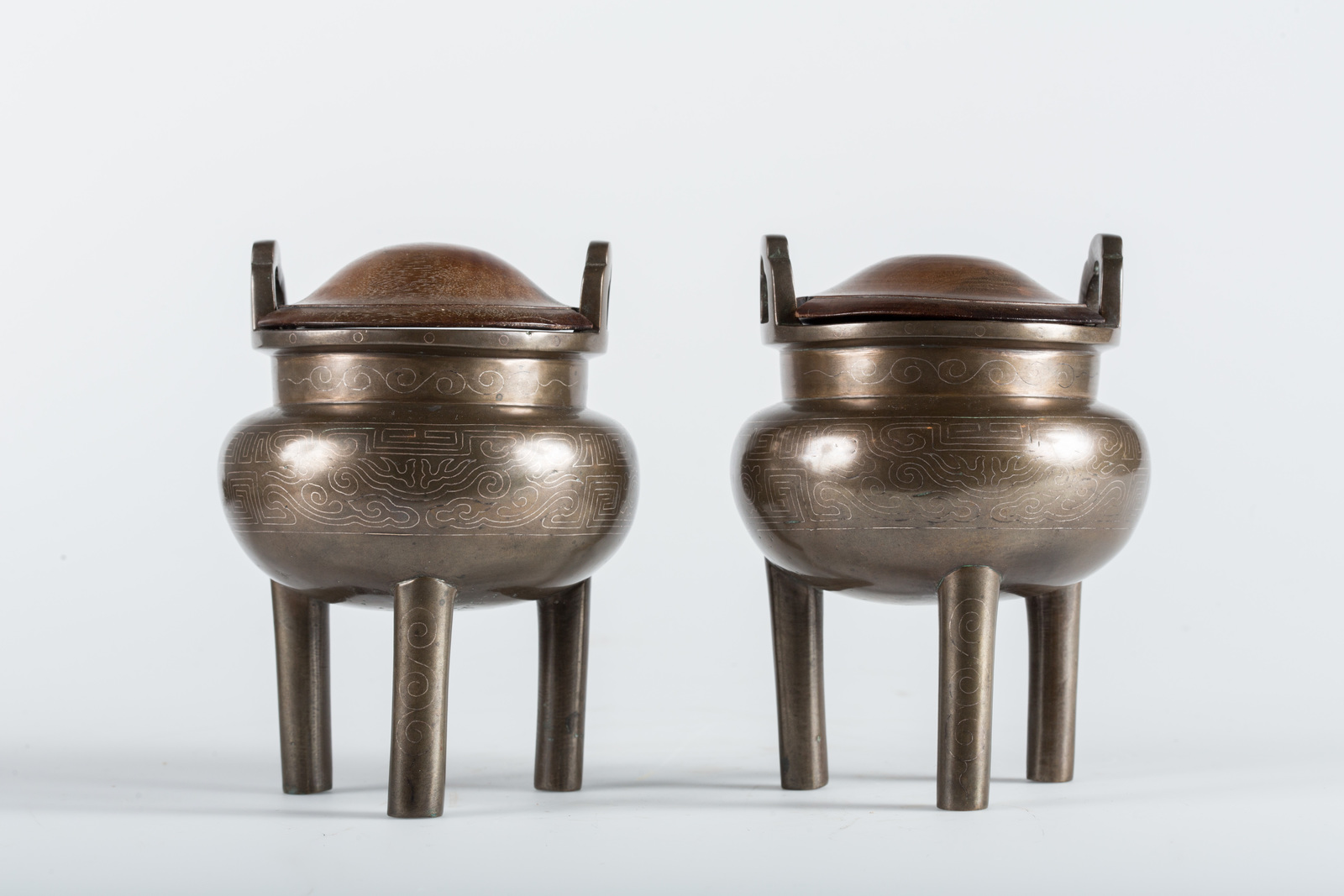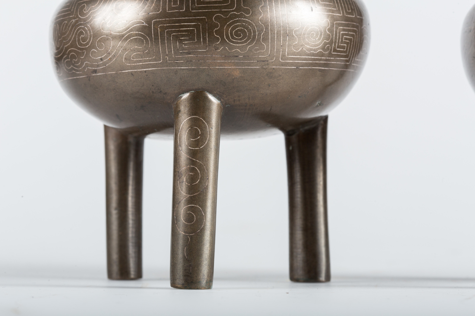 Arte Cinese A pair of bronze tripod censers signed by Shiye and inlaid with silver