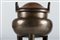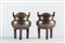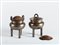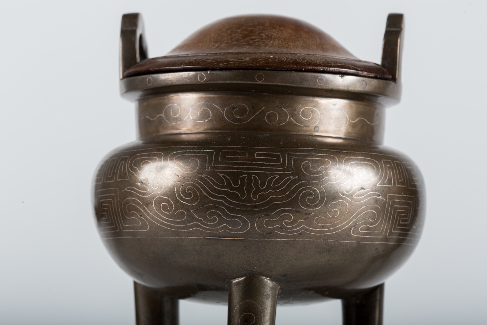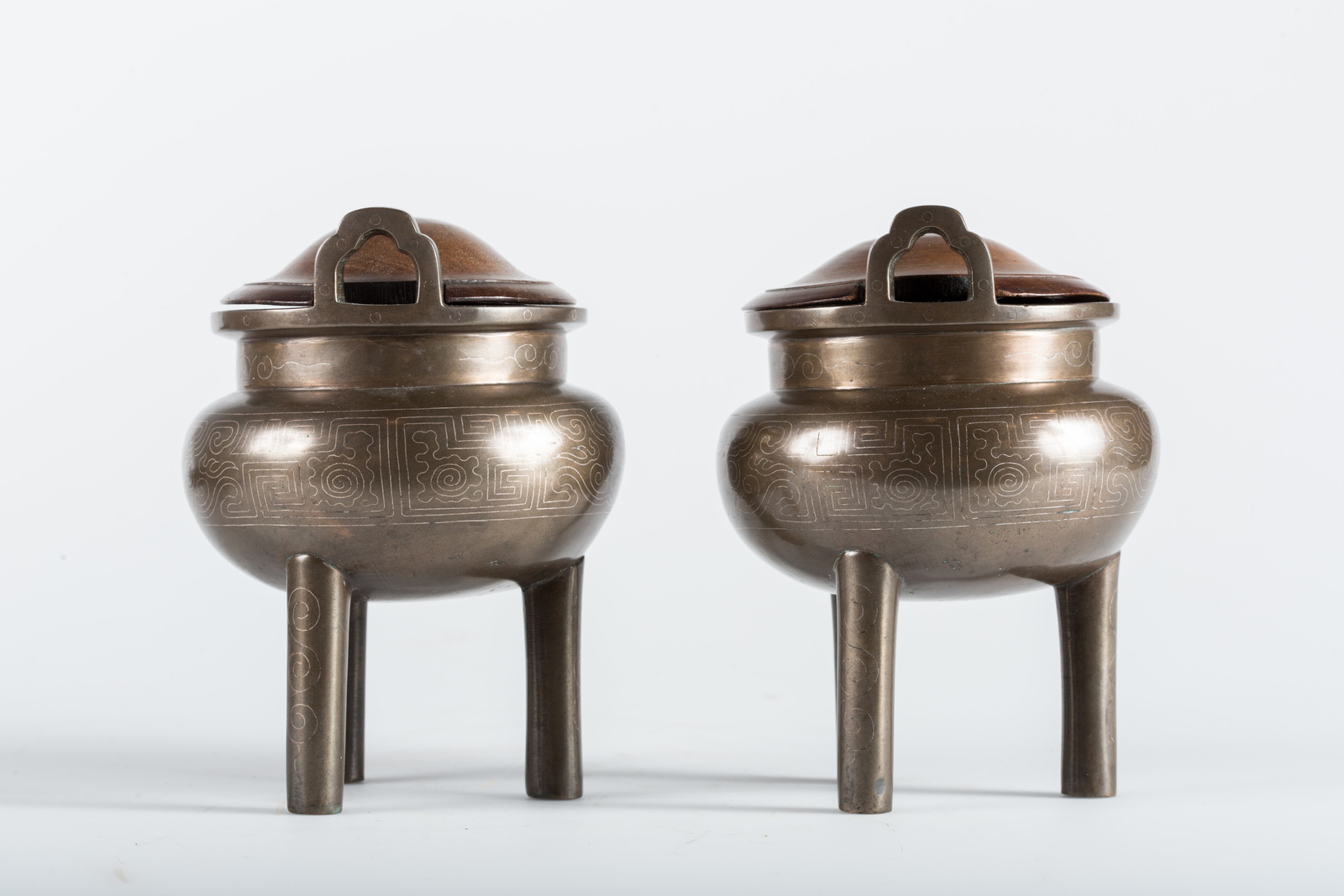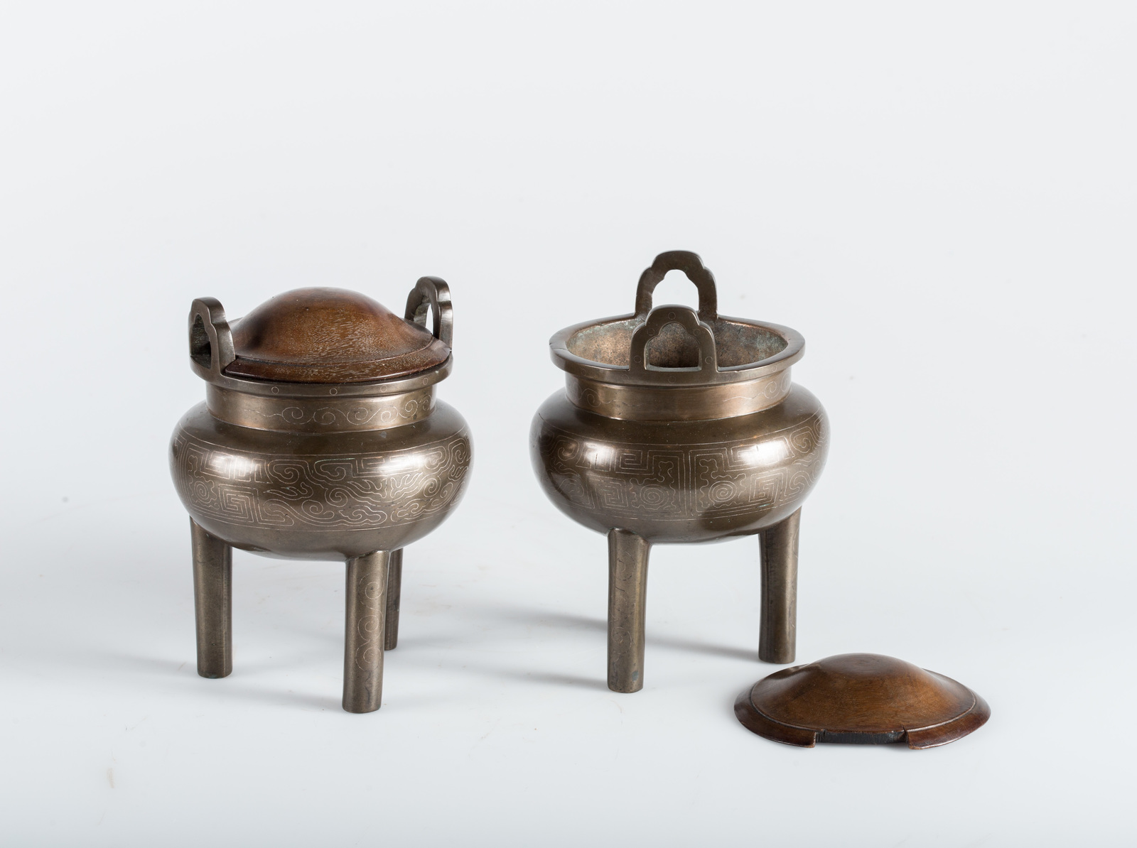 Cina, dinastia Qing, XVII secolo . -. Cm 10,50 x 14,00. Contenitori tripodi in bronzo, con alte anse trilobate e coperchio bombato in legno. Il corpo mostra fini intarsi geometrici e stilizzati in argento.