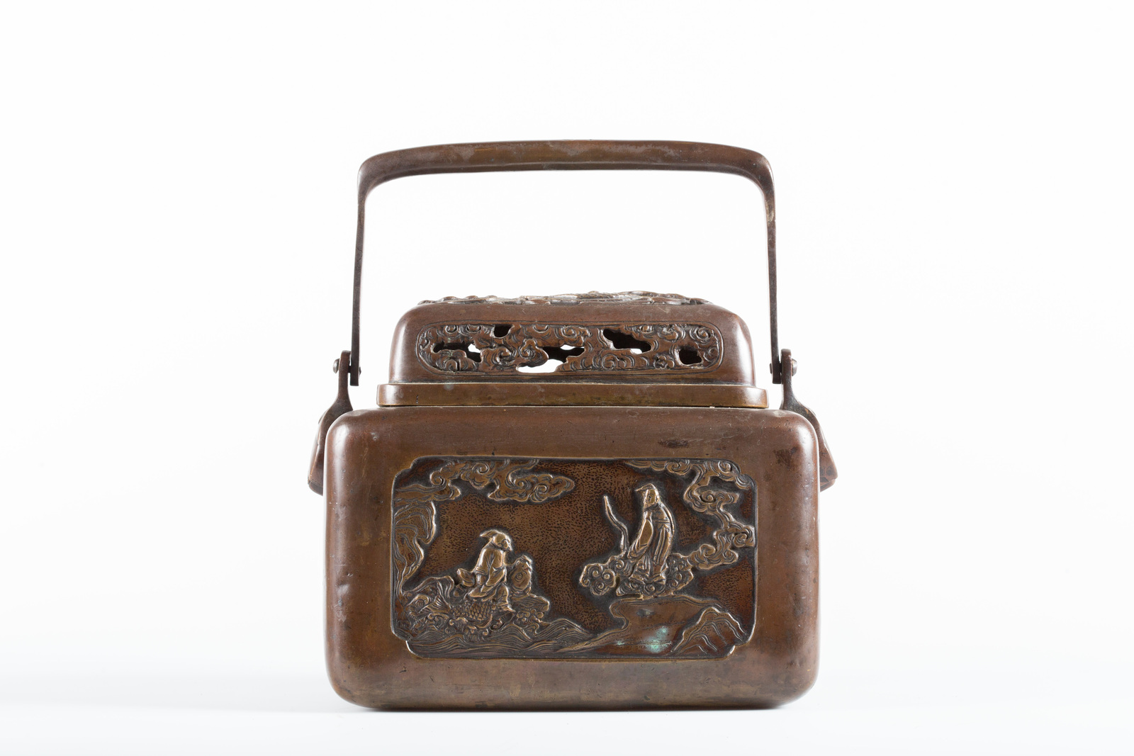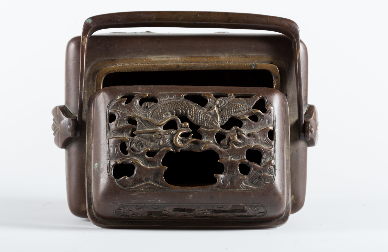 Arte Cinese A square bronze hand warmer with openwork cover and a Xuande mark at the base