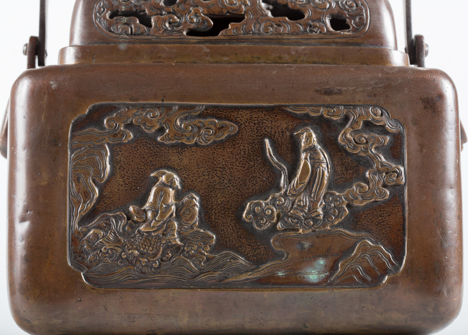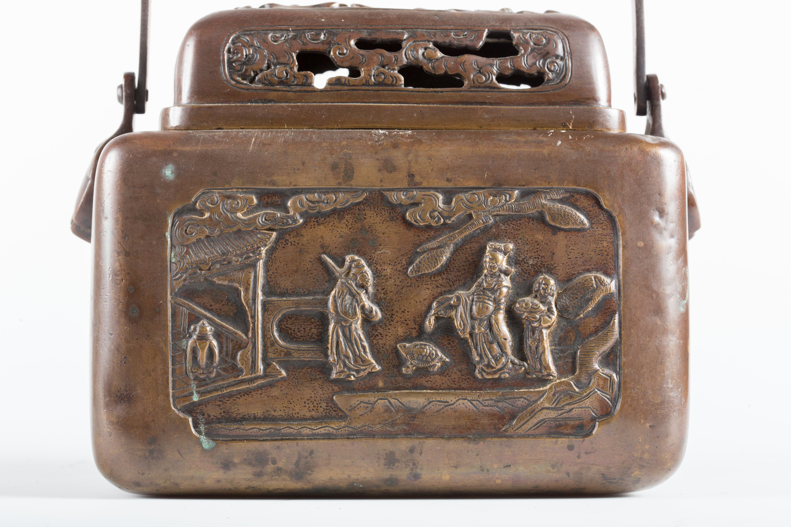 Cina, dinastia Qing, XIX secolo . -. Cm 24,50 x 19,00. L'oggetto è decorato con due grandi riserve contenenti personaggi sui lati ed il coperchio lavorato a traforo con un dragone. Manico basculante attaccato ai lati.