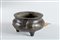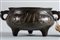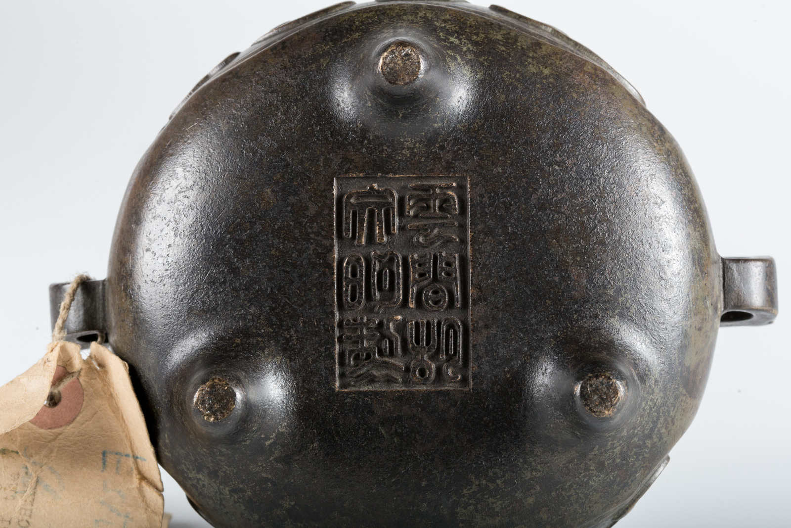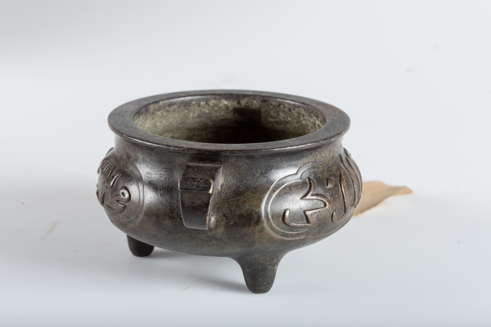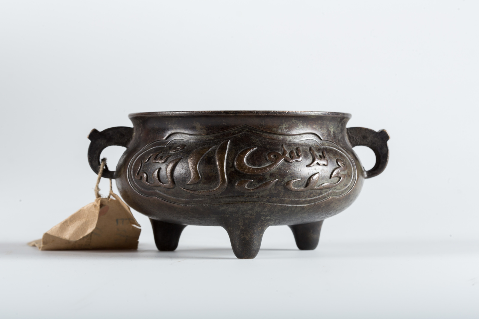 Cina, fine dinastia Ming, XVII secolo . -. Cm 17,50 x 8,00. Fusione in bronzo a patina scura in forma di incensiere circolare poggiante su tre piedi. I due lati dell'oggetto, definiti dai solidi manici, recano due cartigli lobati contenenti iscrizioni in arabo. Marchio a sei caratteri Hu WenMing (realizzato da Hu Wenming di Yunjian) sulla base. Altri incensieri firmati dallo stesso artista sono stati venduti da Christie's e da Sotheby's (cfr. Christie's London, May 13th 2011, asta 6162, lot 1039).