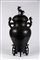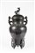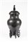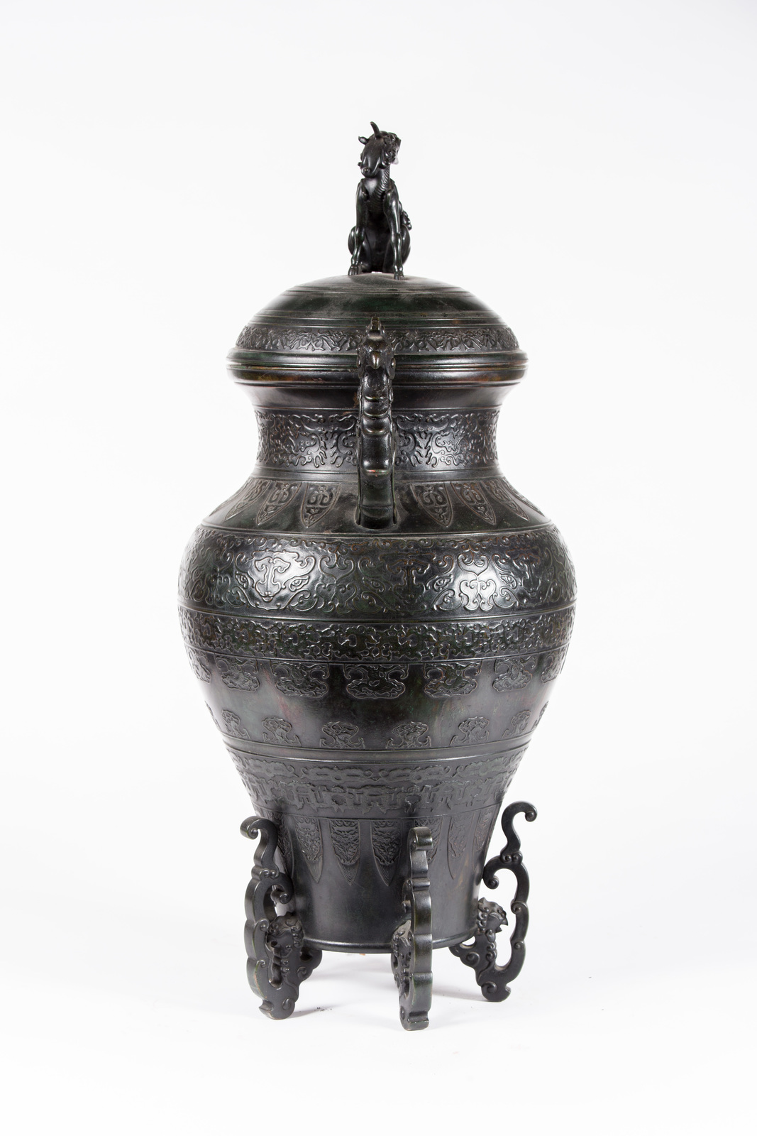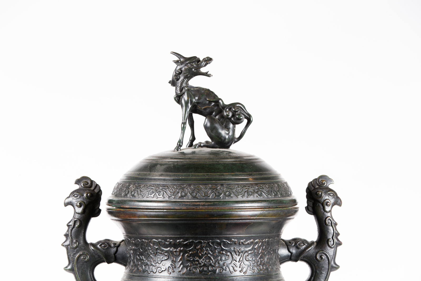 Giappone, periodo Meiji, XIX secolo . -. Cm 40,00 x 80,00. Fusione in bronzo a patina scura decorata con fasce orizzontali contenenti motivi vegetali stilizzati e caratterizzata da manici zoomorfi con dragone alla sommità del coperchio.