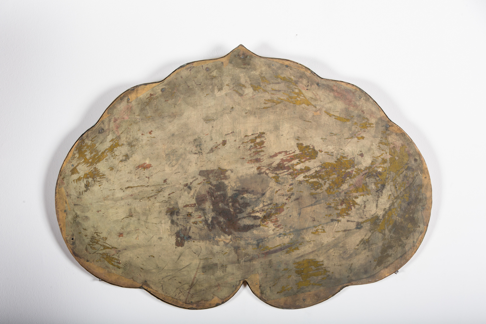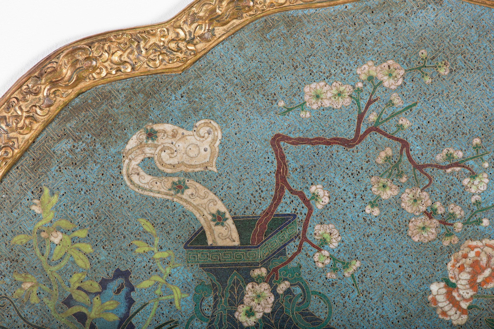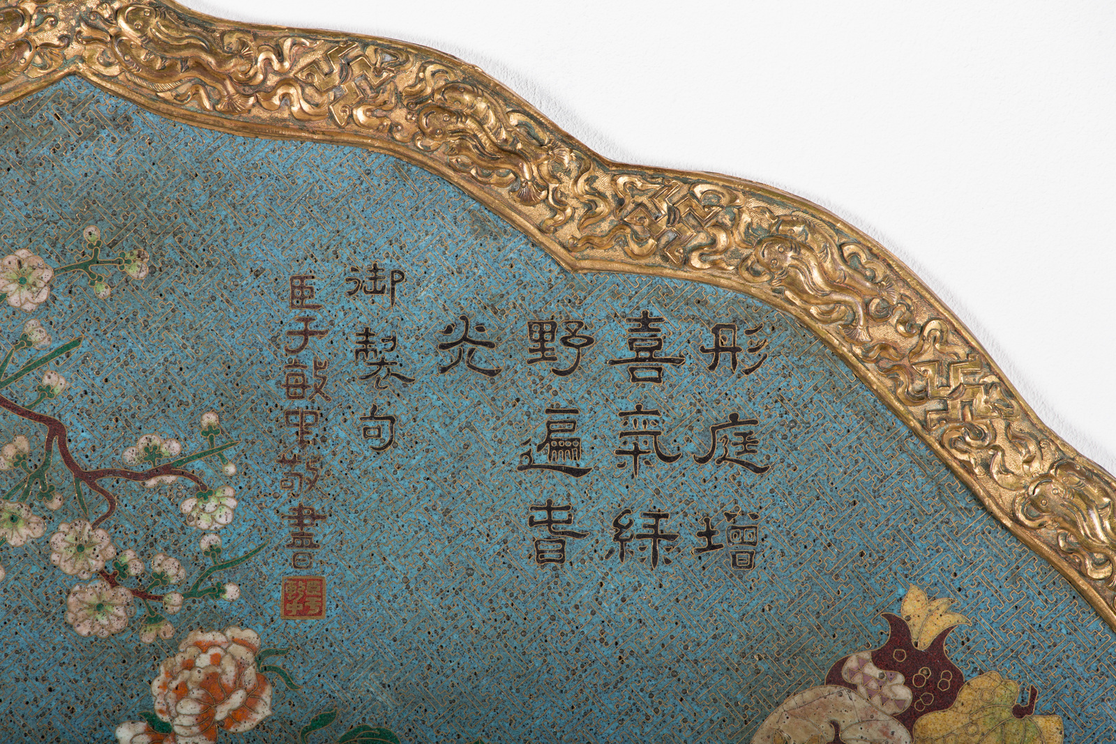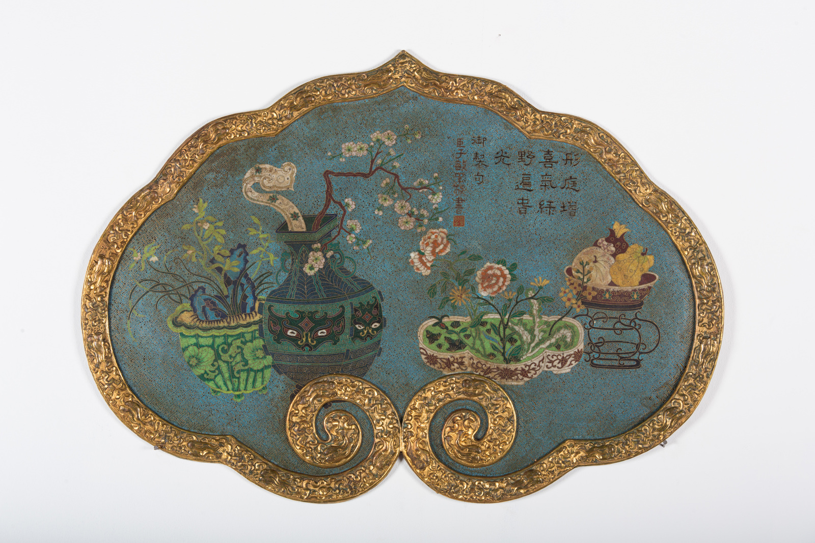 Cina, dinastia Qing, periodo Qianlong (1736 - 1795). -. Cm 60,00 x 42,00. All'interno della raffinata cornice, in metallo sbalzato con elementi simbolici benaugurali quali svastiche, coppie di pesci e nuvole, si apre una raffinata placca realizzata in tecnica cloisonnè nella quale sono raffigurati vasi contenenti peonie, rami di ciliegio, frutta ed un ruyi che fuoriesce da un vaso arcaicizzante caratterizzato da taotie. Lunga iscrizione e marchio in alto a destra inerente alla Festa di Primavera e tratta da Siku Quanshu (La totalità dei volumi dei Quattro Magazzini), parte delle Cronache dei Qing. L'iscrizione termina con il nome di Yu Minzhong (1714-1779), ufficiale di Jintan, nella provincia di Jiangsu. Egli fu consigliere dell'imperatore Qianlong in importanti affari politici e dal 1773 alla sua morte fu uno dei ministri più potenti dell'impero. A corte diresse la redazione del menzionato Siku Quanshu e il suo ritratto è incluso in un dipinto che raffigura diciassette dei cinquanta generali ed ufficiali meritevoli, commissionato dall'imperatore Qianlong e venduto da Sotheby's New York, 1 giugno 1992, lotto 77.
