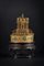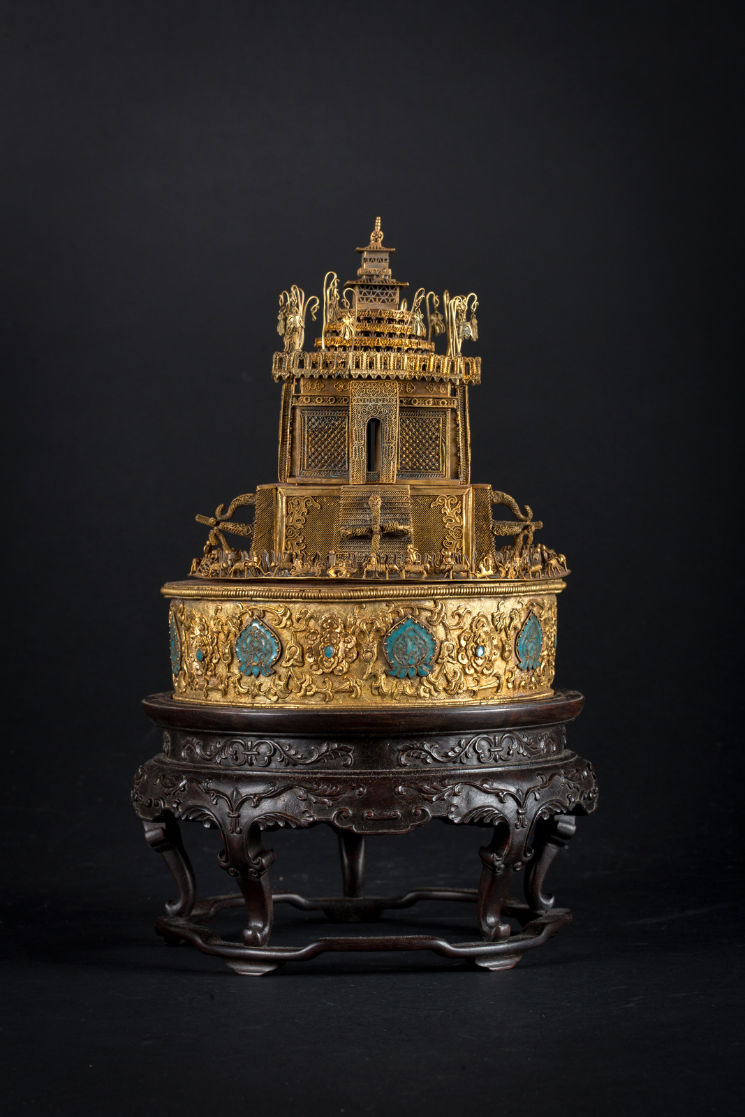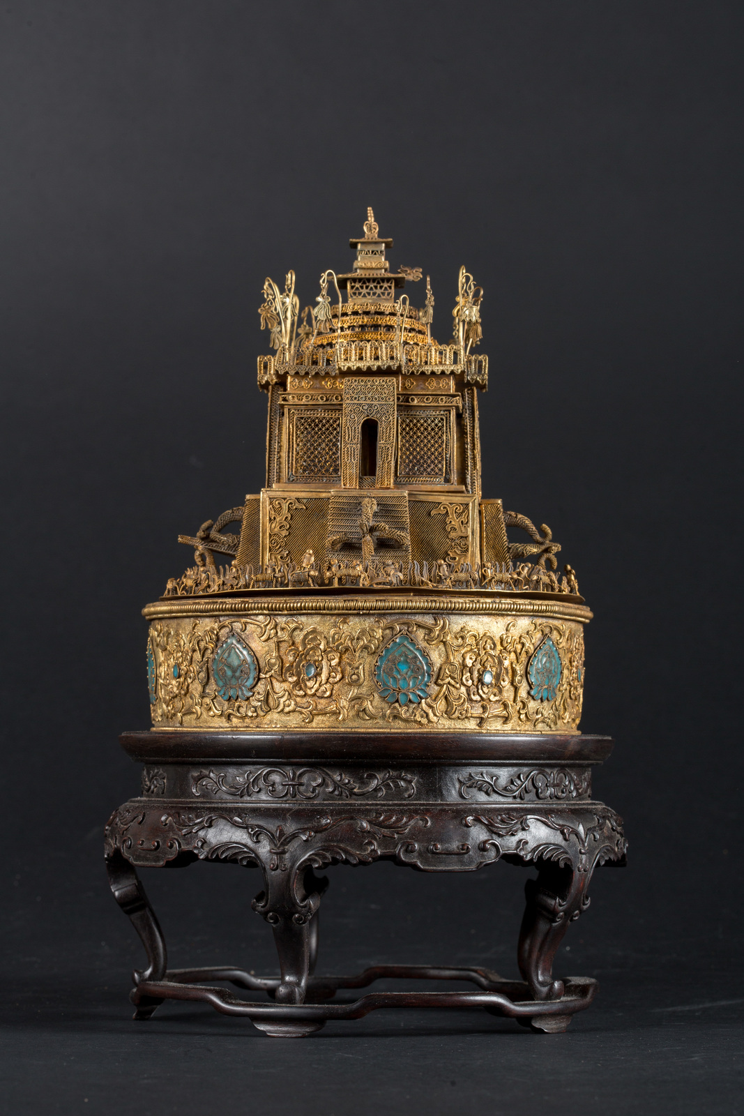 Cina, dinastia Qing. -. Cm 32,00. Nella struttura, dal fitto lavoro in filigrana e disposta su quattro livelli principali, è possibile notare un intricato gioco di piccole figure, animali ed umane, in processione intorno all'edificio stesso. Il livello più basso, a pianta circolare, mostra un bel decoro fitoforme a sbalzo con inserti in cloisonnè azzurro, mentre nel livello superiore, da ognuno dei quattro lati del mandala, fuoriesce una punta di vajra, anch'essa in filigrana. La piccola pagoda all'apice della composizione è invece circondata dai stendardi fluttuanti. Da notare il minuzioso lavoro di traforo in tutta l'opera e la realizzazione della raffinata base in legno duro pregiato.