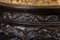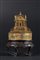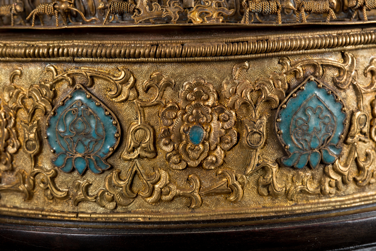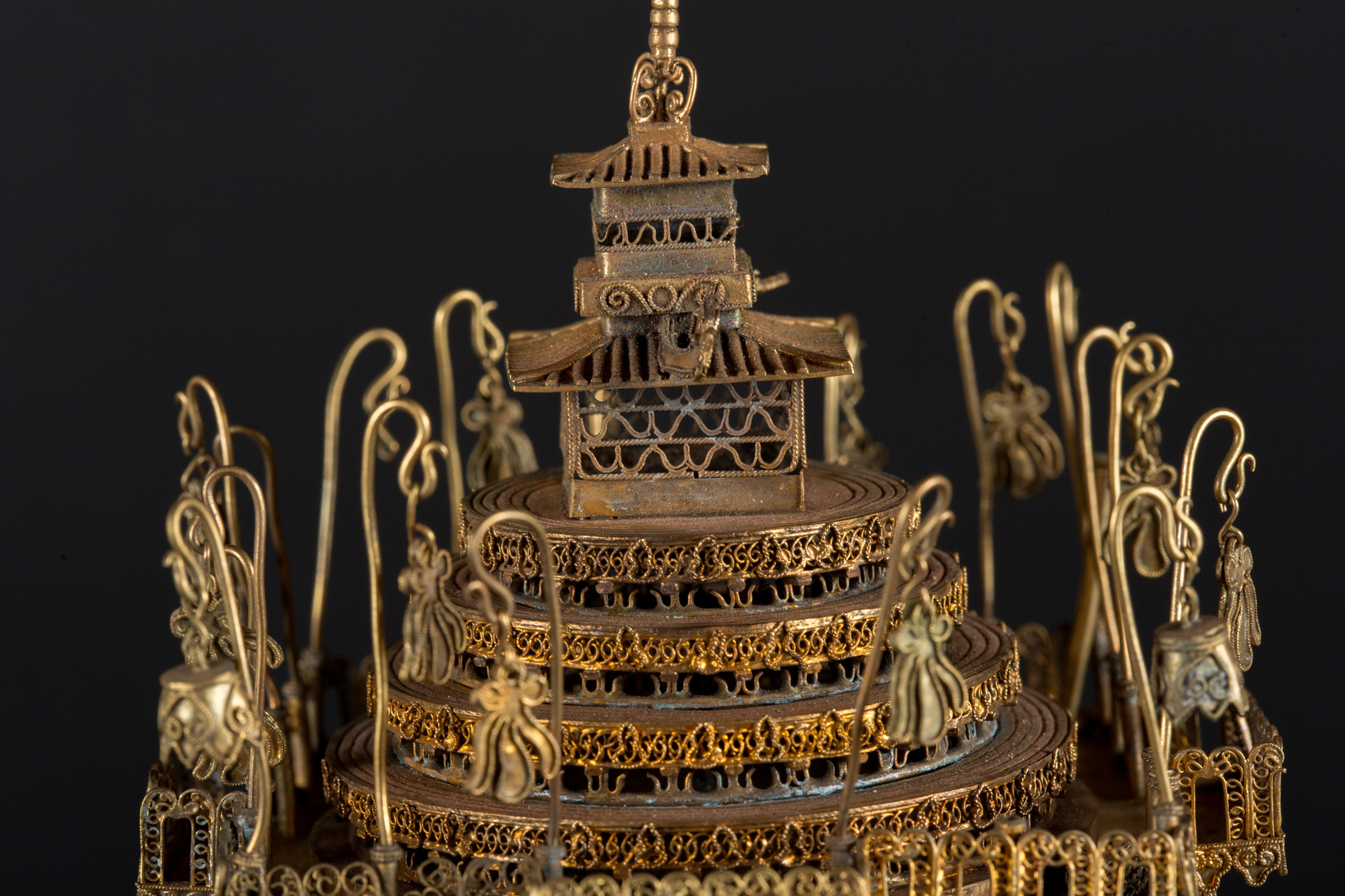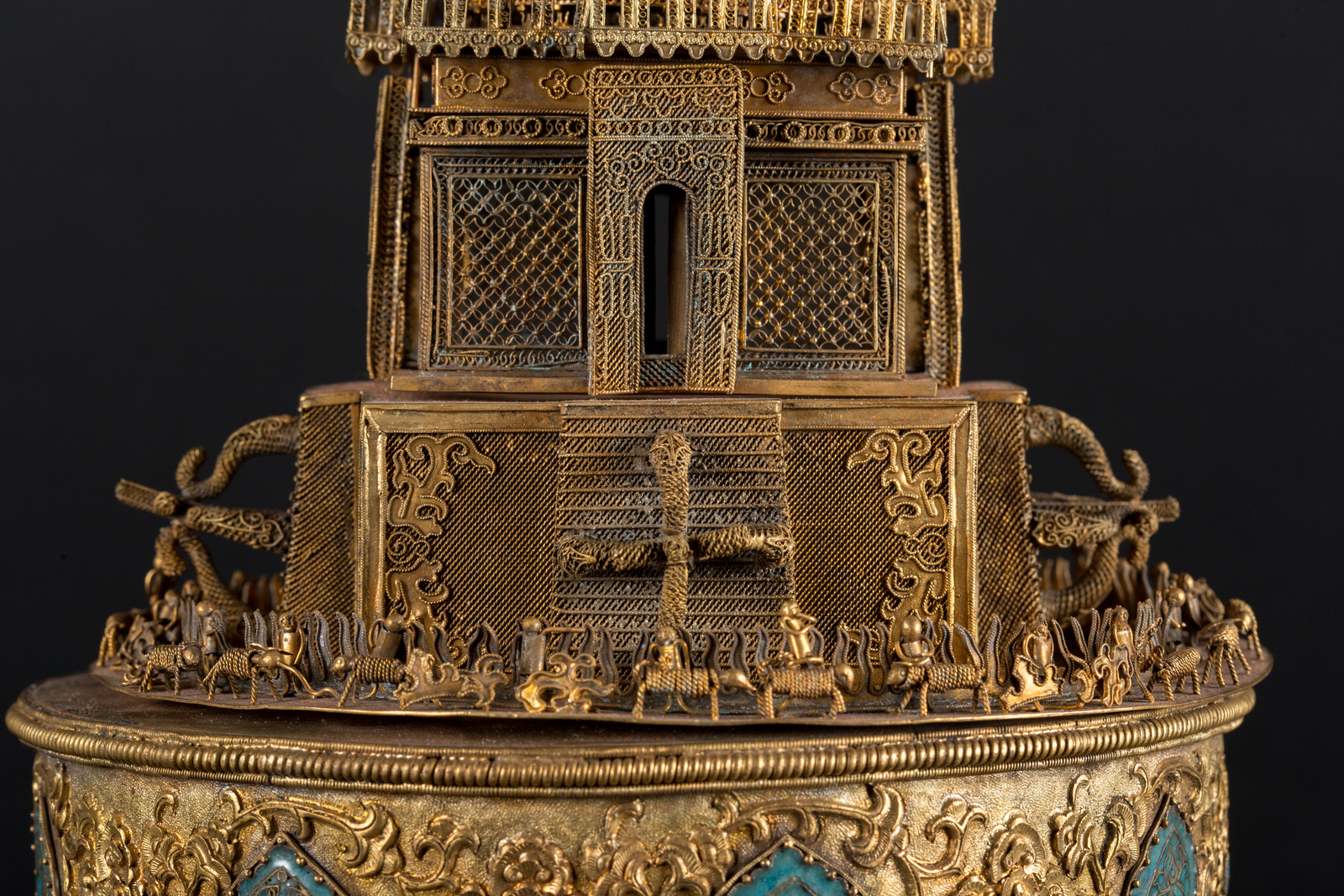 China, Qing dynasty. . Cm 32,00. In the structure formed by the complex lacework on four main levels, it is possible to notice an intricate interplay of small human and animal figures in a procession around the building. The lower level, with a circular base, is characterized by an embossed vegetal decoration with insertions in blue cloisonné, while in the higher level, a lacework vajra end sticks out from each of the four sides of the mandala. The small pagoda at the top is surrounded by fluttering banners. Worthy of notice is the fine lacework characterizing the whole item, and the exquisite working of the base in precious hardwood.