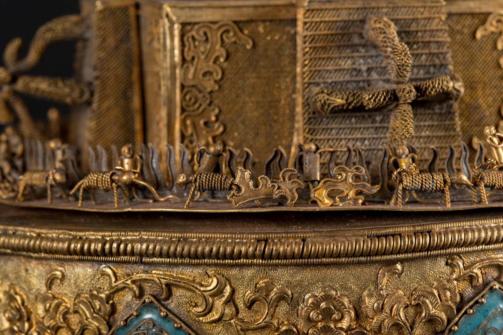 Arte Cinese Mandala in forma di tempio in filigrana d'argento dorato con base...