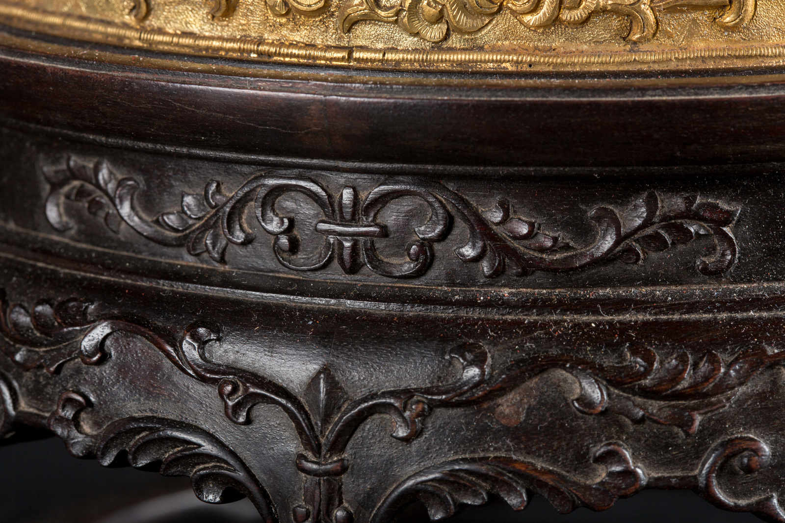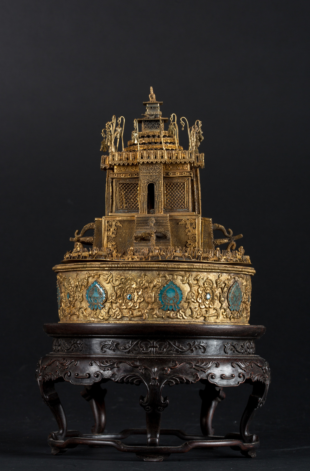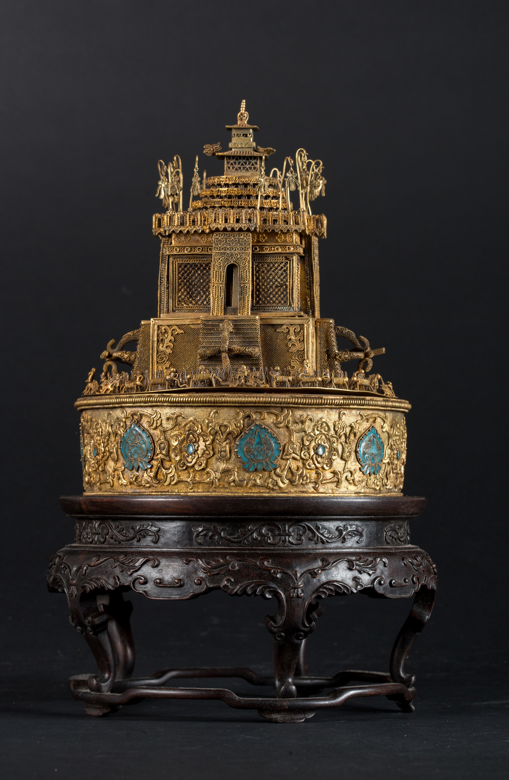 Arte Cinese A gilt silver filigree mandala in the shape of a temple on a Zitan wooden stand
