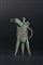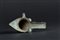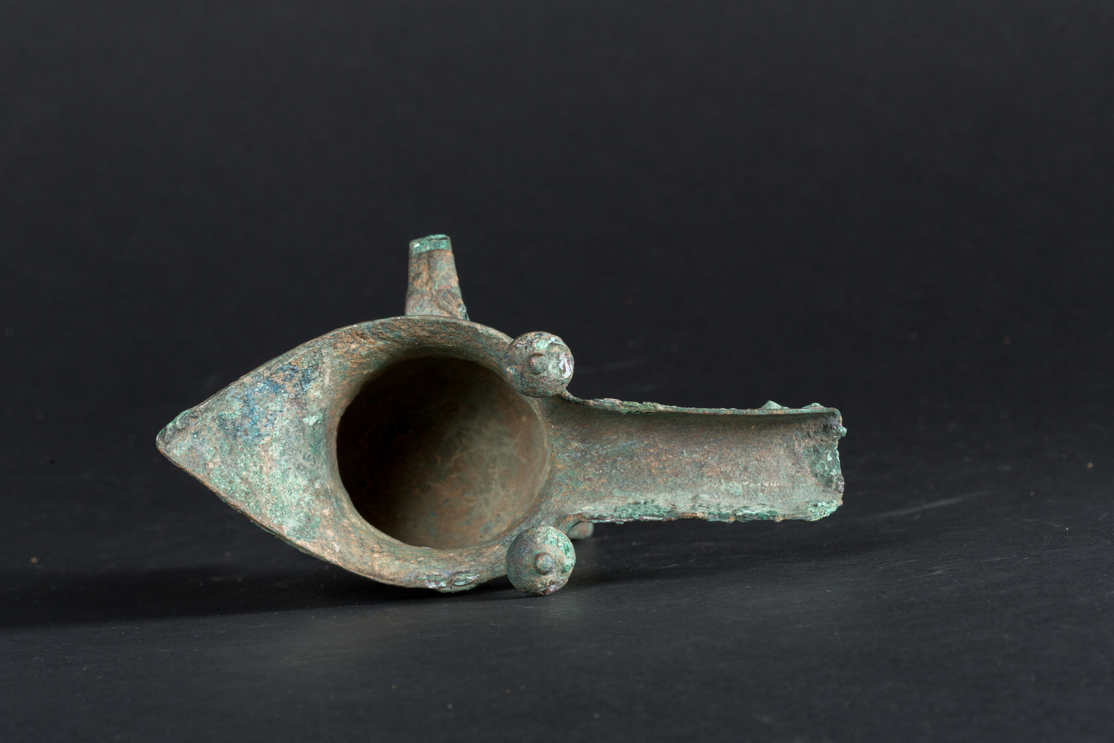 Cina, dinastia Shang, XII - XI secolo AC. -. Cm 11,30 x 24,00. Poggiante su tre supporti a forma di lama, il corpo reca una fascia di maschere taotie su sfondo geometrico ed una coppia di piccoli pali con cappuccio che si innalzano dal bordo superiore. Patina verde coerente con la datazione su tutto l'oggetto. L'oggetto reca un'iscrizione arcaica, poco intellegibile, sul corpo in corrispondenza dell'ansa.