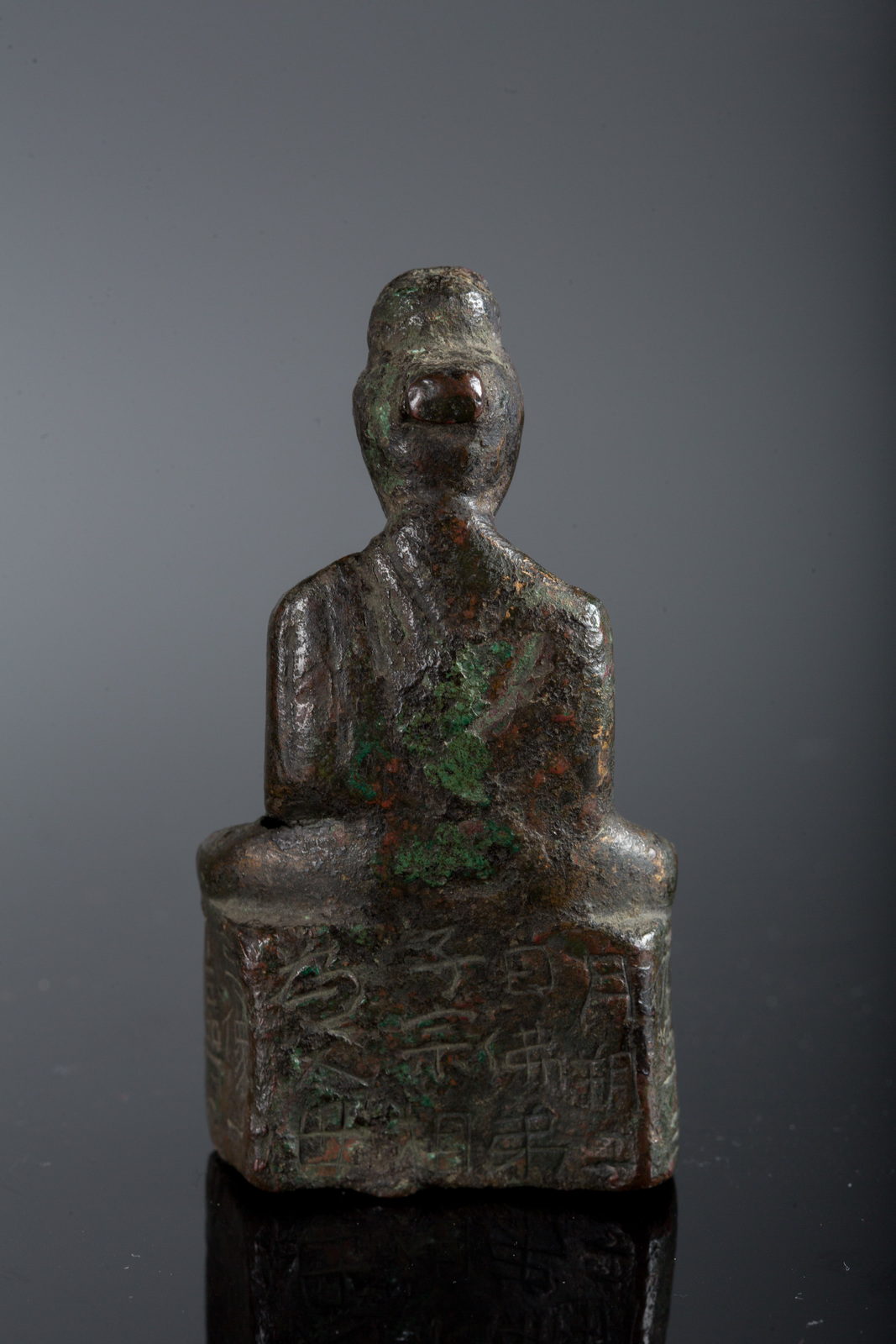 Cina, dinastia Ming . -. Cm 4,00 x 8,00 x 2,00. Raffigurante un personaggio seduto in dyanasana, il retro reca iscrizioni con una data generica e la dicitura che lo identifica come un discepolo di Buddha.