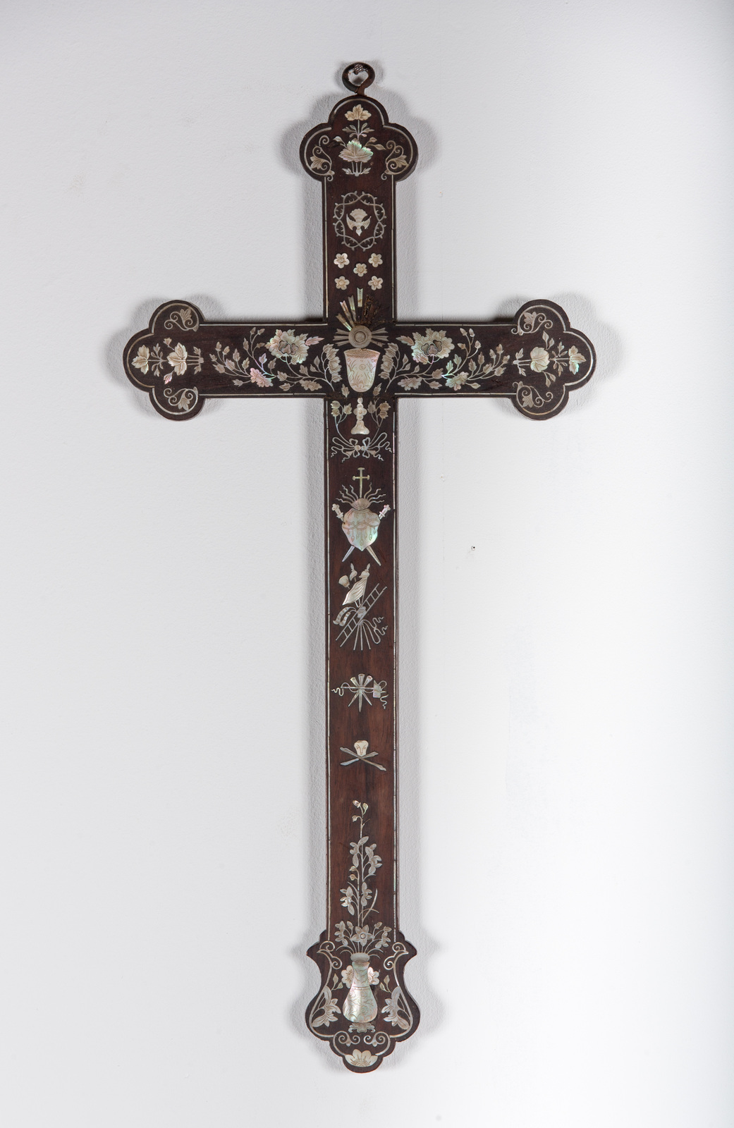 Arte Cinese Croce apostolica in legno intarsiato in madreperla Cina, dinastia...