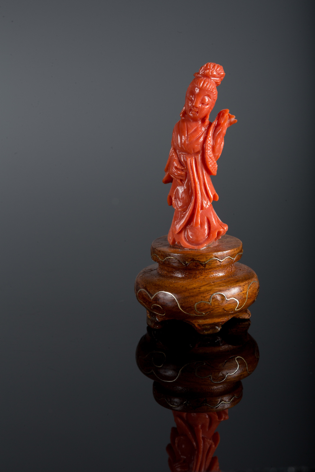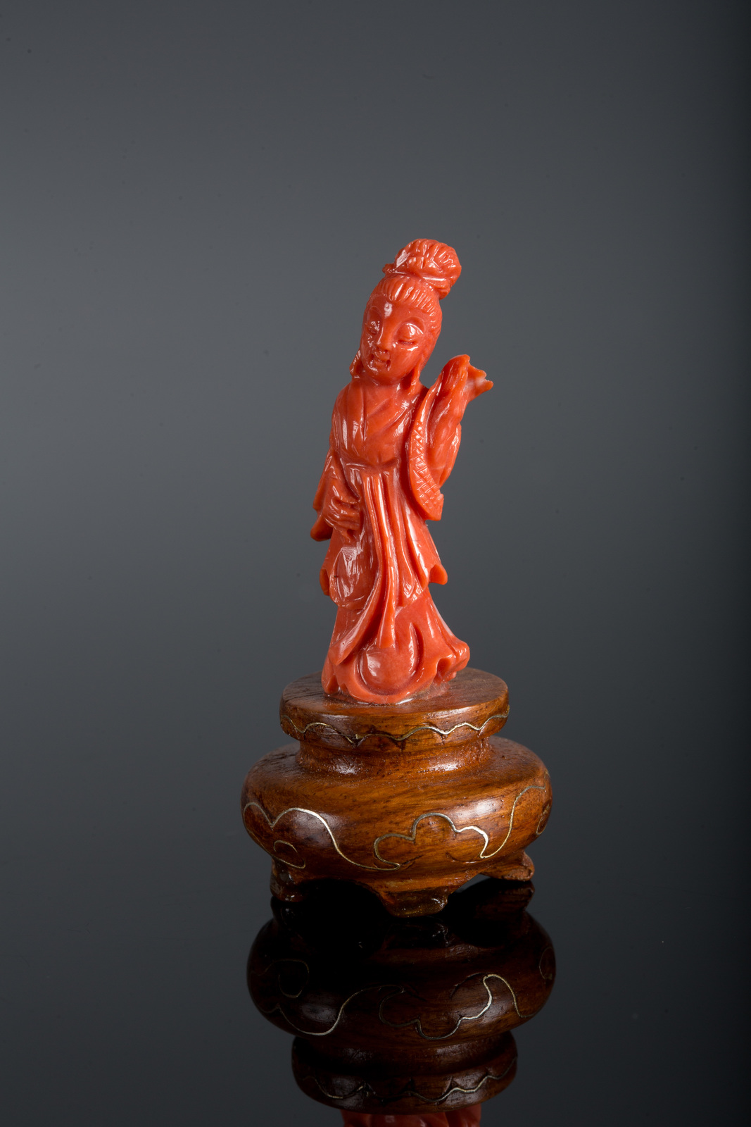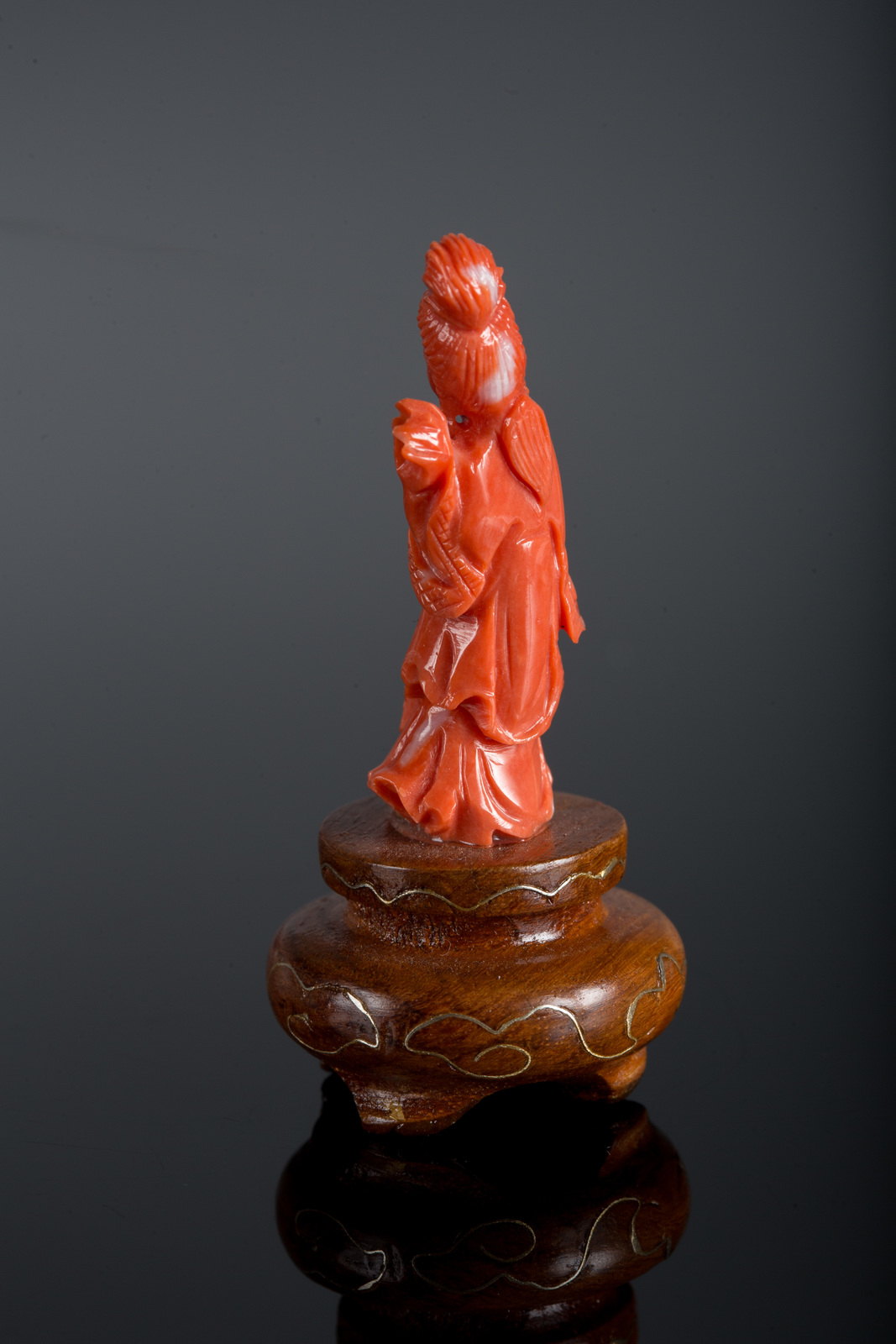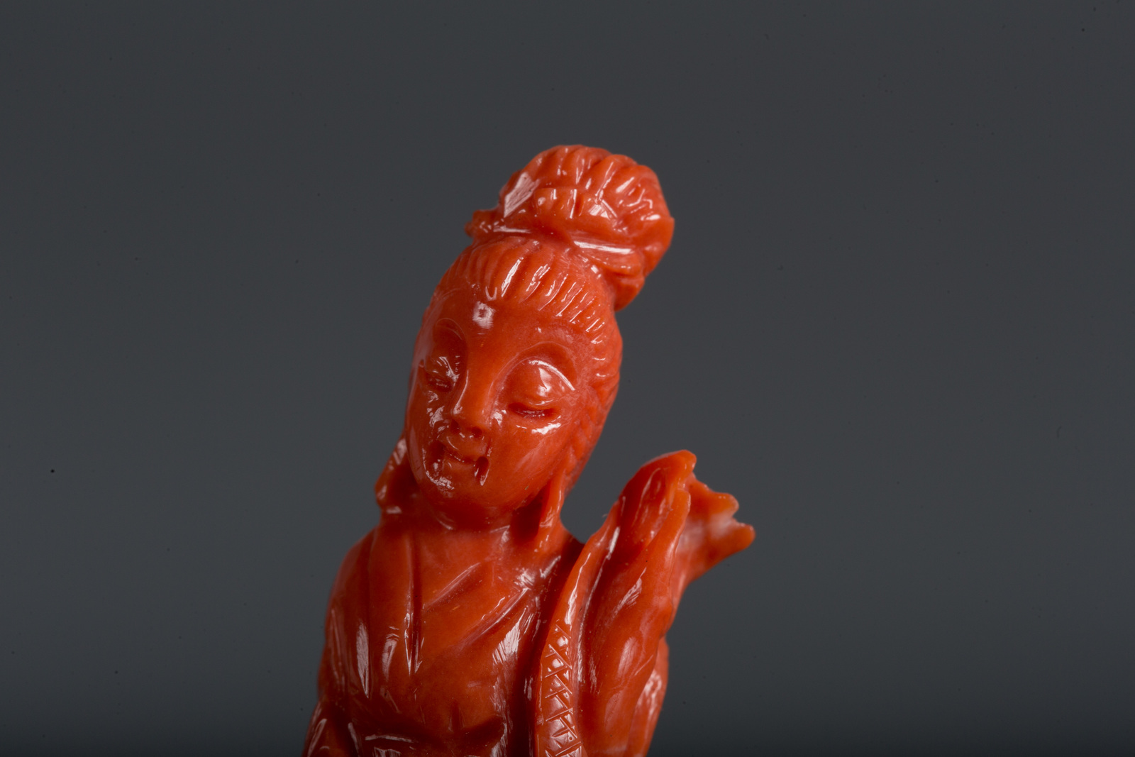 Arte Cinese Piccola scultura in corallo raffigurante Guanyin