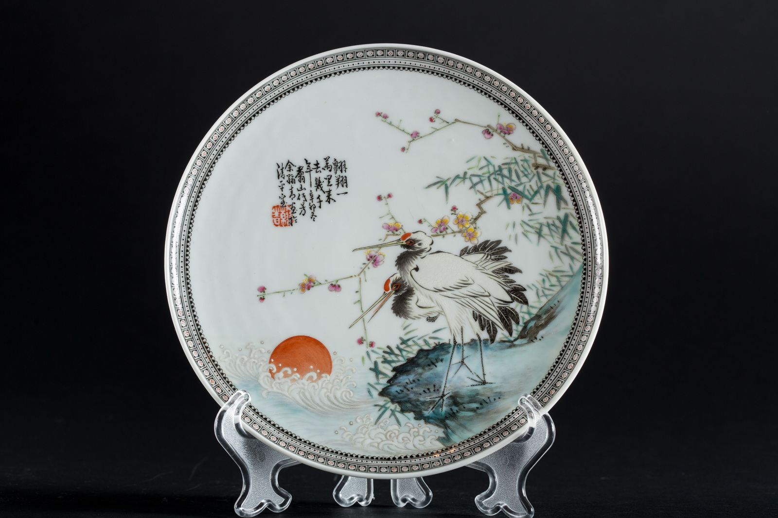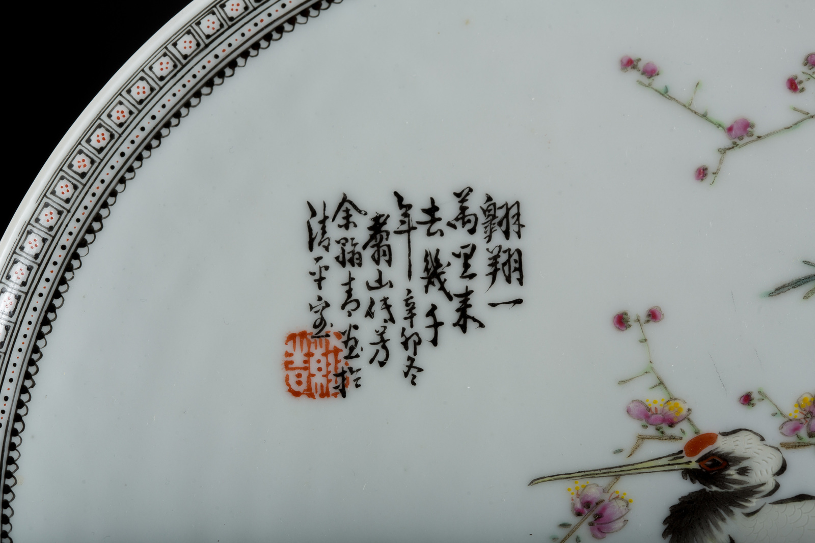 Arte Cinese Piatto in porcellana decorato con aironi, stampi ed iscrizioni