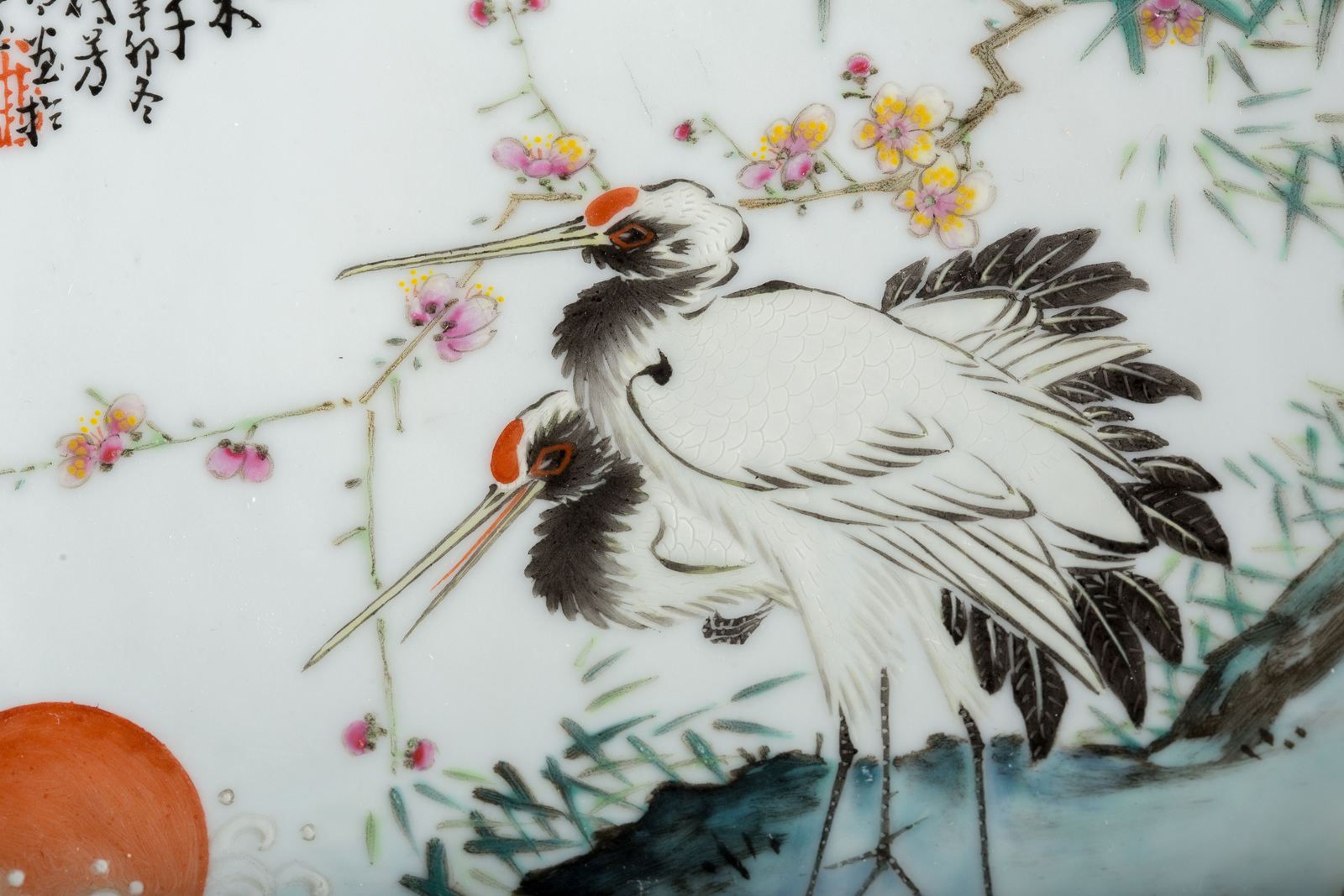 Arte Cinese A porcelain dish decorated with herons, blossoming branches, marks and poetry inscriptions
