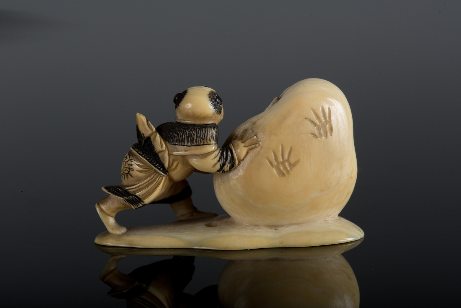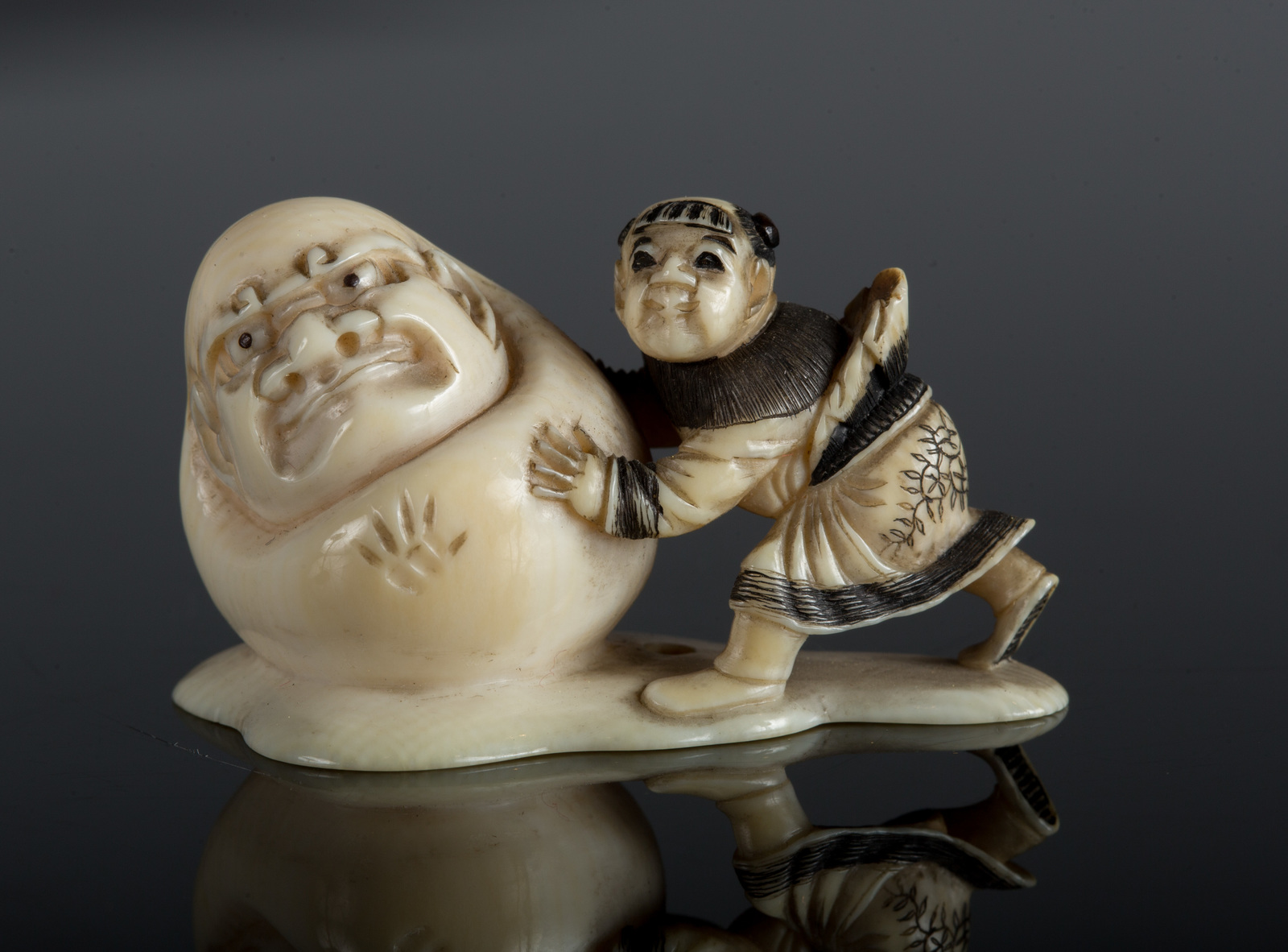 Arte Giapponese Netsuke in avorio raffigurante un bambino che spinge Daruma....