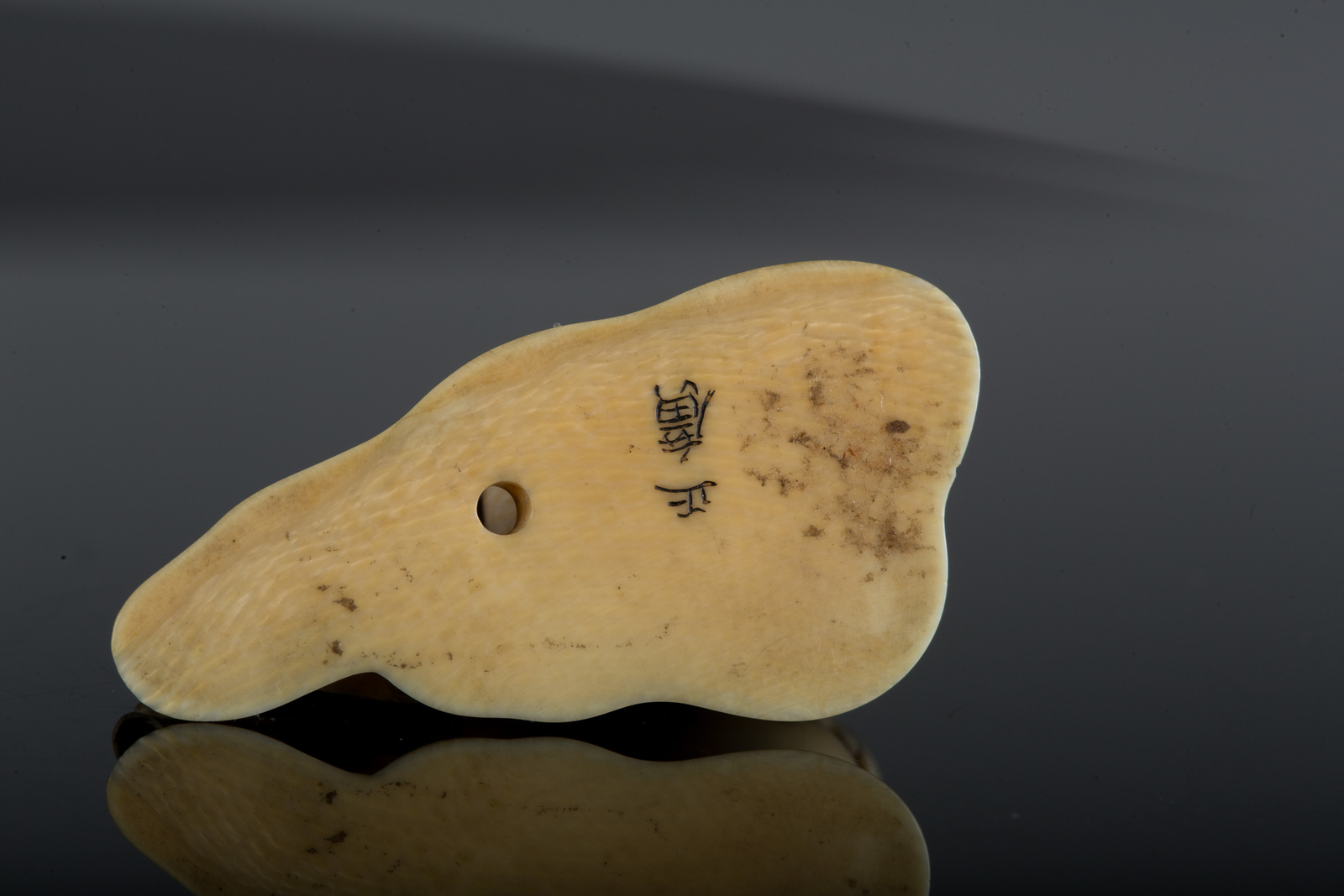 Arte Giapponese Netsuke in avorio raffigurante un bambino che spinge Daruma. Firmato Masa-Hiro