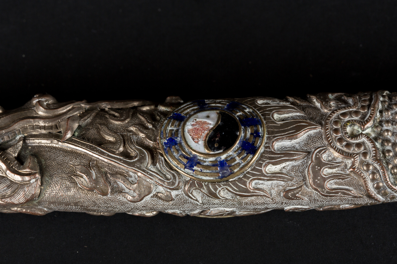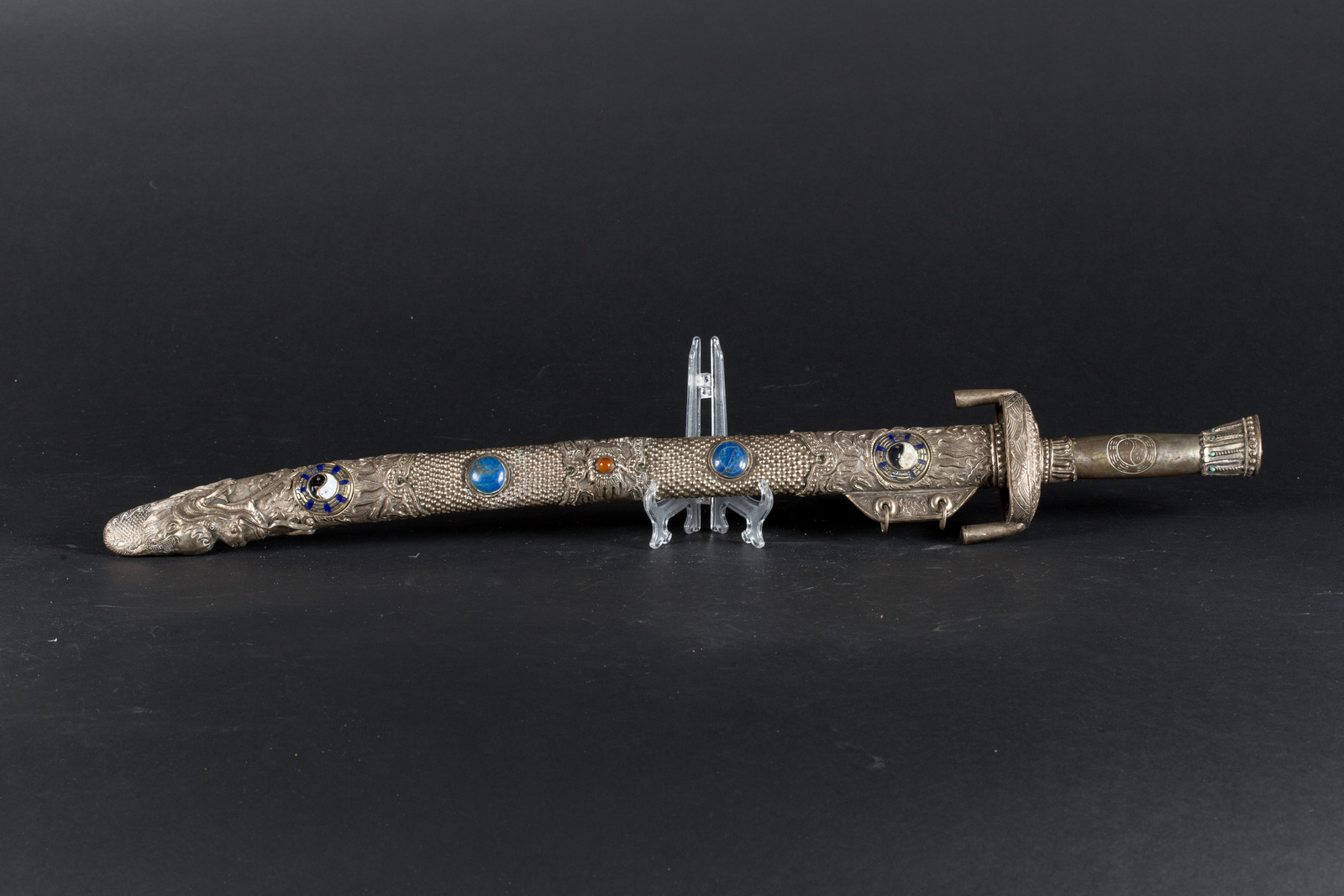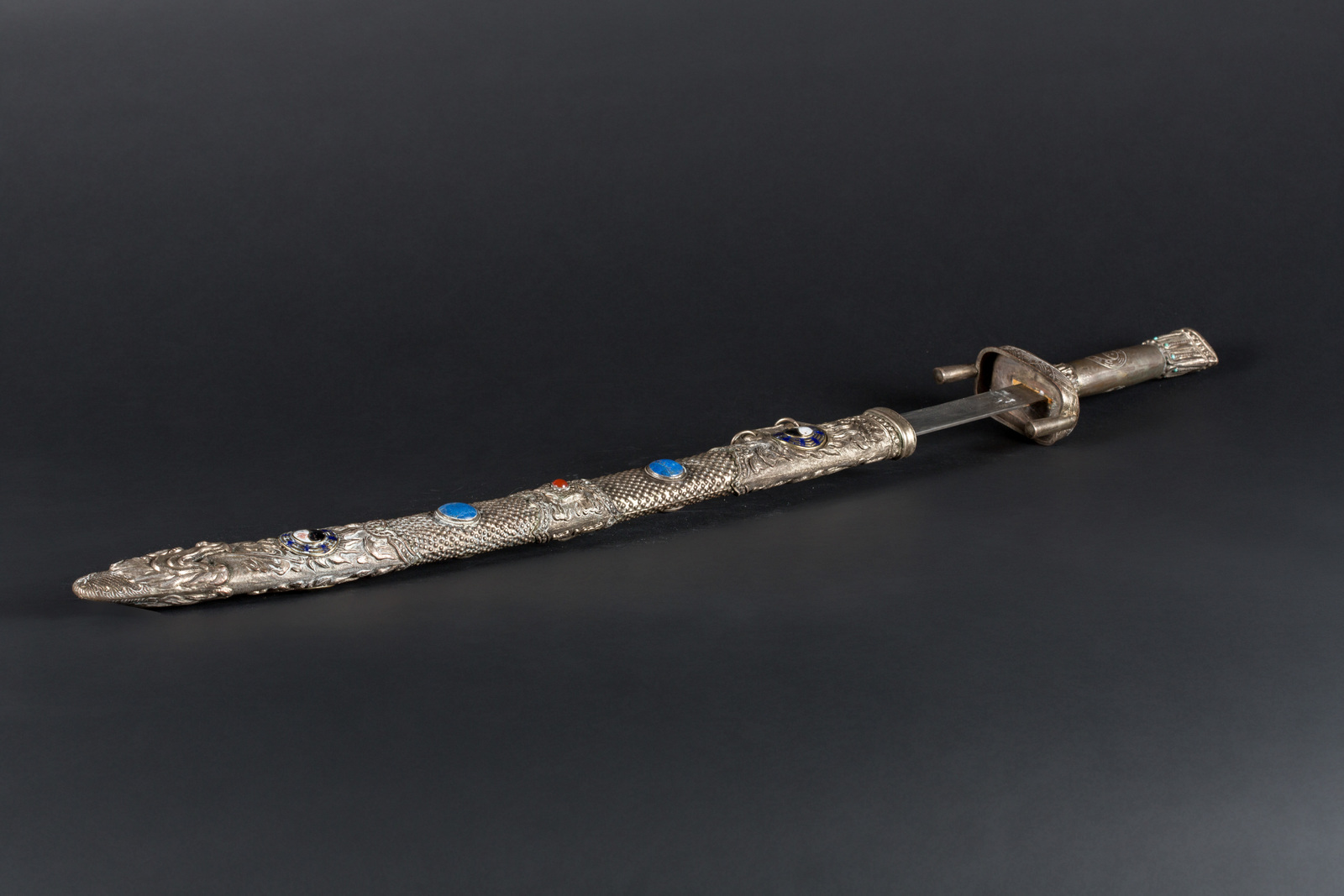 Mongolia, fine XIX - inizi XX secolo . -. Cm 75,00. Lama in acciaio, ricurva a filo singolo; impugnatura con incisione ying a yan, finale incastonato con turchesi e guarda mano con due pendenti fissi e incisioni a tema marino. L'elaborato fodero prevede castoni con lapislazuli e corniole o paste vitree su fondo puntinato o fiammeggiante, terminante con dragone a fauci aperte.